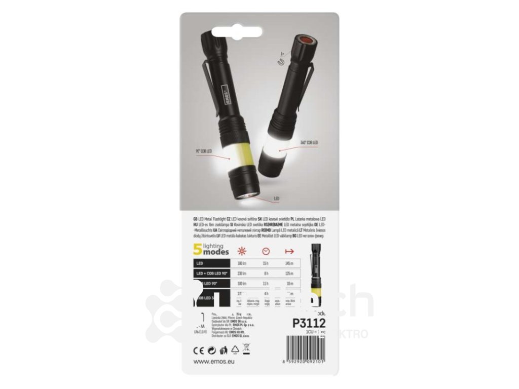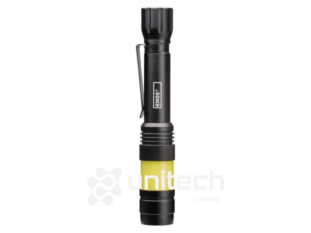 batérie súčasťou balenia: nie|doba nabíjania: neuvádza sa|doba svietenia: 4–15 h|doba svietenia detail: LED – 15 h , LED + COB LED 90° – 8 h, COB LED 90° – 11 h, COB LED 360° – 4 h|dosvit: LED – 145 m, LED + COB LED 90° – 125 m, COB LED 90° – 10 m, COB LED 360° – 10 m|farba: čierna|fokus: nie|hmotnosť: 108 g|LED indikácia nabíjania: neuvádza sa|LED indikácia stavu akumulátora: neuvádza sa|materiál: hliník|maximálny dosvit: 145 m|maximálny svetelný tok: 270 lm|nabíjací: nie|napájanie: 2× AA|nárazuvzdornosť: áno|počet režimov svietenia: 5|predajný obal: 1 ks, papierový blister|príslušenstvo: neuvádza sa|režimy: LED, LED + COB LED 90°, COB LED 90°, COB LED 360°, COB LED 360° blikanie|rozmer: 171 × 30 × 30 mm|špeciálna funkcia: neuvádza sa|svetelný tok: LED – 180 lm, LED + COB LED 90° – 230 lm, COB LED 90° – 100 lm, COB LED 360° – 270 lm|typ batérie: LR6 (1,5 V)|typ napájacieho konektoru: neuvádza sa|vodeodolná: áno (IP44)|vybavenie: klip, 1 × magnet|záručná doba: 2 roky|zdroj svetla: COB LED + LED|značka: EMOSDodatočné parametre