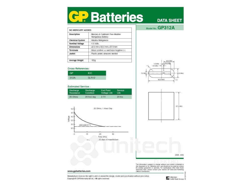 chemické zloženie: alkalické|hmotnosť: 165 g|kapacita: neuvádza sa|kategória/rada: Super Alkaline|max. skladovateľnosť: 3 roky|možnosť nabíjania: nie|napätie: 4,5 V|počet nabíjacích cyklov: nenabíjacie|predajný obal: 1 ks, fólia|prevádzková teplota: -20 °C až +54 °C|rozmer: 62 × 22 × 67 mm|typové označenie: 3LR12 4,5 V (plochá)|veľkosť batérie: 4,5 V|značka: GPDodatočné parametre