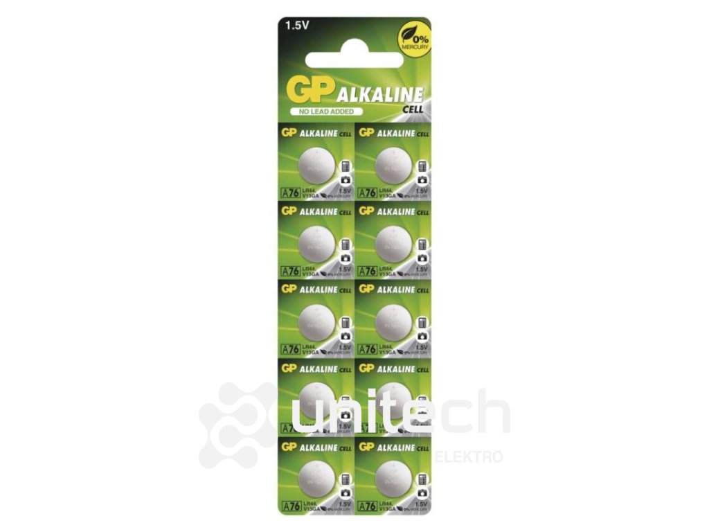 chemické zloženie: alkalické|hmotnosť: 1,7 g|kapacita: 110 mAh (pri záťaži 1,6 kOhm)|kategória/rada: Alkaline cell|max. skladovateľnosť: 3 roky|možnosť nabíjania: nie|napätie: 1,5 V|počet nabíjacích cyklov: nenabíjacie|predajný obal: 10 ks, blister|prevádzková teplota: 0 °C až +45 °C|rozmer: 11,6 × 5,4 mm|typové označenie: GP A76F (AG13, LR44, LR1154, V13GA, PX76A)|veľkosť batérie: neuvádza sa|značka: GPDodatočné parametre