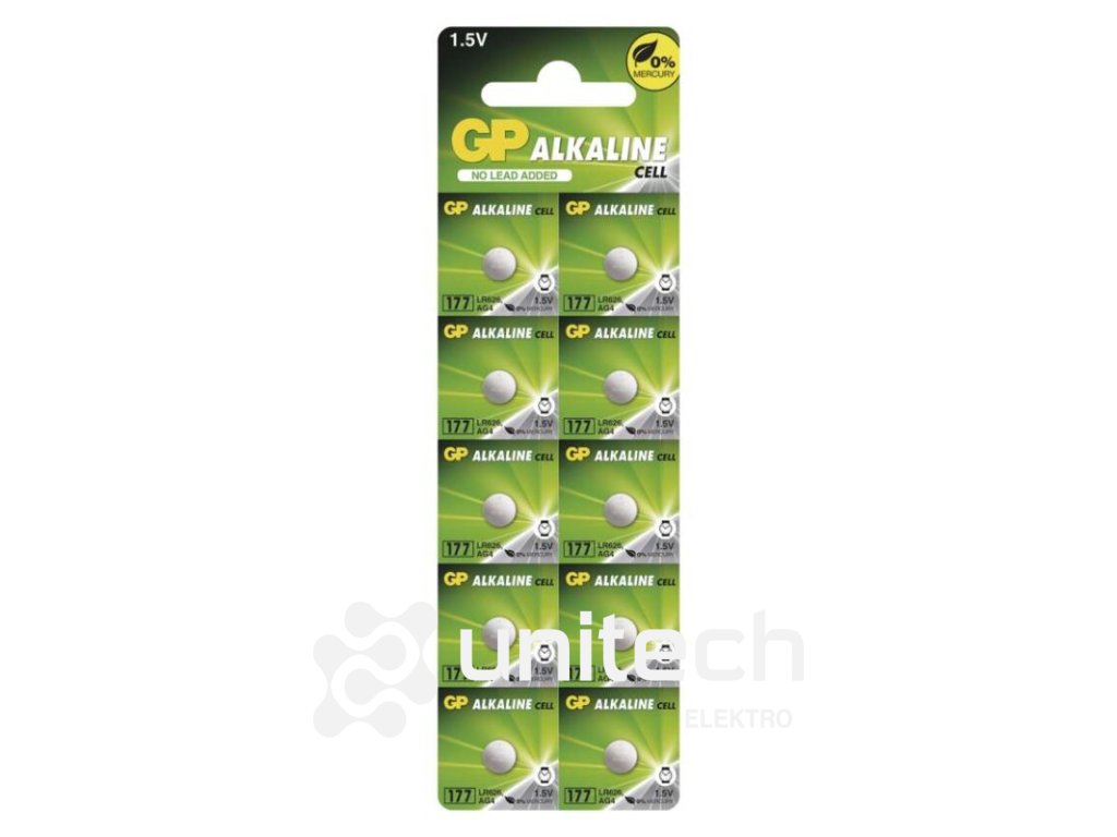 chemické zloženie: alkalické|hmotnosť: 0,4 g|kapacita: neuvádza sa|kategória/rada: Alkaline cell|max. skladovateľnosť: 3 roky|možnosť nabíjania: nie|napätie: 1,5 V|počet nabíjacích cyklov: nenabíjacie|predajný obal: 10 ks, blister|prevádzková teplota: 0 °C až +45 °C|rozmer: 6,8 × 2,6 mm|typové označenie: GP 177F|veľkosť batérie: neuvádza sa|značka: GPDodatočné parametre