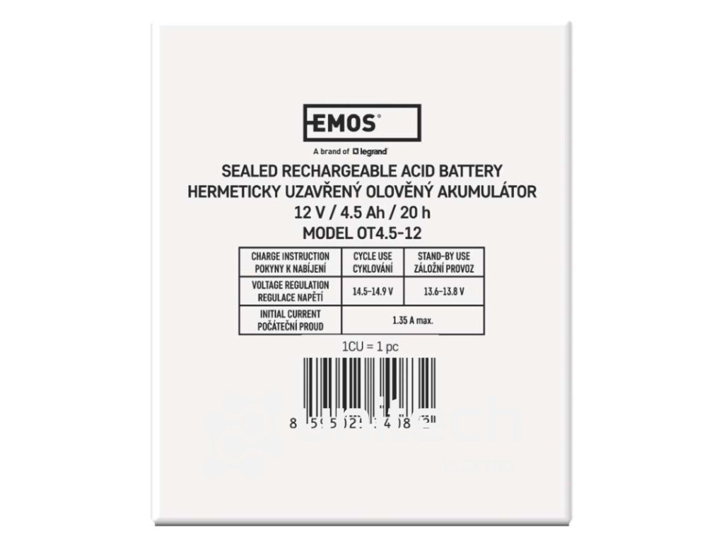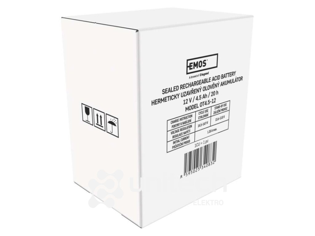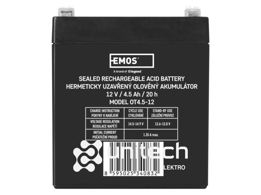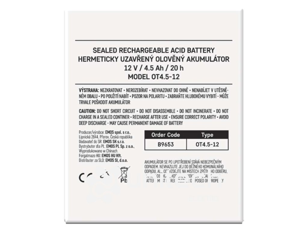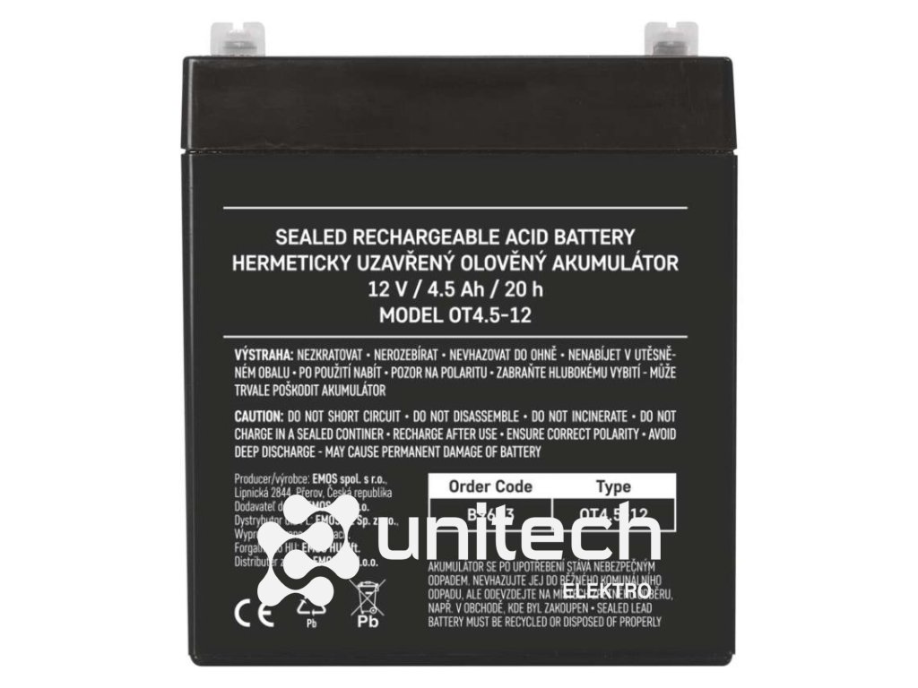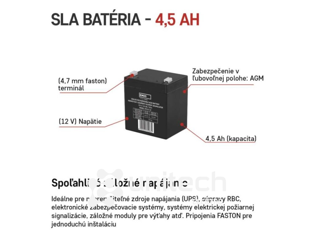 bezúdržbový: áno|chemické zloženie: Pb|EPS (elektronické požiarne systémy): áno|EZS (elektronické zabezpečovacie systémy): áno|hmotnosť: 1,46 kg|kapacita: 4,5 Ah|napätie: 12 V|núdzové osvetlenie: nie|optimálna životnosť: 5 rokov|PARADOX: nie|predajný obal: 1 ks|rozmer: 91 × 71 × 105 mm|technológia: AGM|terminál: faston 4,7 mm|UPS (záložné zdroje): áno|ÚSTREDNE JABLOTRON JA100K: nie|ÚSTREDNE JABLOTRON JA106K: nie|ÚSTREDNE JABLOTRON JA106K(R): nie|ÚSTREDNE JABLOTRON JA82K: nie|ÚSTREDNE JABLOTRON JA83: nie|záložné batérie pre výťahy - osvetlenie, hovor: ánoDodatočné parametre