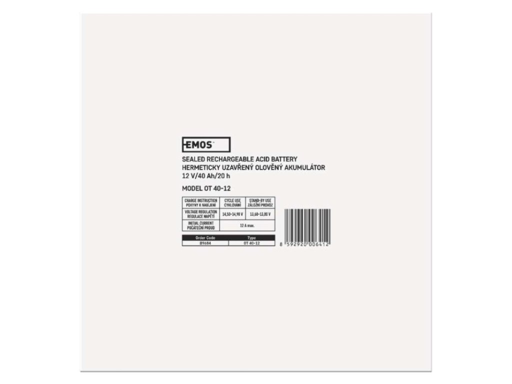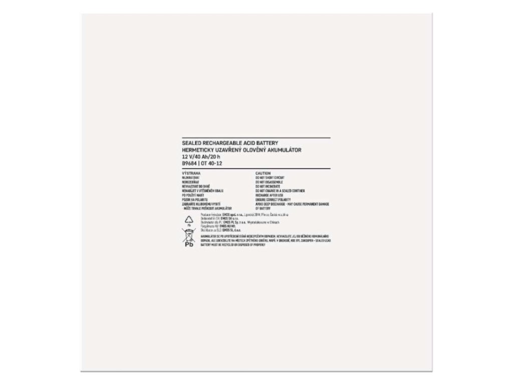 bezúdržbový: áno|chemické zloženie: Pb|EPS (elektronické požiarne systémy): nie|EZS (elektronické zabezpečovacie systémy): nie|hmotnosť: 13,05 kg|kapacita: 40 Ah|napätie: 12 V|núdzové osvetlenie: áno|optimálna životnosť: 5 rokov|PARADOX: nie|predajný obal: 1 ks|rozmer: 196 × 166 × 175 mm|technológia: AGM|terminál: T1 – M6|UPS (záložné zdroje): áno|ÚSTREDNE JABLOTRON JA100K: nie|ÚSTREDNE JABLOTRON JA106K: nie|ÚSTREDNE JABLOTRON JA106K(R): nie|ÚSTREDNE JABLOTRON JA82K: nie|ÚSTREDNE JABLOTRON JA83: nie|záložné batérie pre výťahy - osvetlenie, hovor: nieDodatočné parametre