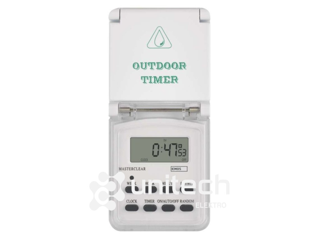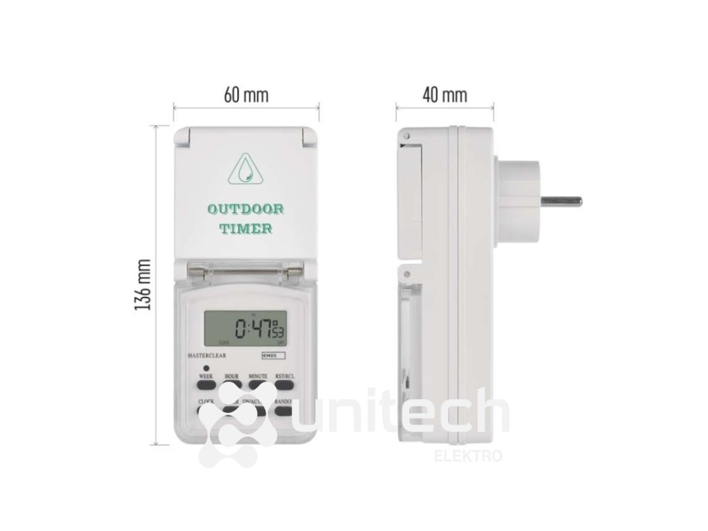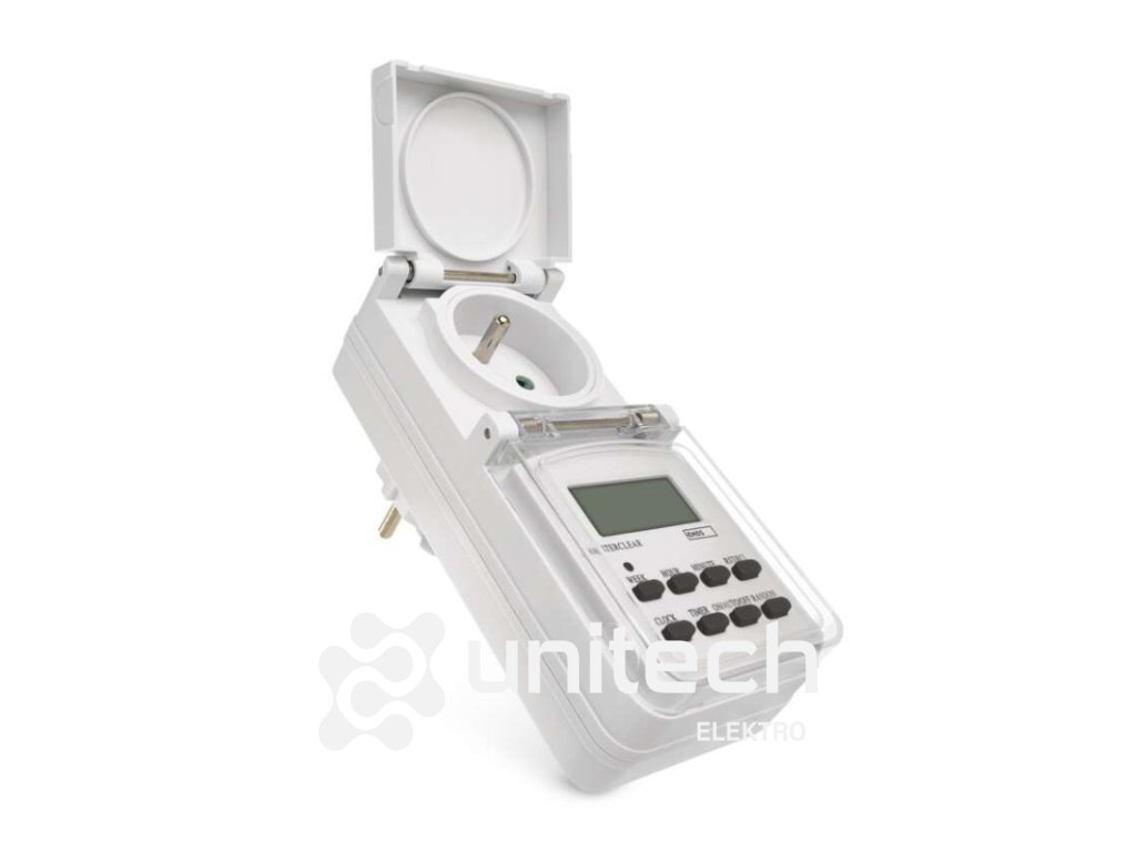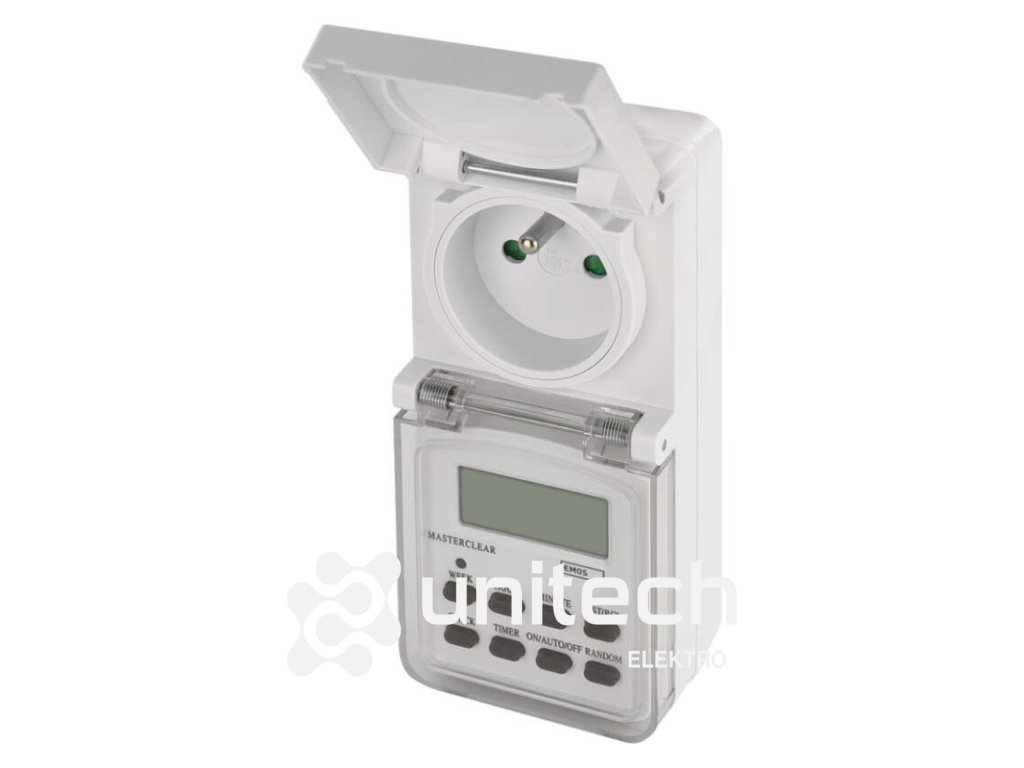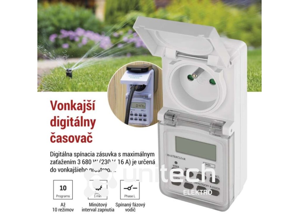 detské clonky: áno|druh: digitálna|funkcia odpočítavania countdown: nie|funkcia zmeny letný/zimný čas: áno|krytie: IP44|max. záťaž: 3 680 W|minimálna doba zopnutia: 1 minúta|možnosť ručného zapnutia: áno|napätie/prúd: 230 V~/16(2) A max.|počet programov: 10|počet spínaní za deň: 10|predajný obal: 1 ks, krabica|rozmer: 60 × 80 × 136 mm|spína: fázový vodič|vonkajšie použitie: áno|záložný akumulátor: 1,2 V; 40 mAh; NiMH (gombíková batéria 1× 1,2 V)Dodatočné parametre