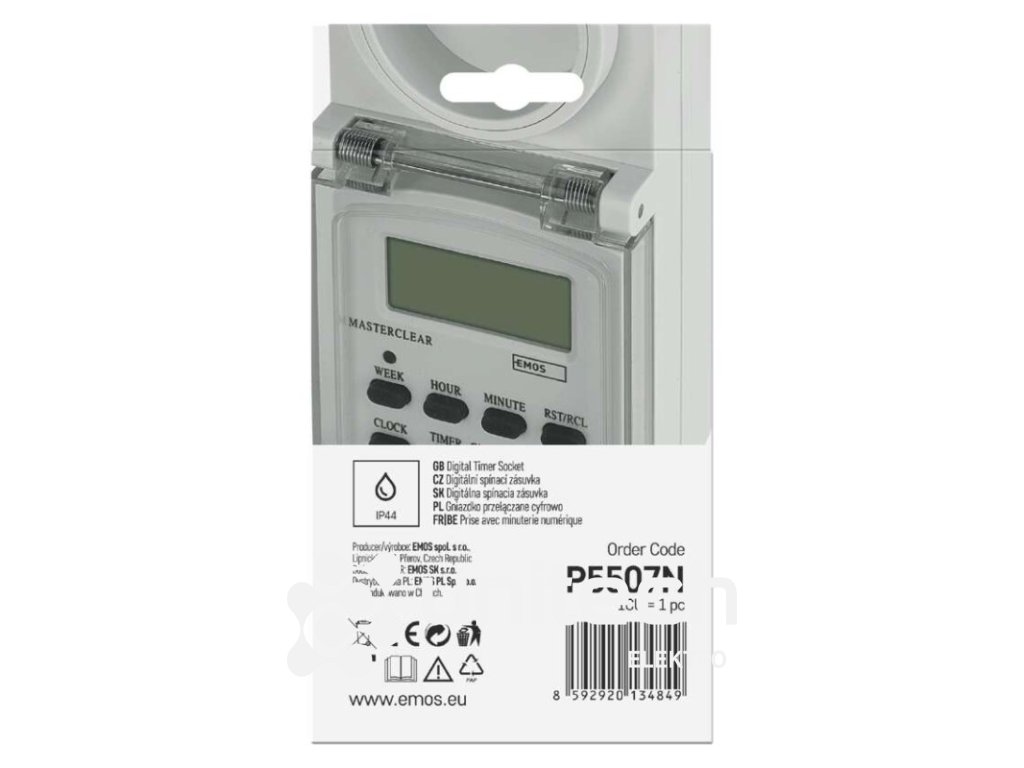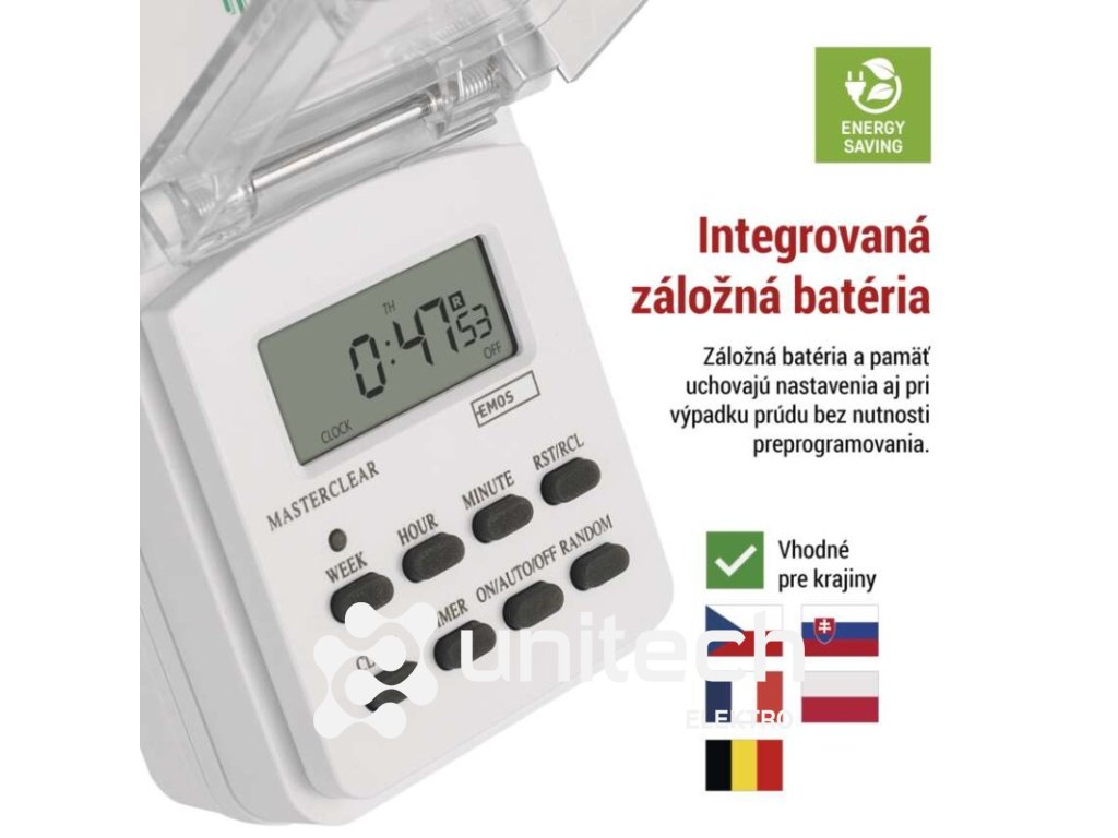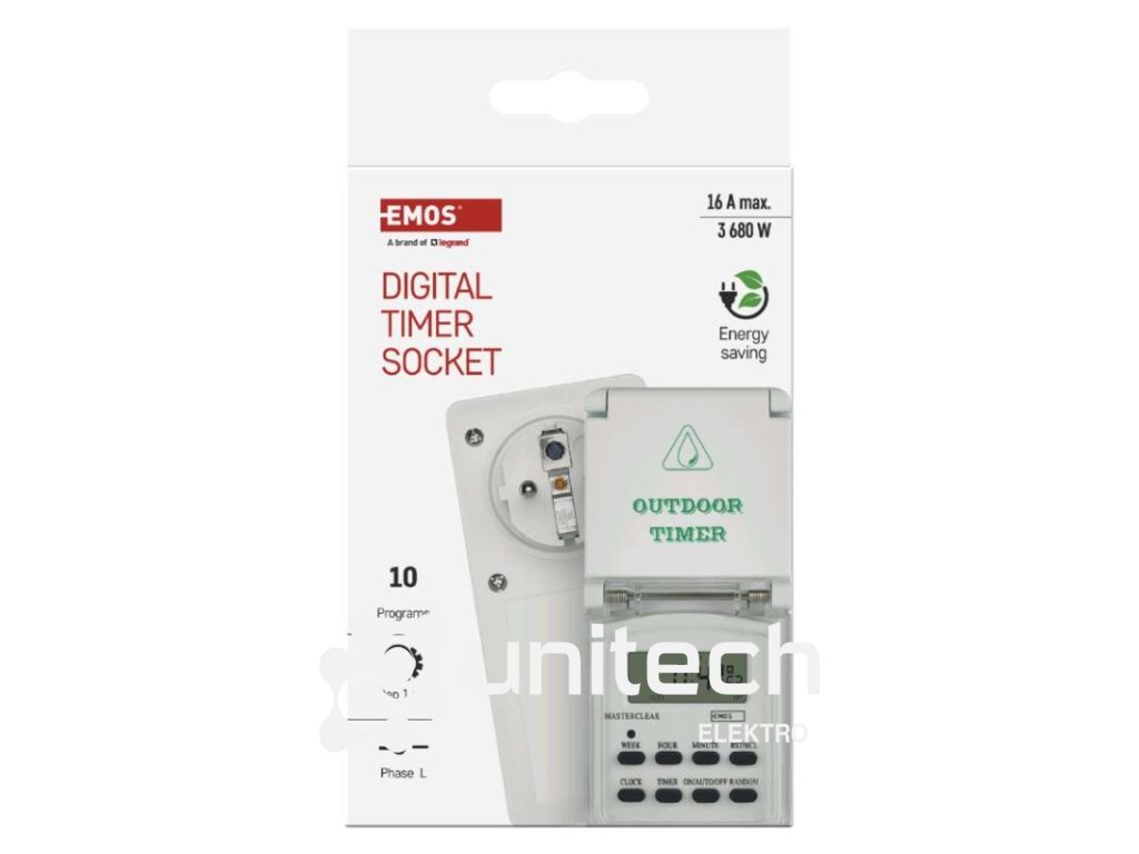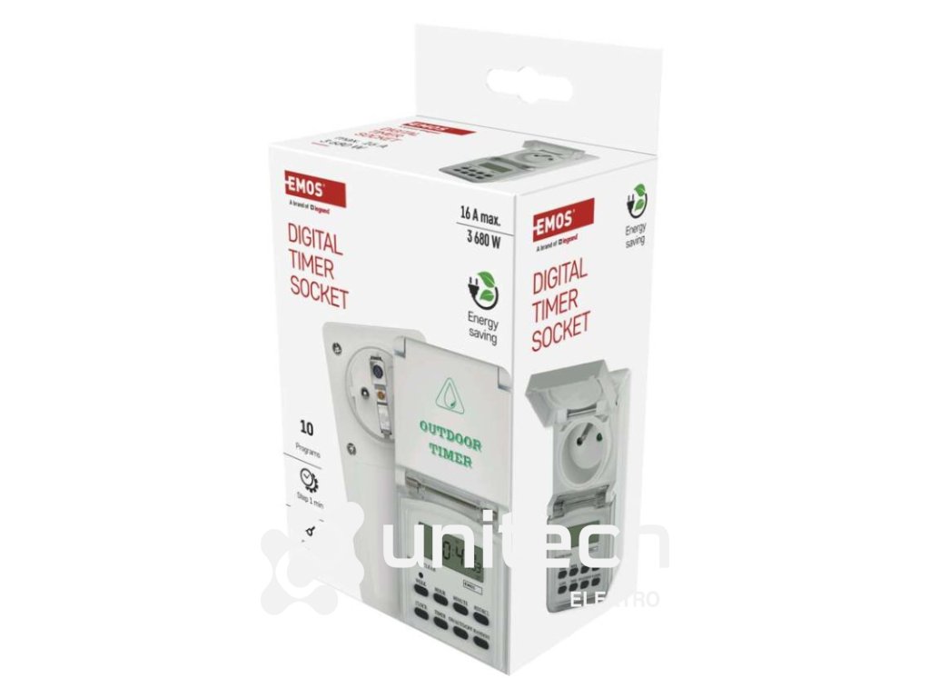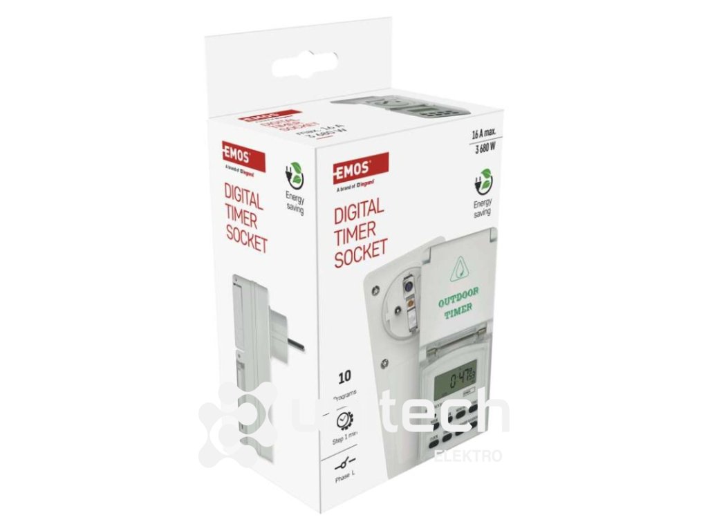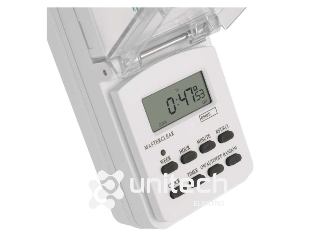 detské clonky: áno|druh: digitálna|funkcia odpočítavania countdown: nie|funkcia zmeny letný/zimný čas: áno|krytie: IP44|max. záťaž: 3 680 W|minimálna doba zopnutia: 1 minúta|možnosť ručného zapnutia: áno|napätie/prúd: 230 V~/16(2) A max.|počet programov: 10|počet spínaní za deň: 10|predajný obal: 1 ks, krabica|rozmer: 60 × 80 × 136 mm|spína: fázový vodič|vonkajšie použitie: áno|záložný akumulátor: 1,2 V; 40 mAh; NiMH (gombíková batéria 1× 1,2 V)Dodatočné parametre