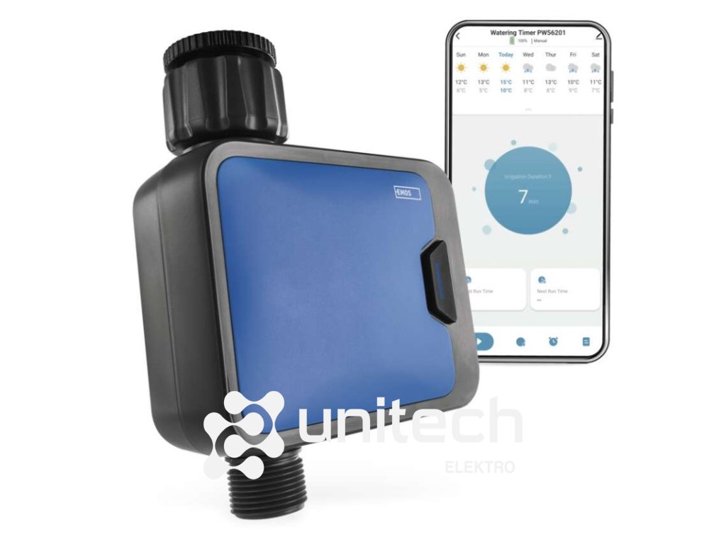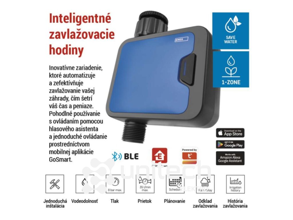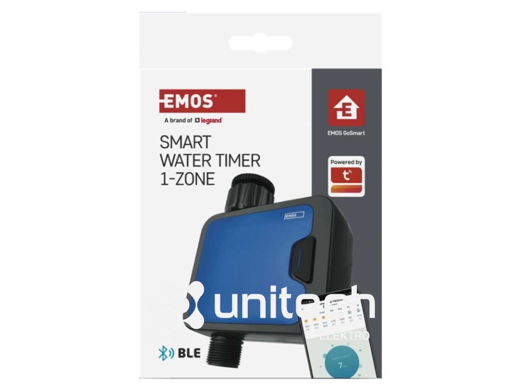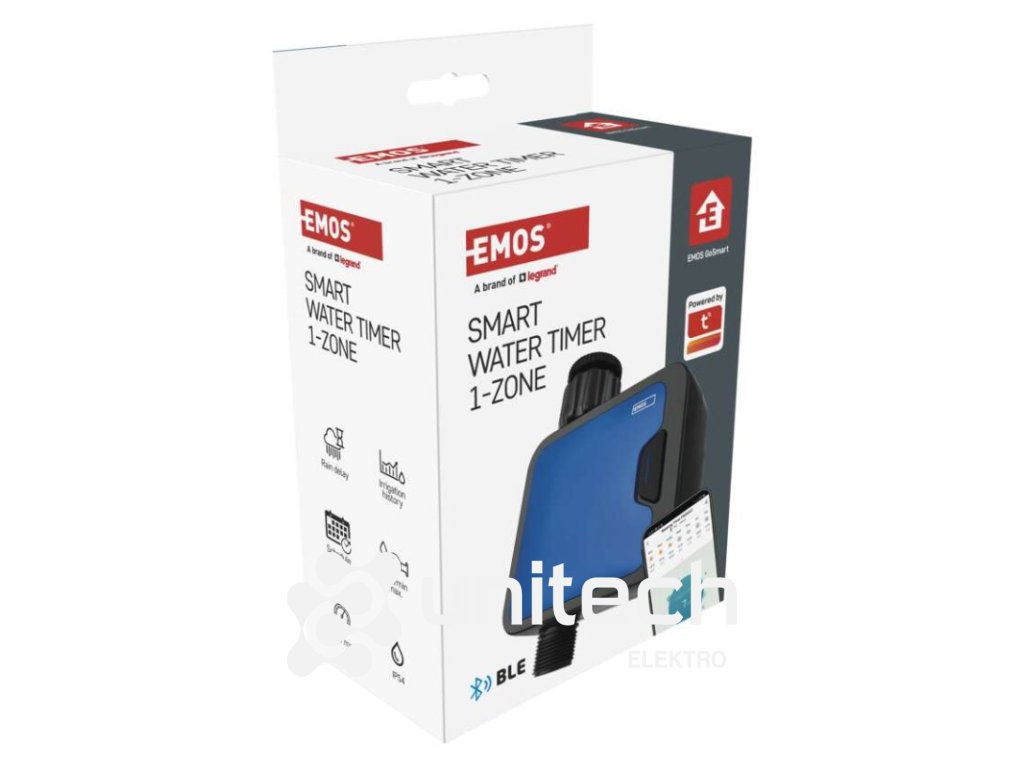 ďalšie funkcie: –|energetická trieda: –|frekvencia zavlažovania: bez limitu|jazyky aplikácie: EN, CZ, SK, PL, DE, HU, SI, FR, + 60 ďalších jazykov|kompatibilita: EMOS GoSmart, TUYA, LIDL, Smartlife, otvorený systém|krytie: IP54|manuálne zavlažovanie: áno|maximálny prietok: 35 l/min|napájanie: 4× 1,5 V AA (nie sú súčasťou balenia)|notifikácie do mobilnej aplikácie: áno|ovládanie hlasovými asistentmi: áno|podporované OS: Android, iOS|predajný obal: 1 ks, krabička|prevádzkový tlak vody: 0,5–8 bar|protokol: Bluetooth 5.0|rada: GoSmart|rozmer: 120 × 160 × 55 mm|trvanie zavlažovania: 1 minuta – 24 hodin|záručná doba: 2 roky|závit: 3/4", 1"|zavlažovacie cykly za deň: bez limituDodatočné parametre