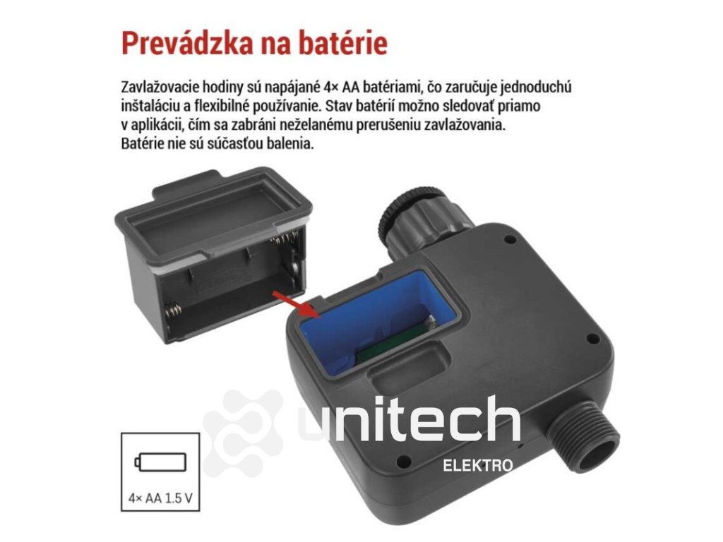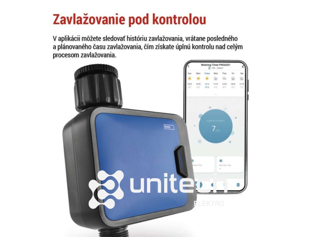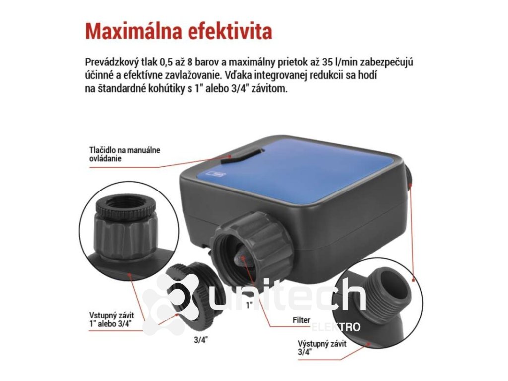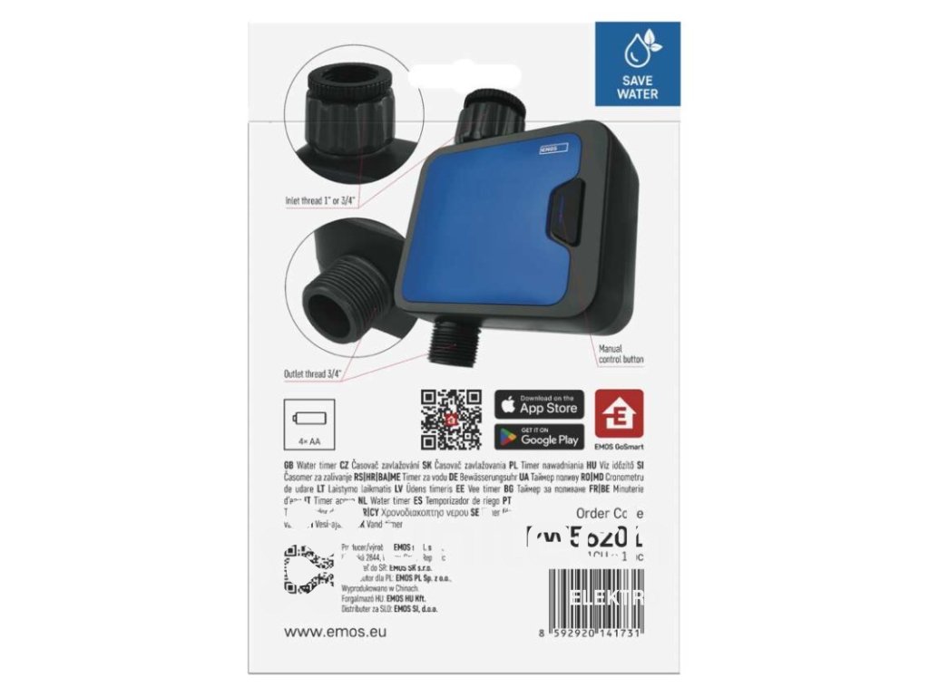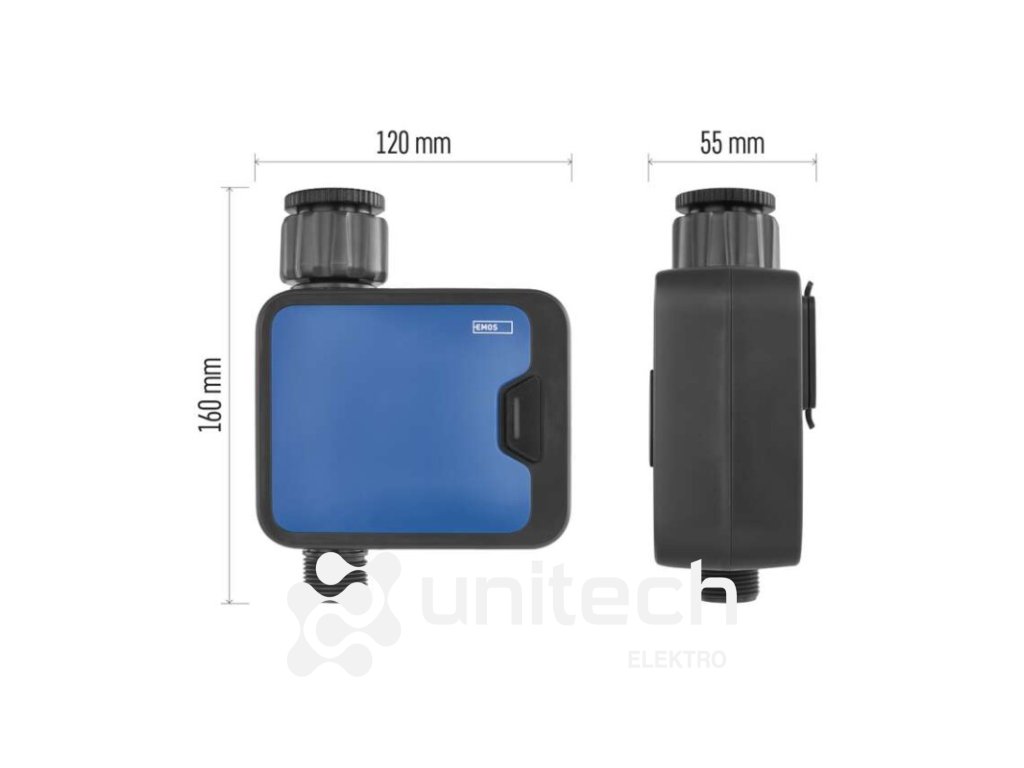 ďalšie funkcie: –|energetická trieda: –|frekvencia zavlažovania: bez limitu|jazyky aplikácie: EN, CZ, SK, PL, DE, HU, SI, FR, + 60 ďalších jazykov|kompatibilita: EMOS GoSmart, TUYA, LIDL, Smartlife, otvorený systém|krytie: IP54|manuálne zavlažovanie: áno|maximálny prietok: 35 l/min|napájanie: 4× 1,5 V AA (nie sú súčasťou balenia)|notifikácie do mobilnej aplikácie: áno|ovládanie hlasovými asistentmi: áno|podporované OS: Android, iOS|predajný obal: 1 ks, krabička|prevádzkový tlak vody: 0,5–8 bar|protokol: Bluetooth 5.0|rada: GoSmart|rozmer: 120 × 160 × 55 mm|trvanie zavlažovania: 1 minuta – 24 hodin|záručná doba: 2 roky|závit: 3/4", 1"|zavlažovacie cykly za deň: bez limituDodatočné parametre