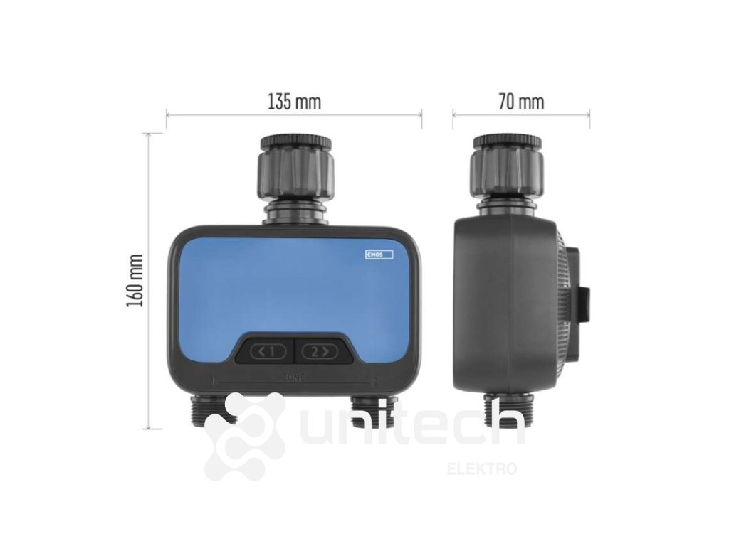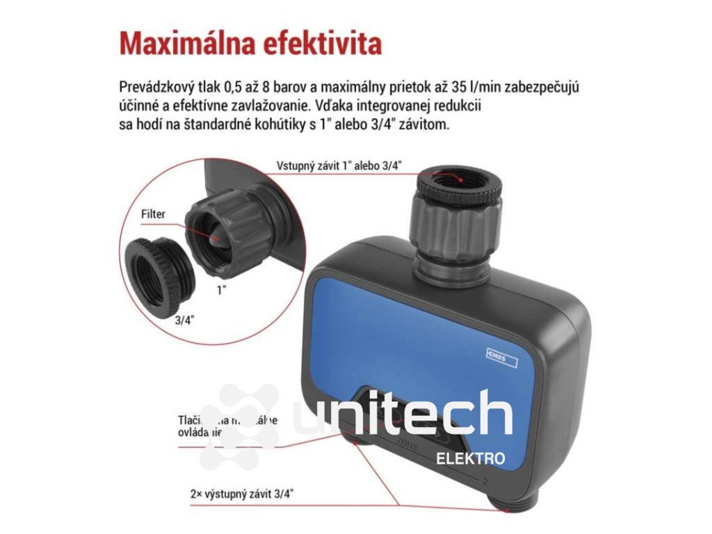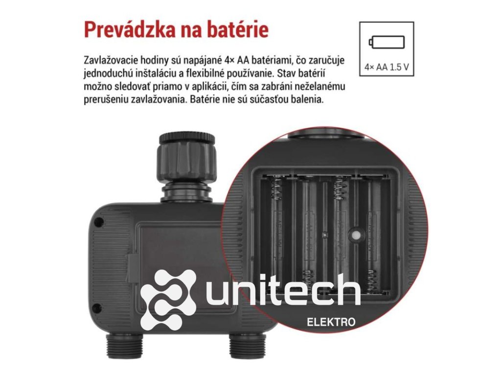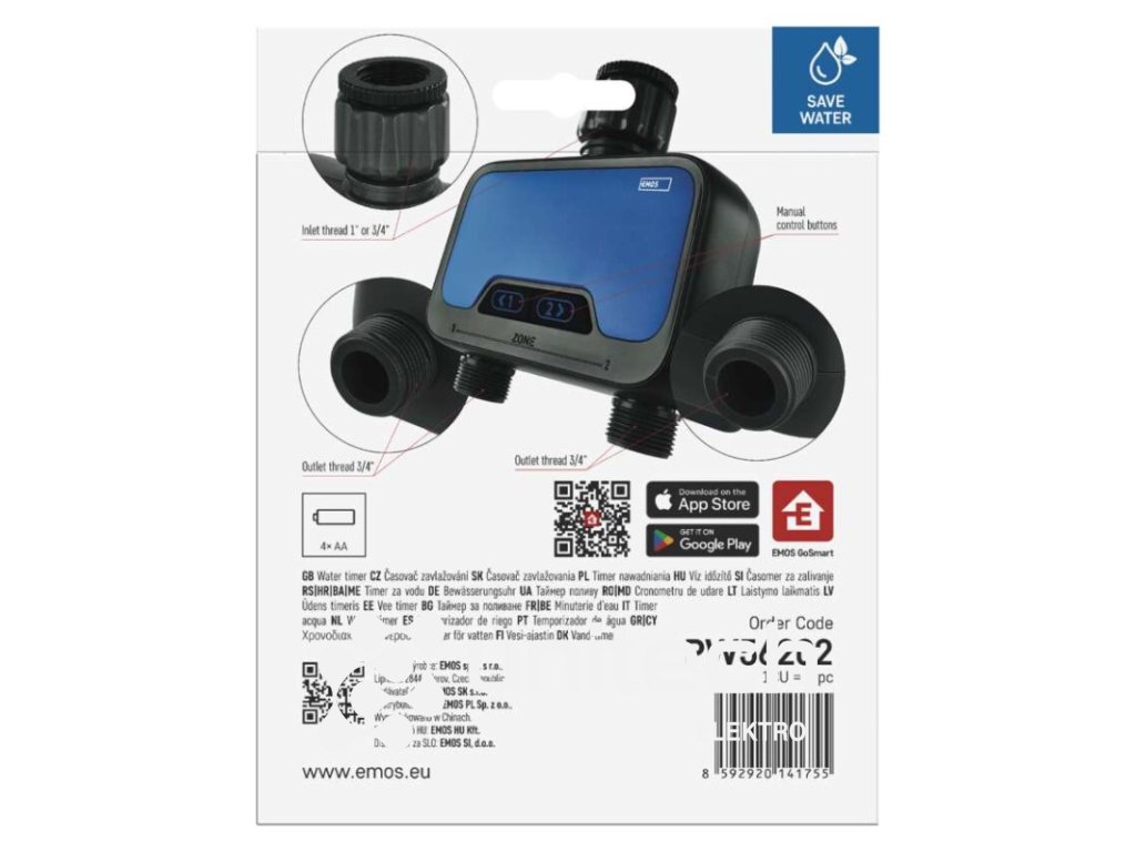 ďalšie funkcie: –|energetická trieda: –|frekvencia zavlažovania: bez limitu|jazyky aplikácie: EN, CZ, SK, PL, DE, HU, SI, FR, + 60 ďalších jazykov|kompatibilita: EMOS GoSmart, TUYA, LIDL, Smartlife, otvorený systém|krytie: IP54|manuálne zavlažovanie: áno|maximálny prietok: 35 l/min|napájanie: 4× 1,5 V AA (nie sú súčasťou balenia)|notifikácie do mobilnej aplikácie: áno|ovládanie hlasovými asistentmi: áno|podporované OS: Android, iOS|predajný obal: 1 ks, krabička|prevádzkový tlak vody: 0,5–8 bar|protokol: Bluetooth 5.0|rada: GoSmart|rozmer: 135 × 160 × 70 mm|trvanie zavlažovania: 1 minuta – 24 hodin|záručná doba: 2 roky|závit: 3/4", 1"|zavlažovacie cykly za deň: bez limituDodatočné parametre