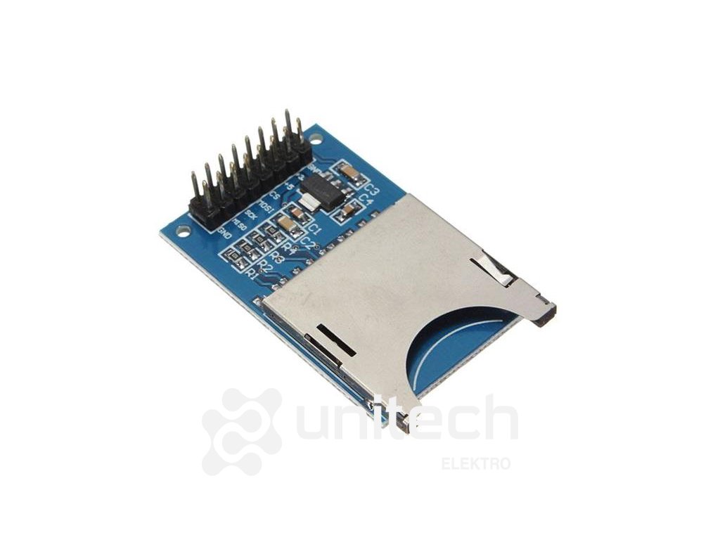 Modul čítačky SD kariet so stabilizátorom napätia na 3,3V, piny GND, 3.3V 5V CS MOSI SCK MISO, umožňuje ukladanie dát z aplikácií na SD kartu. Je ľahko prepojiteľný k Arduino.