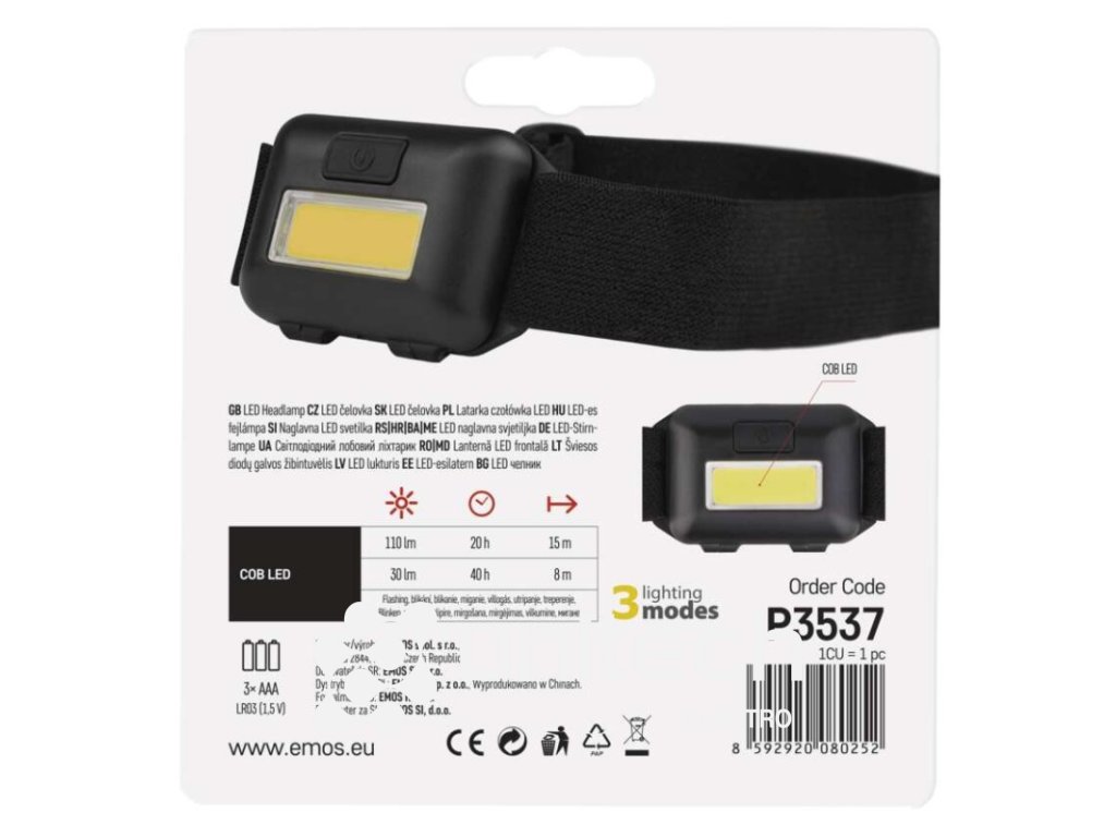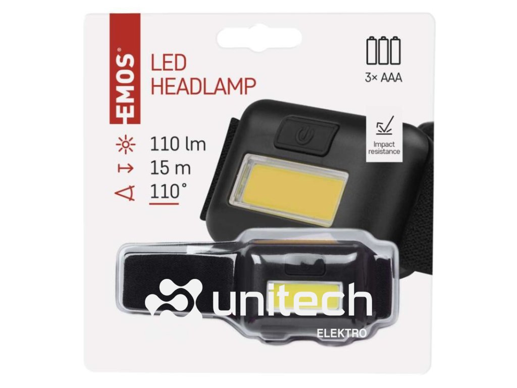 barva: čierna|batérie súčasťou balenia: nie|doba nabíjania: neuvádza sa|doba svietenia: 20–40 h|doba svietenia detail: COB LED 100 % – 20 h, COB LED 50 % – 40 h|dosvit: COB LED 100 % – 15 m, COB LED 50 % – 8 m|fokus: nie|hmotnosť: 21 g/56 g|LED indikácia nabíjania: neuvádza sa|LED indikácia stavu akumulátora: neuvádza sa|materiál: ABS plast|maximálny dosvit: 15 m|maximálny svetelný tok: 110 lm|nabíjací: nie|napájanie: 3× AAA|nárazuvzdornosť: áno|počet režimov svietenia: 3|predajný obal: 1 ks, papierový blister|príslušenstvo: neuvádza sa|reflexný pásik: nie|režimy: COB LED 100 %, COB LED 50 %, blikanie|rozmer: 60 × 18 × 40 mm|špeciálna funkcia: neuvádza sa|svetelný tok: COB LED 100 % – 110 lm, COB LED 50 % – 30 lm|typ batérie: LR03 (1,5 V)|typ napájacieho konektoru: neuvádza sa|uhol vyžarovania: 110°|vodeodolná: nie|vybavenie: neuvádza sa|záručná doba: 2 roky|zdroj svetla: COB LED|značka: EMOSDodatočné parametre