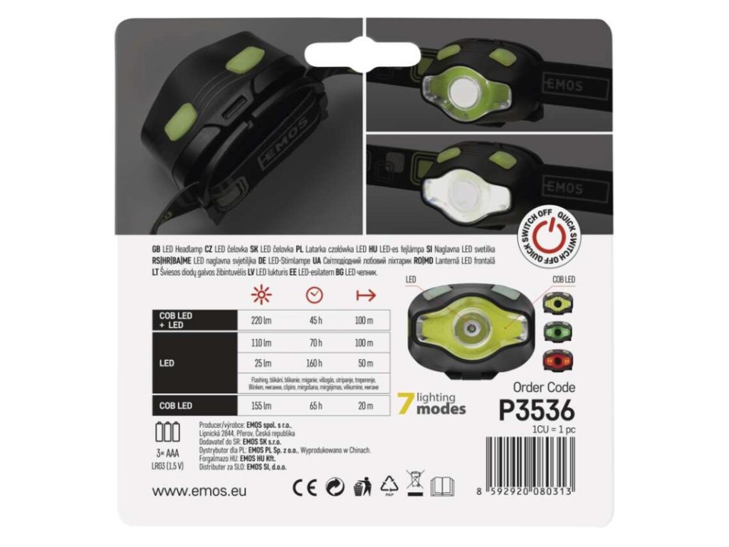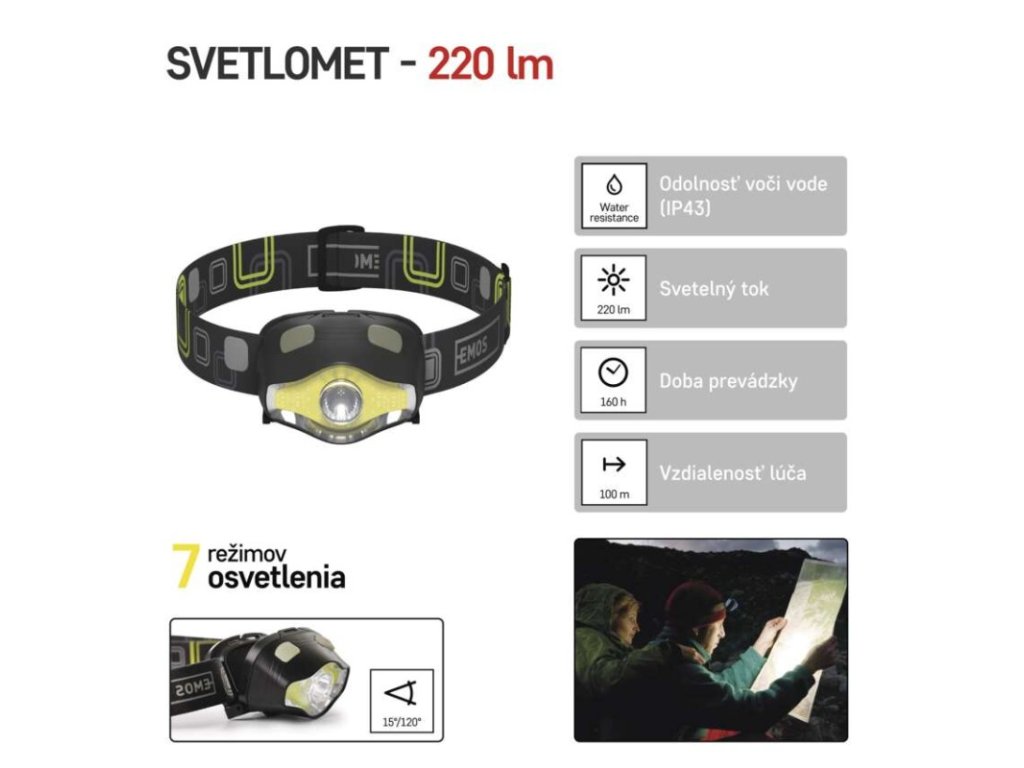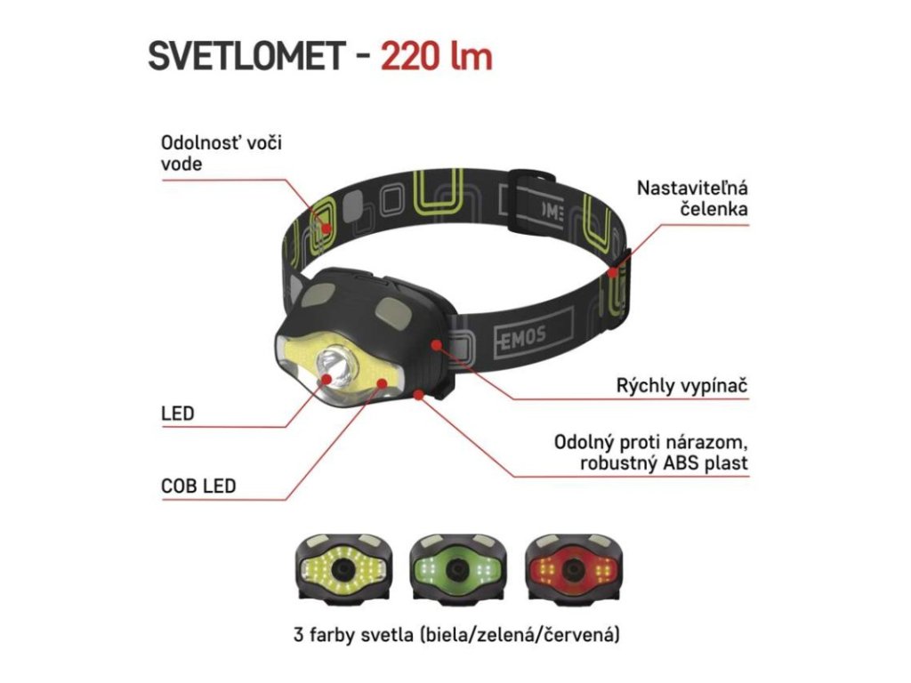 barva: čierna|batérie súčasťou balenia: nie|doba nabíjania: neuvádza sa|doba svietenia: 45–160 h|doba svietenia detail: COB LED + LED 100 % – 45 h, LED 100 % – 70 h, LED 50 % – 160 h, COB LED 100 % – 65 h|dosvit: COB LED + LED 100 % – 100 m, LED 100 % – 100 m, LED 50 % – 50 m, COB LED 100 % – 20 m|fokus: nie|hmotnosť: 65 g/100 g|LED indikácia nabíjania: neuvádza sa|LED indikácia stavu akumulátora: neuvádza sa|materiál: ABS plast|maximálny dosvit: 100 m|maximálny svetelný tok: 220 lm|nabíjací: nie|napájanie: 3× AAA|nárazuvzdornosť: áno|počet režimov svietenia: 7|predajný obal: 1 ks, papierový blister|príslušenstvo: neuvádza sa|reflexný pásik: áno|režimy: COB LED + LED 100 %, LED 100 %, LED 50 %, blikanie, COB LED – biela, COB LED – červená, COB LED – zelená|rozmer: 65 × 45 × 50 mm|špeciálna funkcia: funkcia rýchleho vypnutia|svetelný tok: COB LED + LED 100 % – 220 lm, LED 100 % – 110 lm, LED 50 % – 25 lm, COB LED 100 % – 155 lm|typ batérie: LR03 (1,5 V)|typ napájacieho konektoru: neuvádza sa|uhol vyžarovania: 15°/120°|vodeodolná: áno (IP43)|vybavenie: luminiscenčný vypínač|záručná doba: 2 roky|zdroj svetla: LED + COB LED (zelená, červená)|značka: EMOSDodatočné parametre