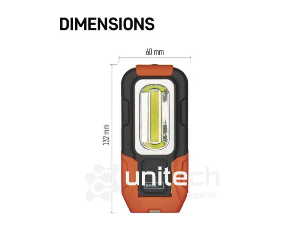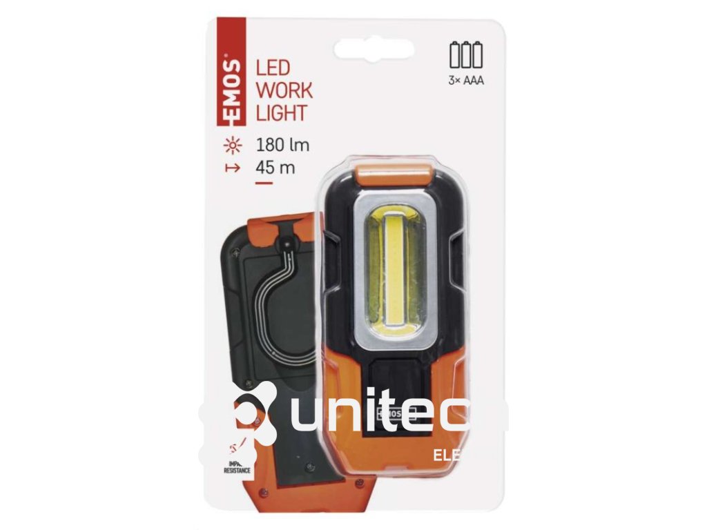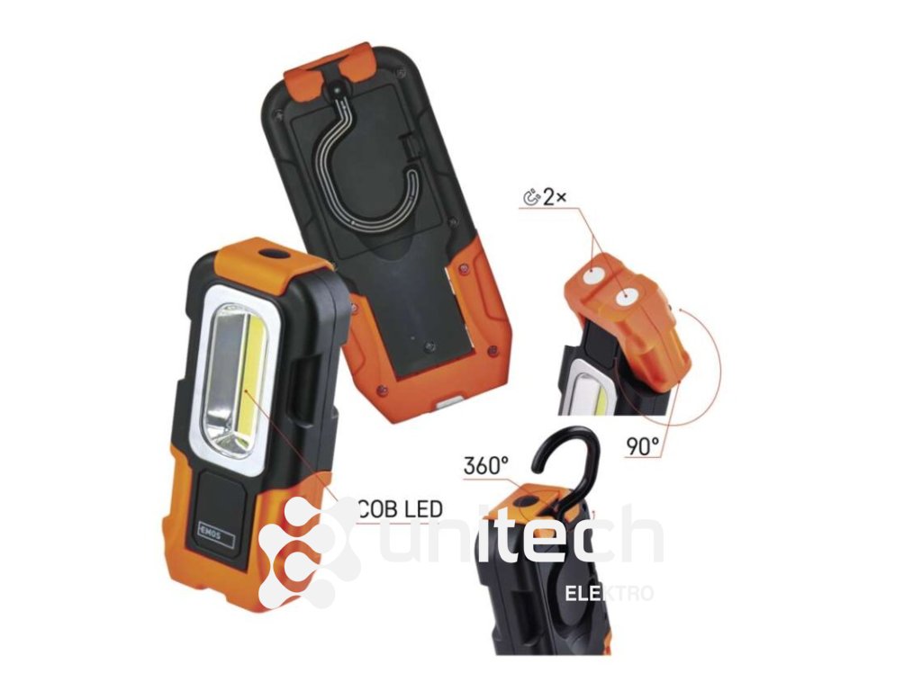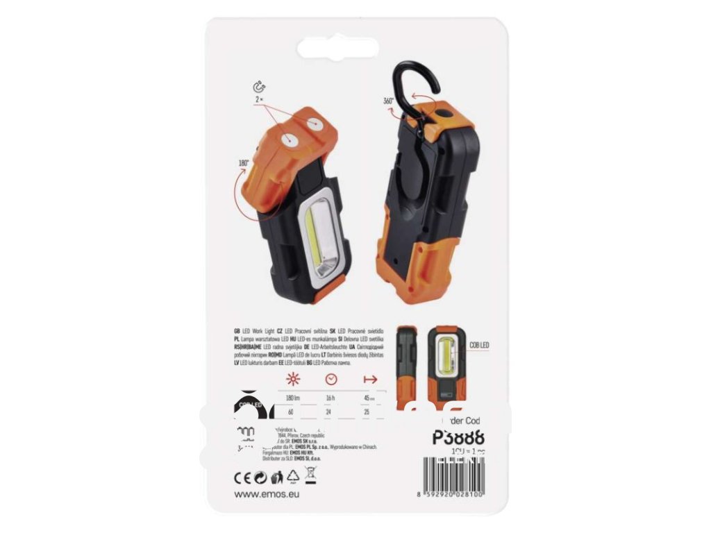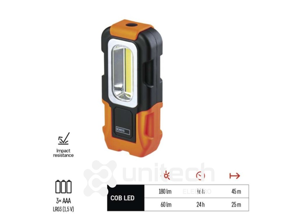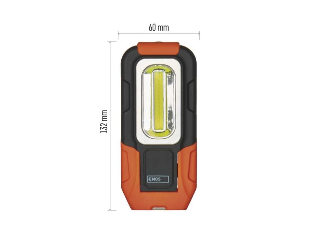 batérie súčasťou balenia: nie|doba nabíjania: neuvádza sa|doba svietenia: 16–24 h|doba svietenia detail: COB LED 100 % – 16 h, COB LED 50 % – 24 h|dosvit: COB LED 100 % – 45 m, COB LED 50 % – 25 m|farba: čierno-oranžová|fokus: nie|hmotnosť: 110 g|LED indikácia nabíjania: neuvádza sa|LED indikácia stavu akumulátora: neuvádza sa|materiál: ABS plast|maximálny dosvit: 45 m|maximálny svetelný tok: 180 lm|nabíjací: nie|napájanie: 3× AAA|nárazuvzdornosť: áno|počet režimov svietenia: 2|predajný obal: 1 ks, blister|príslušenstvo: neuvádza sa|režimy: COB LED 100 %, COB LED 50 %|rozmer: 59 × 30 × 133 mm|špeciálna funkcia: neuvádza sa|svetelný tok: COB LED 100 % – 180 lm, COB LED 50 % – 60 lm|typ batérie: LR03 (1,5 V)|typ napájacieho konektoru: neuvádza sa|vodeodolná: nie|vybavenie: lámacie rukoväť, 1× hák, 2× magnet|záručná doba: 2 roky|zdroj svetla: COB LED|značka: EMOSDodatočné parametre