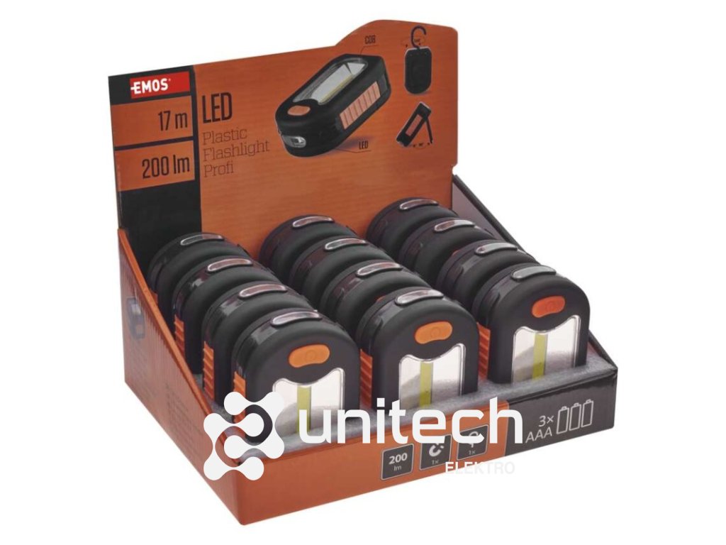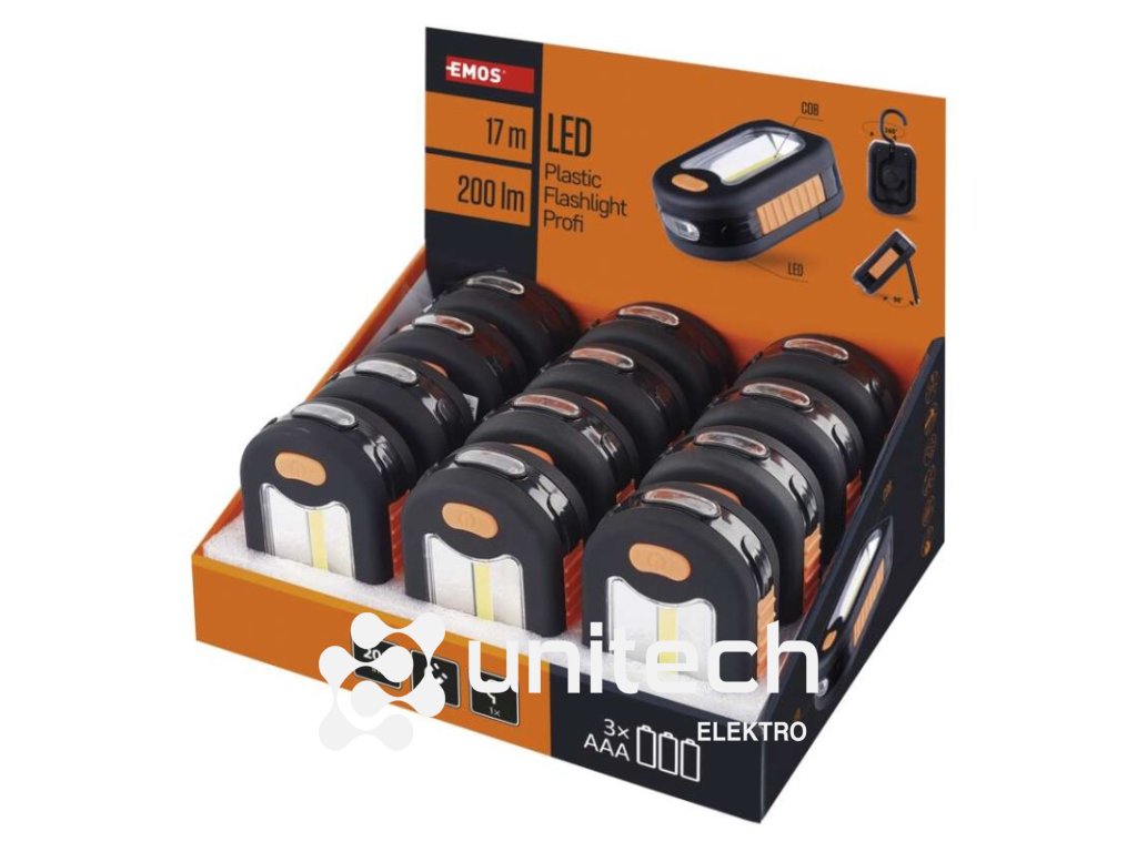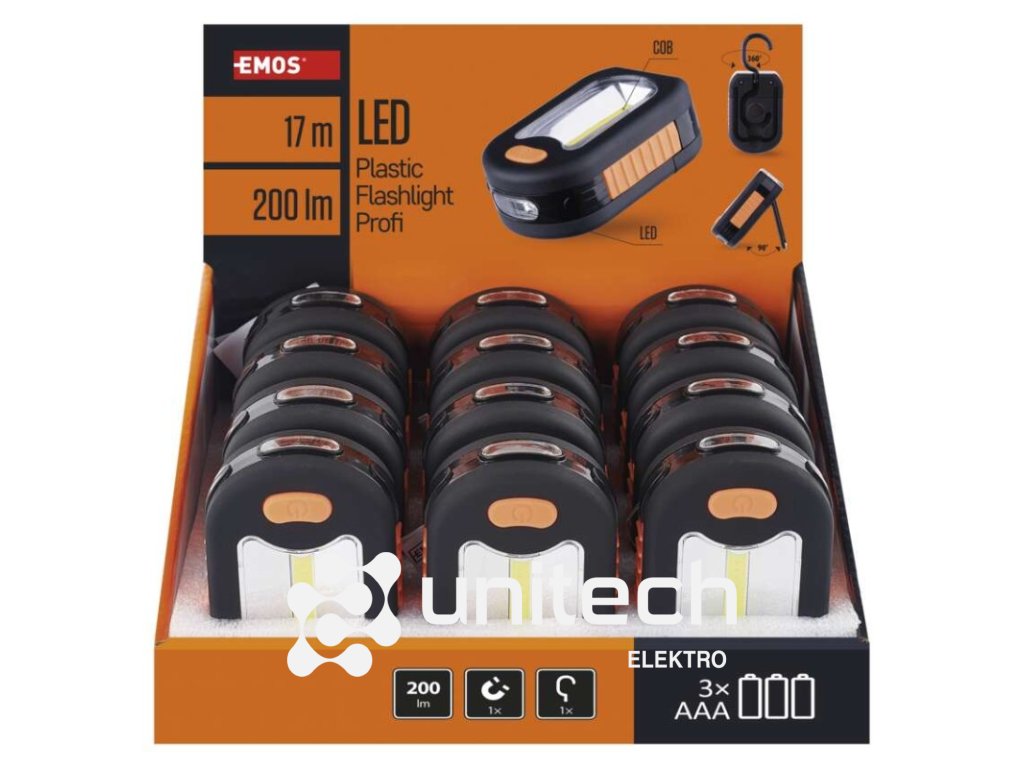 batérie súčasťou balenia: áno|doba nabíjania: neuvádza sa|doba svietenia: 25–128 h|doba svietenia detail: COB LED – 25 hodin, LED – 128 hodin|dosvit: COB LED 100 % – 12 m, LED 100 % – 17 m|farba: čierno-oranžová|fokus: nie|hmotnosť: 105 g|LED indikácia nabíjania: neuvádza sa|LED indikácia stavu akumulátora: neuvádza sa|materiál: ABS plast + guma|maximálny dosvit: 17 m|maximálny svetelný tok: 200 lm|nabíjací: nie|napájanie: 3× AAA|nárazuvzdornosť: áno|počet režimov svietenia: 2|predajný obal: 12 ks, display box|príslušenstvo: stojanček|režimy: COB LED, LED, vypnuté|rozmer: 94 × 34 × 64 mm|špeciálna funkcia: neuvádza sa|svetelný tok: COB LED 100 % – 200 lm|typ batérie: LR03 (1,5 V)|typ napájacieho konektoru: neuvádza sa|vodeodolná: nie|vybavenie: 1× hák, 1× magnet|záručná doba: 2 roky|zdroj svetla: COB LED + 3× LED|značka: EMOSDodatočné parametre