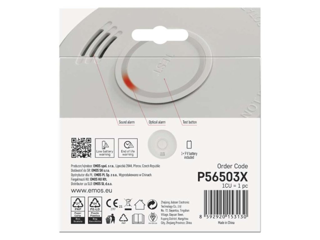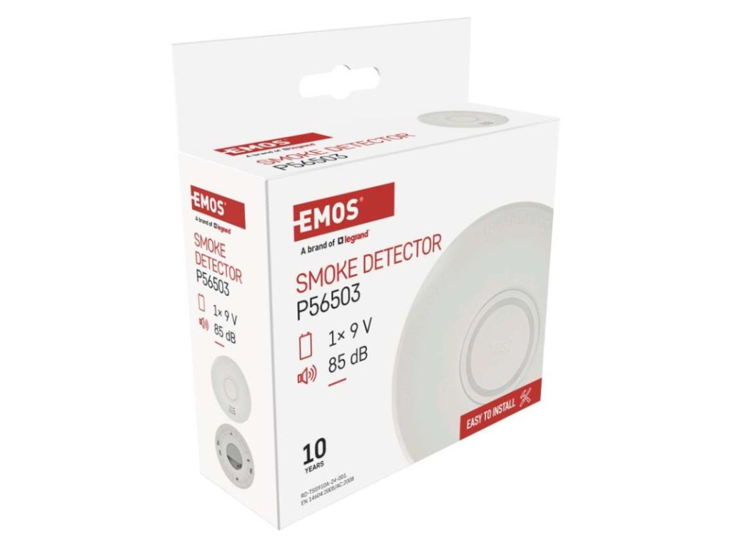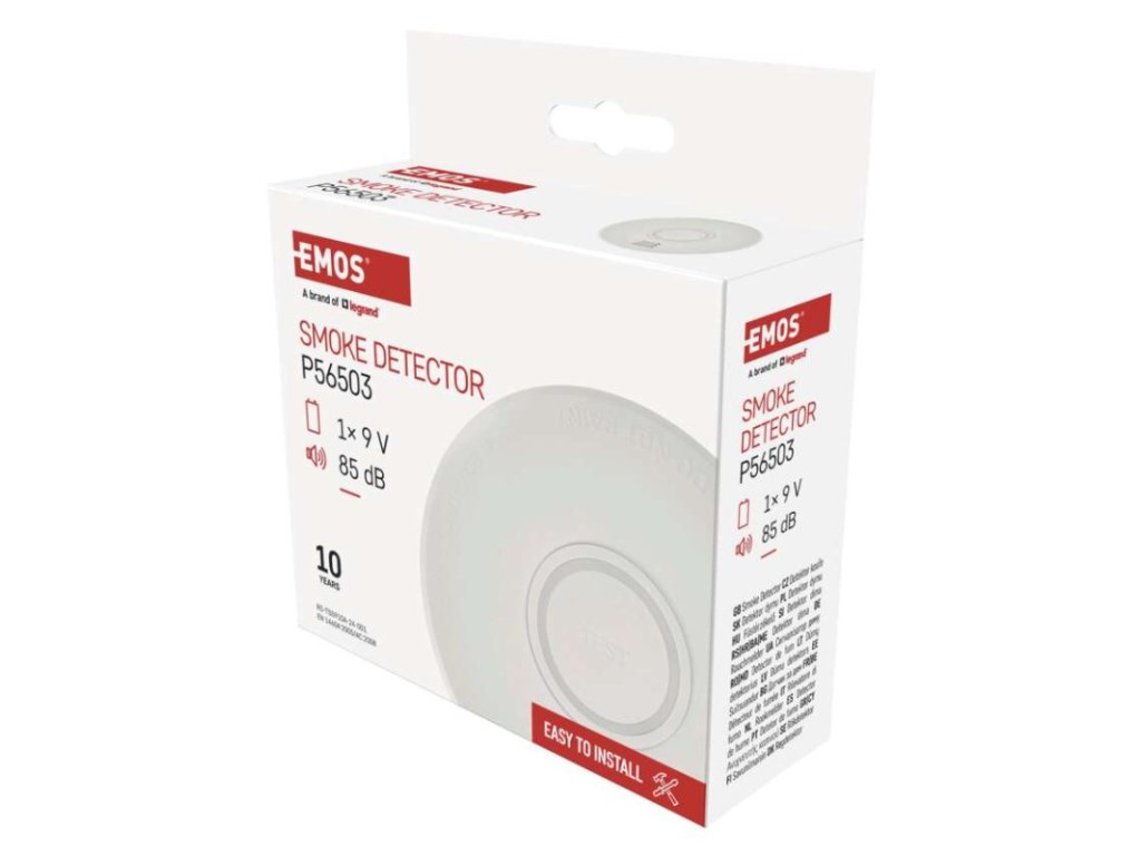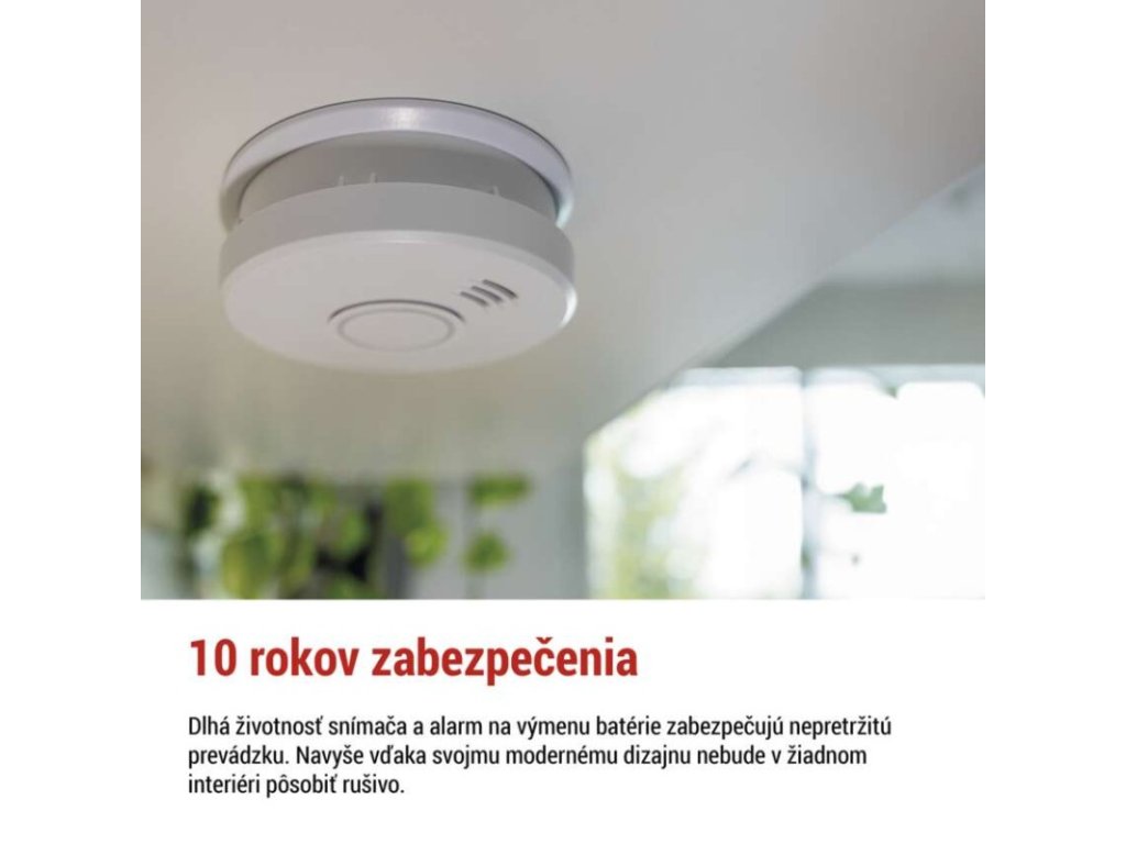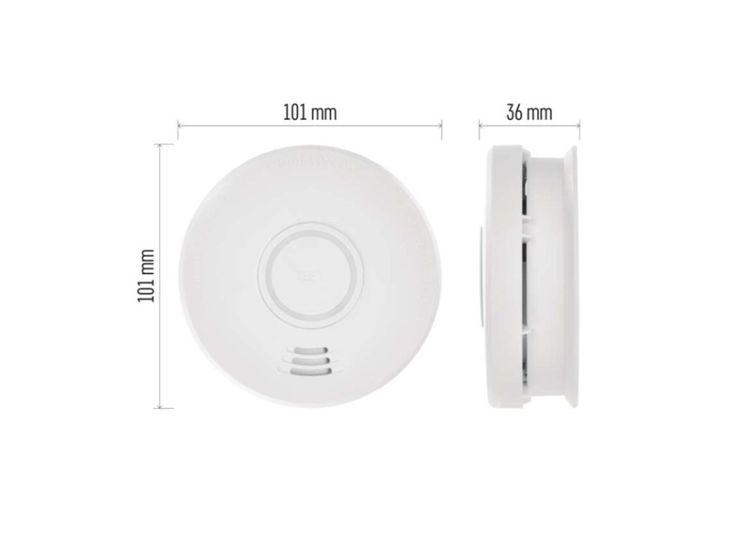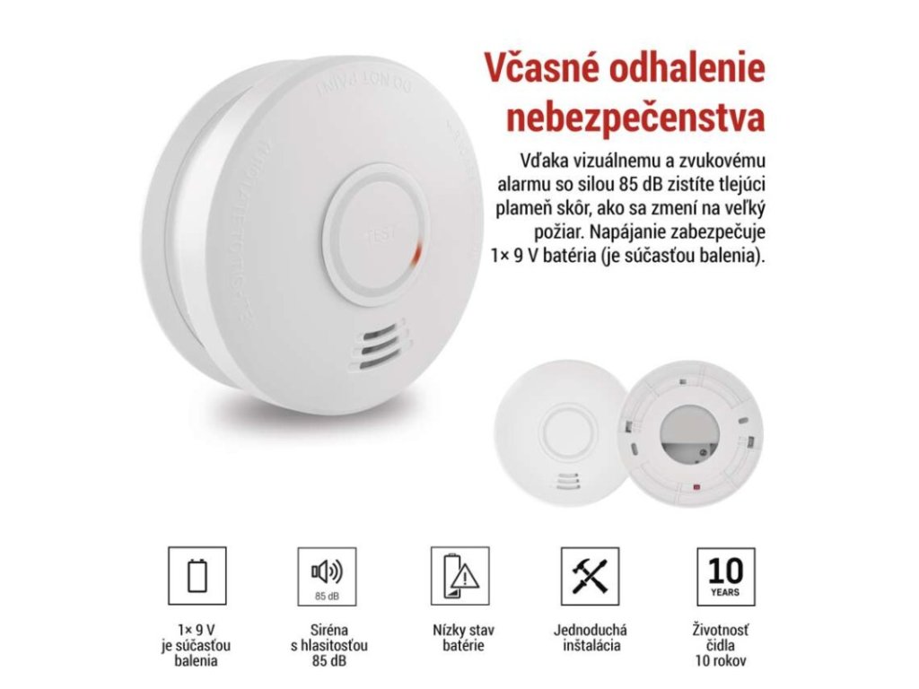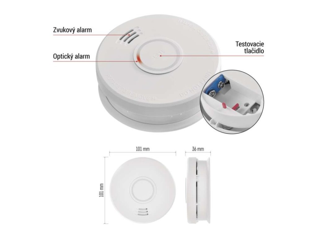 ďalšie funkcie: –|dosah modulu: –|hlasitosť signalizácie: >85 dB vo vzdialenosti 3 m|jazyky aplikácie: –|kompatibilita: –|krytie: –|možnosť prepojenia s ďalšími detektormi: –|napájanie: 1× 9 V, súčasťou balenia|notifikácie do mobilnej aplikácie: –|ovládanie hlasovými asistentmi: –|pamäť poplachov: –|podporované OS: –|poplachová teplota: –|predajný obal: 1 ks, krabička|prenosová frekvencia: –|prevádzková teplota: 0 °C až 40 °C|prevádzková vlhkosť: 5–95 %|protokol: –|rozmer: 101 × 36 mm|typ detekcie: detektor dymu|typ inštalácie: montáž na stenu alebo voľne stojaci|typ signalizácie: optická aj zvuková|určené pre typ: –|životnosť: 10 rokovDodatočné parametre