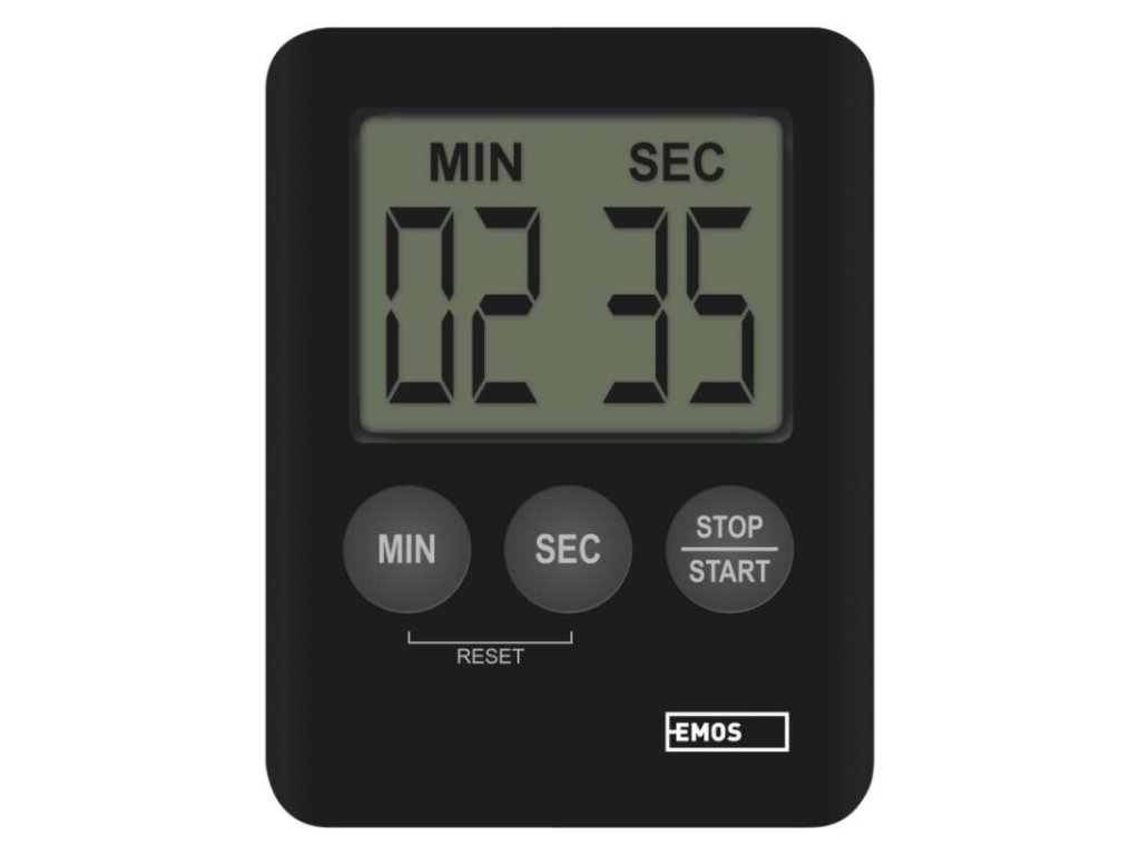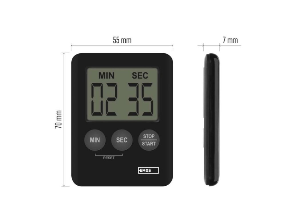 funkcie stopky: áno|jednoduché ovládanie: áno|magnet na pripevnenie: áno|napájanie: 1× 1,5 V LR1130 (súčasťou balenia)|odpočet času max. od: 99 minút 59 sec|pamäť poslednej hodnoty: áno|predajný obal: 1 ks, blister|rozmer: 7 × 55 × 70 mmDodatočné parametre