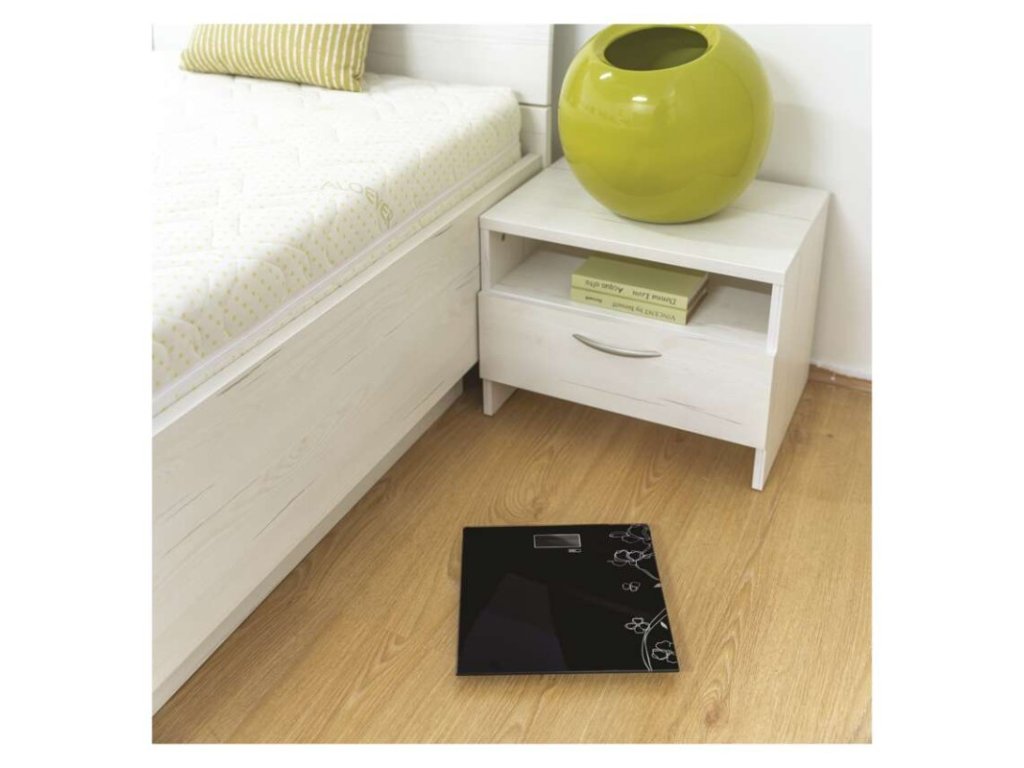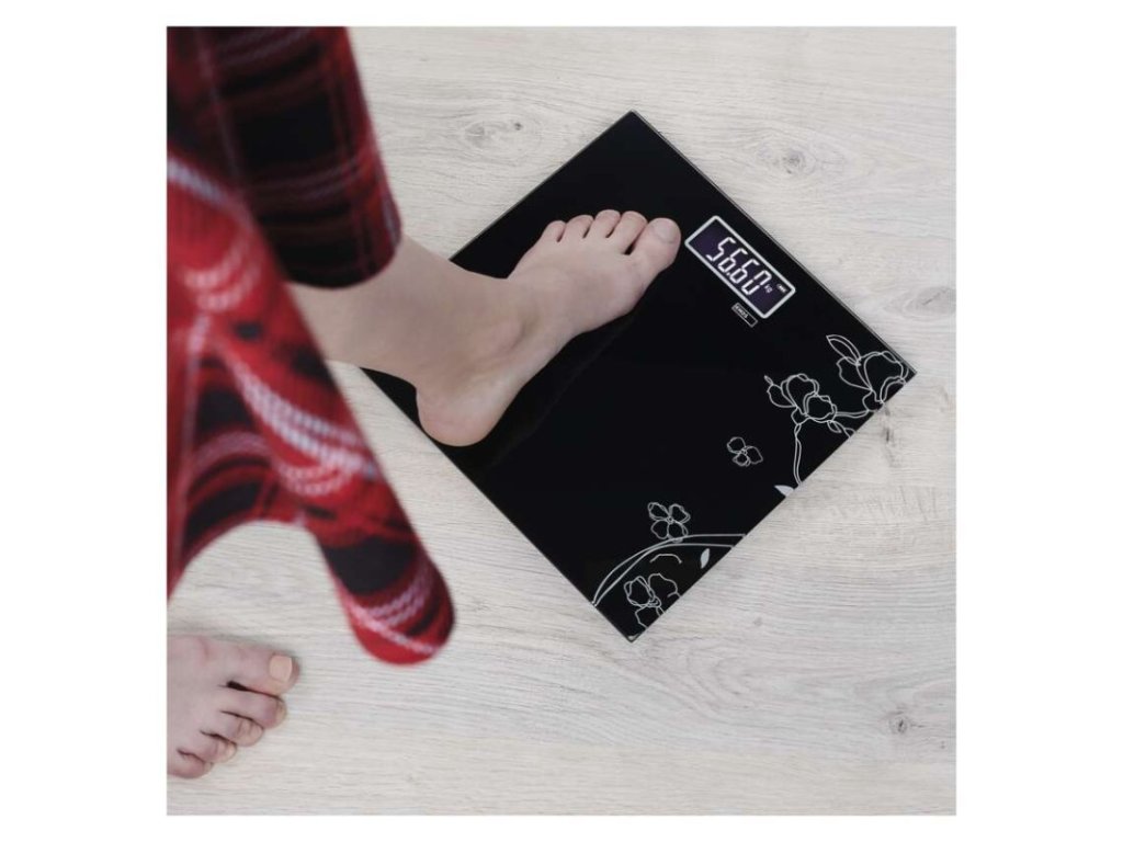 automatické vypnutie: po 20 sekundách|Bluetooth: nie|BMI index – meranie tuku, vody a svalovej hmoty: nie|farba: čierna|funkcia dovažovania: nie|indikácia slabých batérií: áno|indikátor preťaženia: áno|jednotky váhy: kg, lb, St|LCD displej: áno|max. záťaž: 180 kg|napájanie: 2× 1,5 V AAA (súčasťou balenia)|pamäť: nie|podsvietený displej: áno|povrch váhy: tvrdené sklo|predajný obal: 1 ks, krabica|presnosť váženia: 100 g|produkt: osobná váha|rozmer: 25 × 280 × 280 mmDodatočné parametre