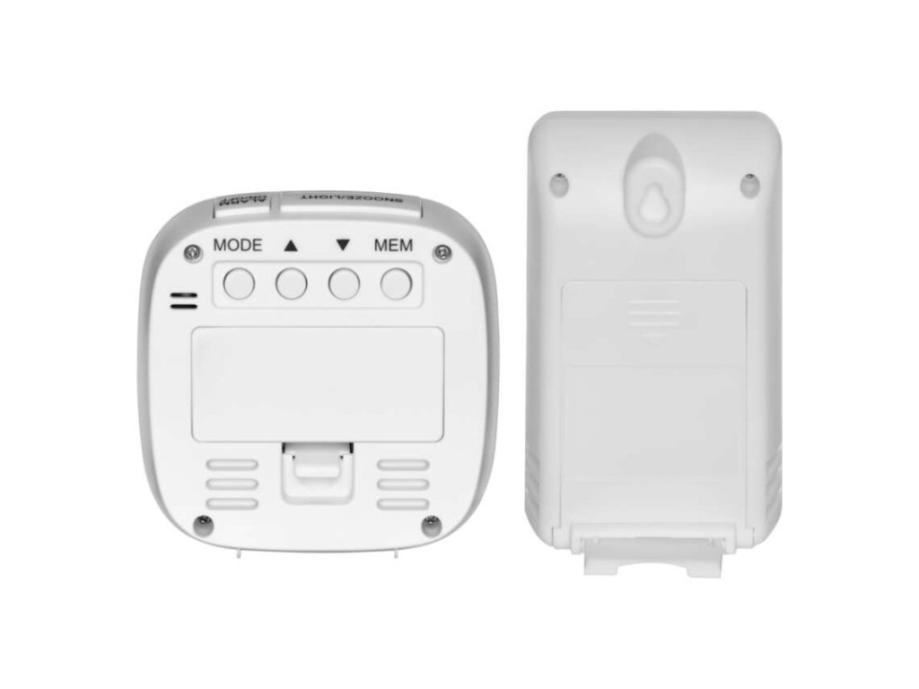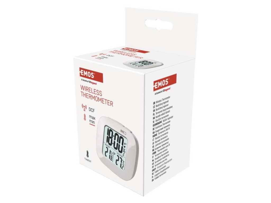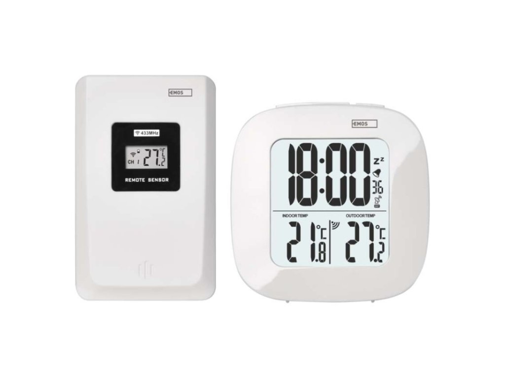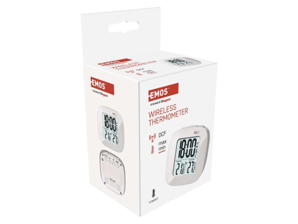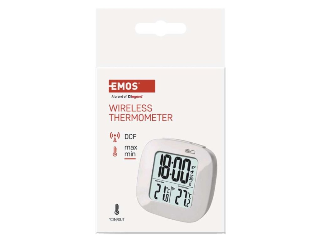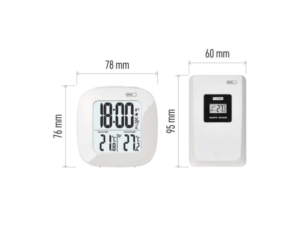 12/24 formát času: áno|budík: áno|časové pásma: áno|dátum: áno|dosah vo voľnom priestore: až 30 m|drôtová sonda k čidlu: nie|farebný displej (black mask) podsvietený: nie|funkcie stopky: nie|hodiny: riadené DCF signálom|kalendár: nie|LED podsvietenie displeja: áno|magnet na pripevnenie: nie|min. a max. teplota: áno|možné ďalšie čidlo: 1 (E05018)|možnosť nastavenia jednotky teploty °C/°F: °C/°F|možnosť zavesenia na stenu: nie|napájanie čidla: 2× 1,5 V AAA (nie sú súčasťou balenia)|napájanie stanice: 2× 1,5 V AAA (nie sú súčasťou balenia)|odpočet času max. od: nie|opakované budenie: áno|pamäť poslednej hodnoty: nie|predajný obal: 1 ks, krabička|prenosová frekvencia: 433 MHz|prevedenie teplomera: bezdrôtový|rozmer čidla: 25 × 60 × 95 mm|rozmer hlavnej jednotky: 30 × 78 × 78 mm|sieťový adaptér: nie|teplotná výstraha: nie|teplotný index: nie|trend teploty: nie|trend tlaku: nie|trvalé podsvietenie: nie|veľkosť displeja: 46 × 49 mm|vnútorná teplota: 0 °C až +50 °C, rozlíšenie 0,1 °C|vnútorná vlhkosť: nie|vonkajšia teplota: -20 °C až +60 °C, rozlíšenie 0,1 °C|vonkajšia vlhkosť: nieDodatočné parametre