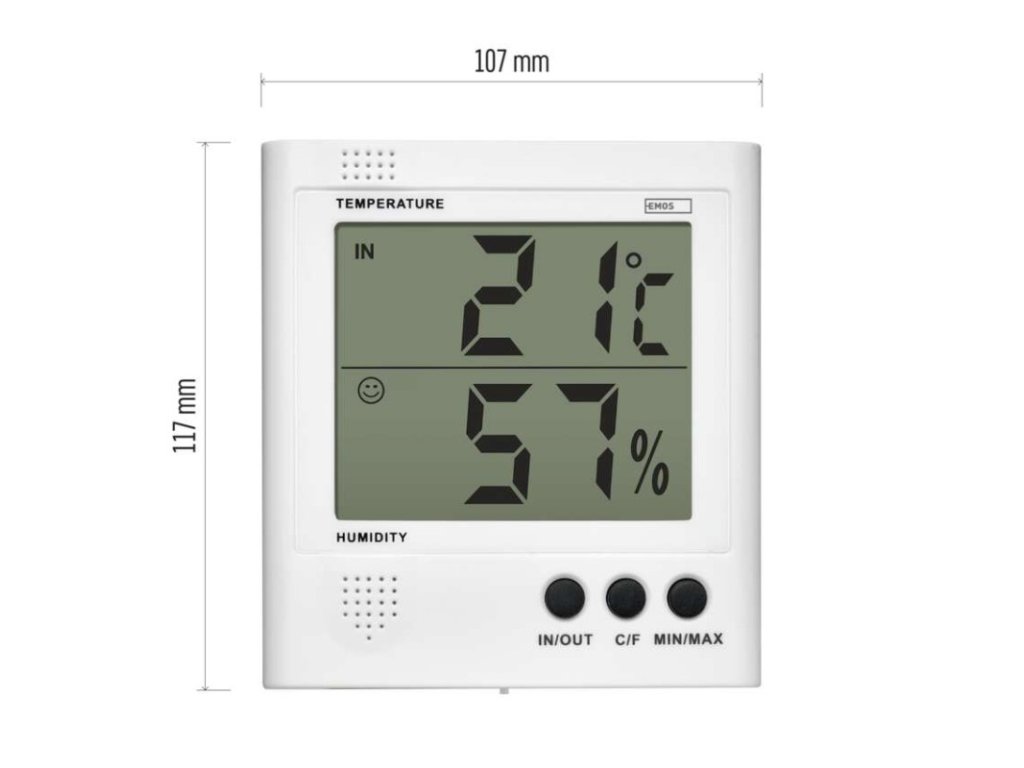 12/24 formát času: nie|budík: nie|časové pásma: nie|dátum: nie|dosah vo voľnom priestore: nie|drôtová sonda k čidlu: 2 m|farebný displej (black mask) podsvietený: nie|funkcie stopky: nie|hodiny: nie|kalendár: nie|LED podsvietenie displeja: nie|magnet na pripevnenie: nie|min. a max. teplota: áno|možné ďalšie čidlo: nie|možnosť nastavenia jednotky teploty °C/°F: °C/°F|možnosť zavesenia na stenu: áno|napájanie čidla: nie|napájanie stanice: 2× 1,5 V AAA (nie sú súčasťou balenia)|odpočet času max. od: nie|opakované budenie: nie|pamäť poslednej hodnoty: nie|predajný obal: 1 ks, krabička|prenosová frekvencia: nie|prevedenie teplomera: drôtový|rozmer čidla: nie|rozmer hlavnej jednotky: 22 × 106 × 117 mm|sieťový adaptér: nie|teplotná výstraha: áno|teplotný index: áno|trend teploty: nie|trend tlaku: nie|trvalé podsvietenie: nie|veľkosť displeja: 64 × 76 mm|vnútorná teplota: -10 °C až +50 °C, rozlišenie 1 °C|vnútorná vlhkosť: 20 % až 99 % RV, rozlíšenie 1 %|vonkajšia teplota: -50 °C až +70 °C, rozlišenie 1 °C|vonkajšia vlhkosť: nieDodatočné parametre