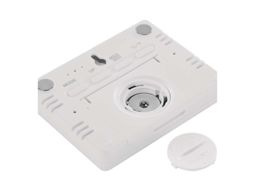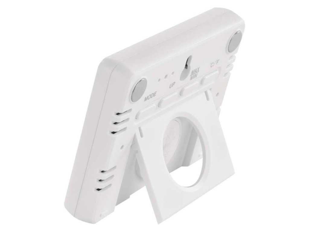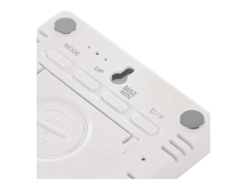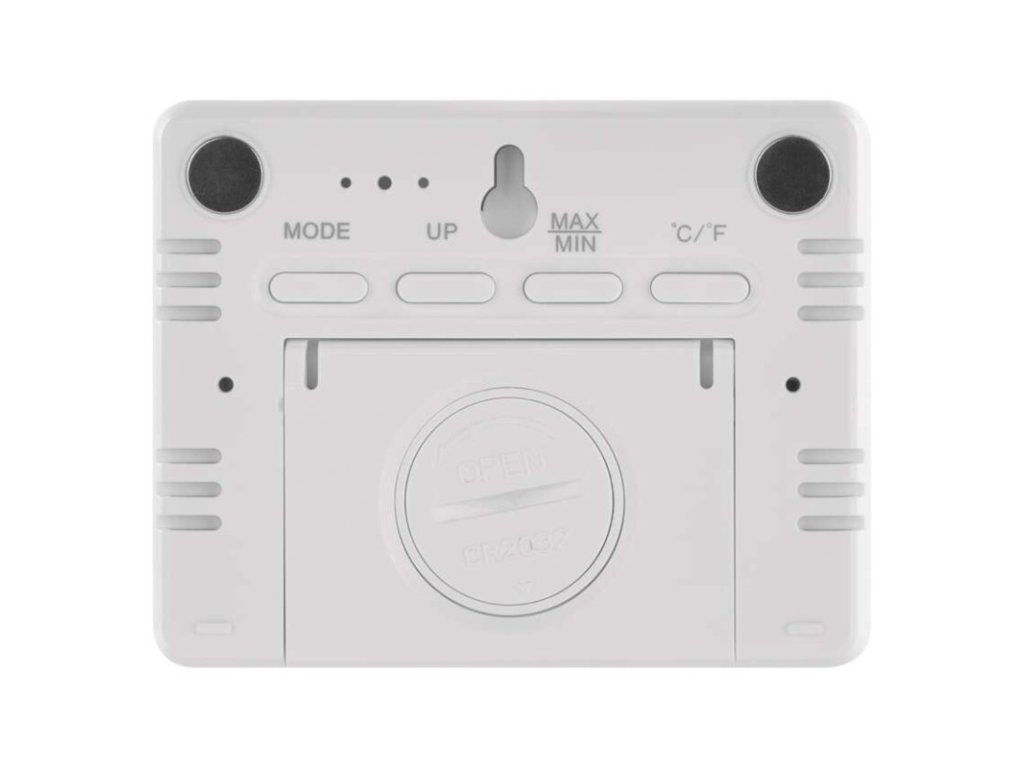 12/24 formát času: áno|budík: áno|časové pásma: nie|dátum: áno|dosah vo voľnom priestore: nie|drôtová sonda k čidlu: nie|farebný displej (black mask) podsvietený: nie|funkcie stopky: nie|hodiny: áno, quartz|kalendár: nie|LED podsvietenie displeja: nie|magnet na pripevnenie: áno|min. a max. teplota: áno|možné ďalšie čidlo: nie|možnosť nastavenia jednotky teploty °C/°F: áno|možnosť zavesenia na stenu: áno|napájanie čidla: nie|napájanie stanice: 1× 3 V CR2032 (súčasťou balenia)|odpočet času max. od: nie|opakované budenie: nie|pamäť poslednej hodnoty: nie|predajný obal: 1 ks, krabička|prenosová frekvencia: nie|prevedenie teplomera: bezdrôtový|rozmer čidla: nie|rozmer hlavnej jednotky: 93 × 15 × 73 mm|sieťový adaptér: nie|teplotná výstraha: nie|teplotný index: nie|trend teploty: nie|trend tlaku: nie|trvalé podsvietenie: nie|veľkosť displeja: 61 × 82 mm|vnútorná teplota: 0 °C až +50 °C, rozlíšenie 0,1 °C|vnútorná vlhkosť: 10 % až 99 % RV, rozlíšenie 1 %|vonkajšia teplota: nie|vonkajšia vlhkosť: nieDodatočné parametre