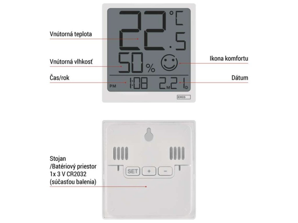 12/24 formát času: áno|budík: nie|časové pásma: nie|dátum: áno|dosah vo voľnom priestore: nie|drôtová sonda k čidlu: nie|farebný displej (black mask) podsvietený: nie|funkcie stopky: nie|hodiny: áno, quartz|kalendár: nie|LED podsvietenie displeja: nie|magnet na pripevnenie: nie|min. a max. teplota: nie|možné ďalšie čidlo: nie|možnosť nastavenia jednotky teploty °C/°F: áno|možnosť zavesenia na stenu: áno|napájanie čidla: nie|napájanie stanice: 1× 3 V CR2032 (súčasťou balenia)|odpočet času max. od: nie|opakované budenie: nie|pamäť poslednej hodnoty: nie|predajný obal: 1 ks, krabička|prenosová frekvencia: nie|prevedenie teplomera: bezdrôtový|rozmer čidla: nie|rozmer hlavnej jednotky: 83 × 17 × 88 mm|sieťový adaptér: nie|teplotná výstraha: nie|teplotný index: nie|trend teploty: nie|trend tlaku: nie|trvalé podsvietenie: nie|veľkosť displeja: 73 × 73 mm|vnútorná teplota: -10 °C až +50 °C, rozlíšenie 0,1 °C|vnútorná vlhkosť: 1 % až 99 % RV, rozlíšenie 1 %|vonkajšia teplota: nie|vonkajšia vlhkosť: nieDodatočné parametre