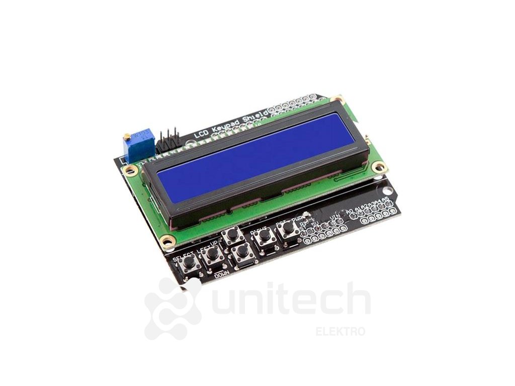 Arduino shield so 6 tlačidlami. Displej 16 × 2, modré podsvietenie, biela písmená. Radič HD44780.