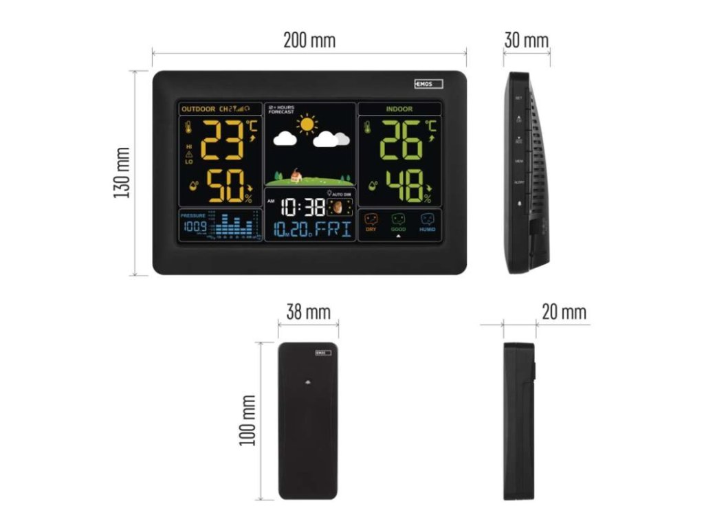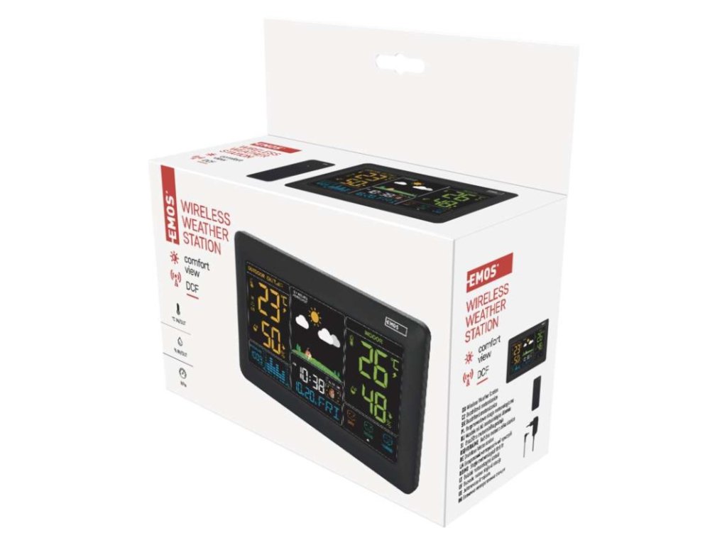 12/24 formát času: áno|anemometer: nie|barometer: áno|budík: áno|časové pásma: áno|dátum: áno|dosah snímača: až 80 m|drôtová sonda k čidlu: nie|elektronické plošné podsvietenie: áno|farebný displej (black mask) podsvietený: áno|fázy mesiaca: áno|hodiny: riadené DCF signálom|kalendár: áno|korekcia nadmorskej výšky: nie|LED podsvietenie displeja: áno|min. a max. teplota: áno|možné ďalšie čidlo: 3 (E00387)|možnosť nastavenia jednotky teploty °C/°F: °C/°F|možnosť zavesenia na stenu: áno|napájanie čidla: 2× 1,5 V AA (nie sú súčasťou balenia)|napájanie stanice: 3× 1,5 V AA (nie sú súčasťou balenia)|opakované budenie: áno|predajný obal: 1 ks, krabička|predpoveď počasia: áno|prenosová frekvencia: 433 MHz|prevedenie teplomera: bezdrôtové|produkt: metestanica|projekcia: nie|rozmer čidla: 38 × 20 × 100 mm|rozmer hlavnej jednotky: 30 × 200 × 130 mm|sieťový adaptér: áno, 5 V DC/1 200 mA (súčasťou balenia)|teplotná výstraha: áno|trend teploty: áno|trend tlaku: áno|trvalé podsvietenie: áno|veľkosť displeja: 168 × 91 mm|vnútorná teplota: -10 °C až +50 °C, rozlíšenie 0,1 °C|vnútorná vlhkosť: 1 % až 99 % RV, rozlíšenie 1 %|vonkajšia teplota: -40 °C až +60 °C, rozlíšenie 0,1 °C|vonkajšia vlhkosť: 1 % až 99 % RV, rozlíšenie 1 %|zrážkomer: nieDodatočné parametre