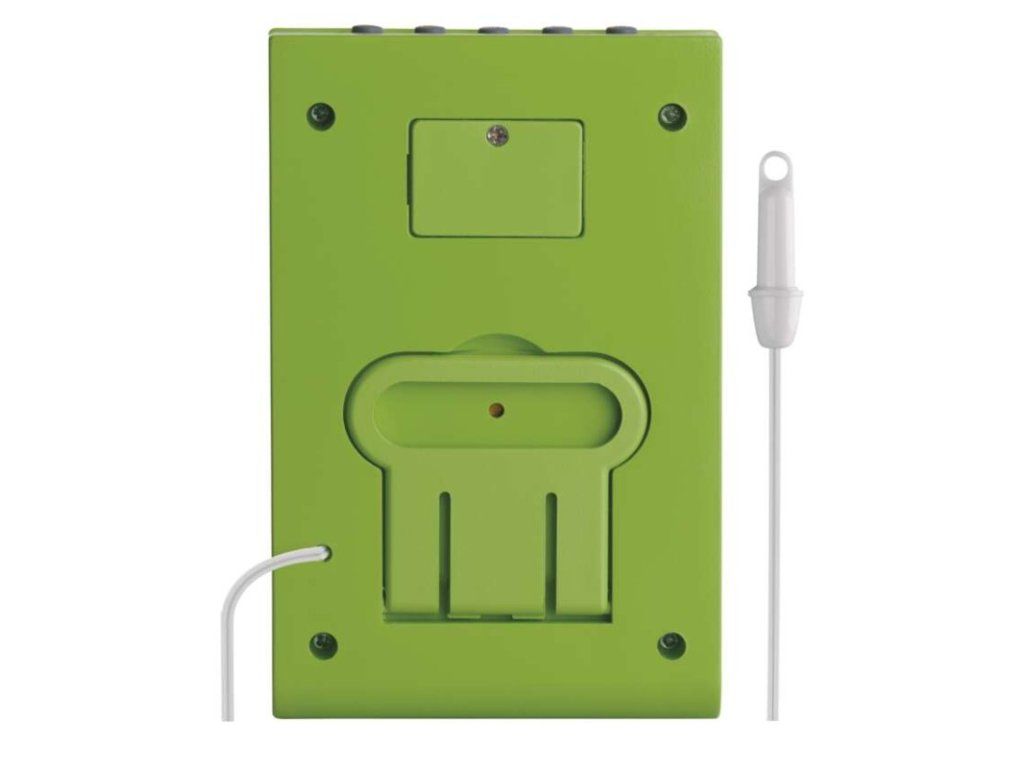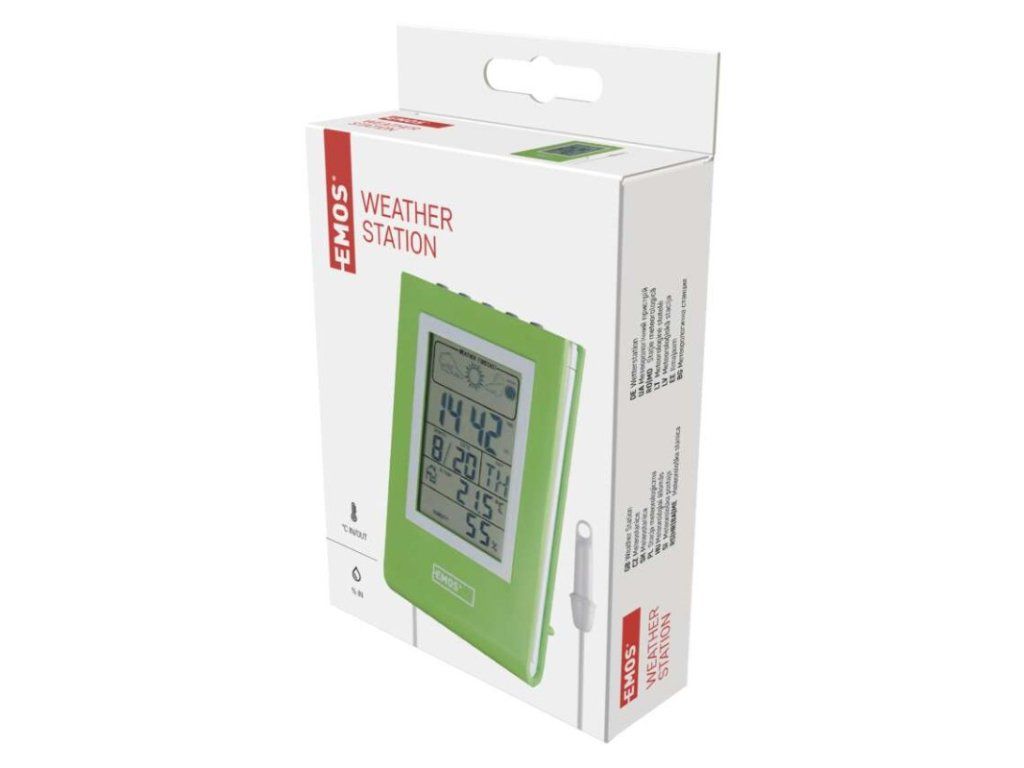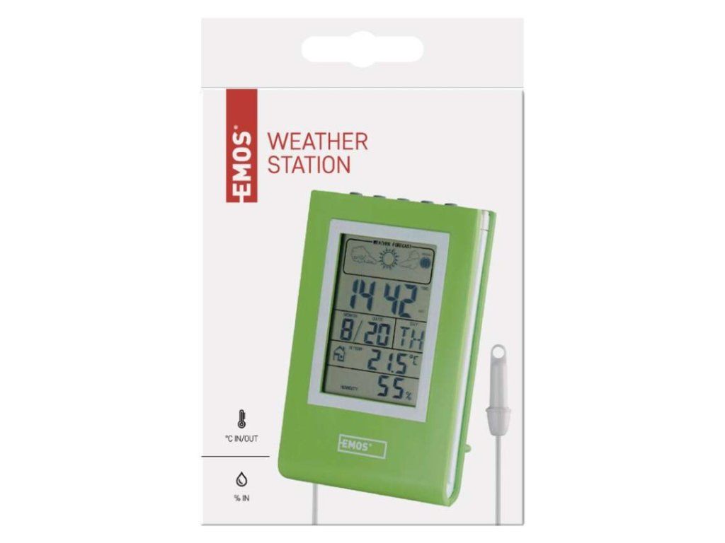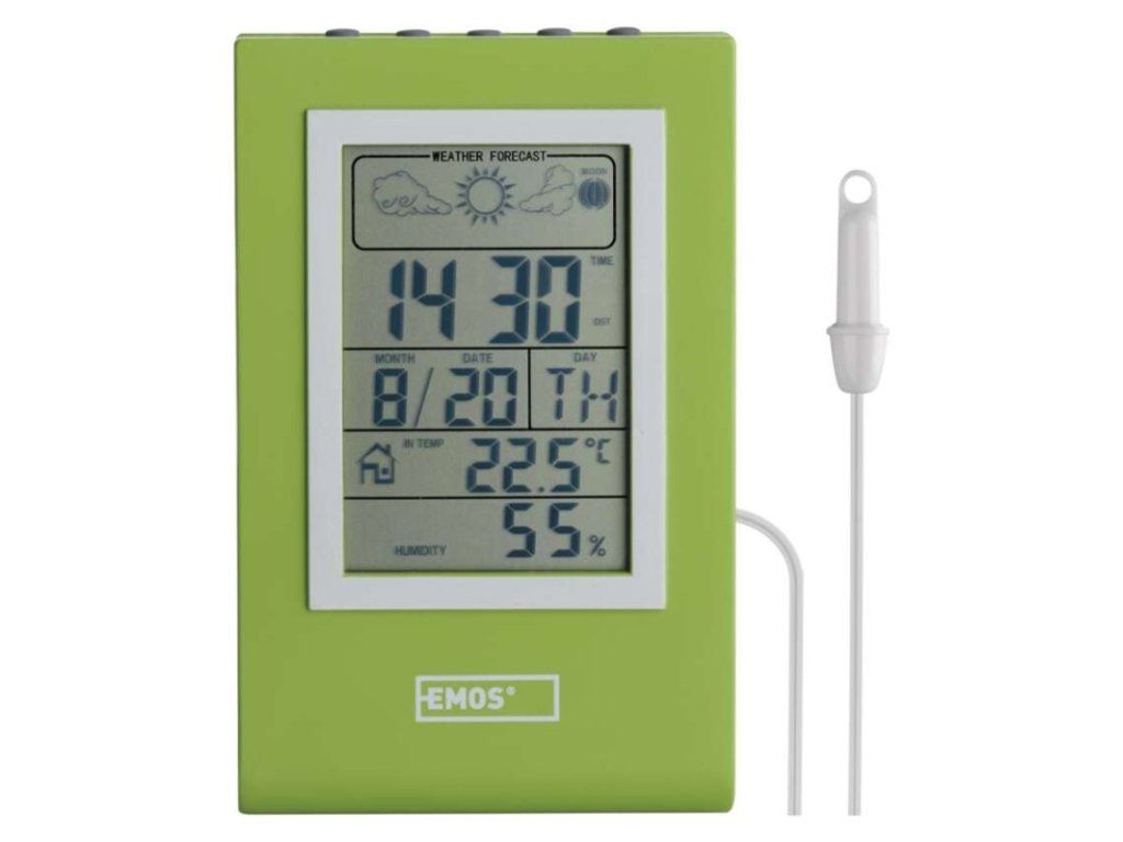 12/24 formát času: áno|anemometer: nie|barometer: nie|budík: áno|časové pásma: nie|dátum: áno|dosah snímača: nie|drôtová sonda k čidlu: 1,9 m|elektronické plošné podsvietenie: nie|farebný displej (black mask) podsvietený: nie|fázy mesiaca: áno|hodiny: áno, quartz|kalendár: áno|korekcia nadmorskej výšky: nie|LED podsvietenie displeja: nie|min. a max. teplota: áno|možné ďalšie čidlo: nie|možnosť nastavenia jednotky teploty °C/°F: °C/°F|možnosť zavesenia na stenu: nie|napájanie čidla: nie|napájanie stanice: 2× LR1130 (súčasťou balenia)|opakované budenie: áno|predajný obal: 1 ks, krabička|predpoveď počasia: áno|prenosová frekvencia: nie|prevedenie teplomera: drôtové|produkt: metestanica|projekcia: nie|rozmer čidla: nie|rozmer hlavnej jednotky: 16 × 70 × 109 mm|sieťový adaptér: nie|teplotná výstraha: nie|trend teploty: nie|trend tlaku: nie|trvalé podsvietenie: nie|veľkosť displeja: 45 × 79 mm|vnútorná teplota: -10 °C až +50 °C, rozlíšenie 0,1 °C|vnútorná vlhkosť: 20 % až 95 % RV, rozlíšenie 1 %|vonkajšia teplota: -50 °C až +70 °C, rozlíšenie 0,1 °C|vonkajšia vlhkosť: nie|zrážkomer: nieDodatočné parametre