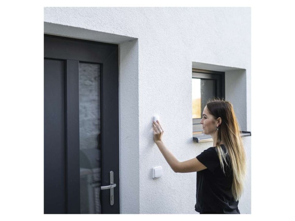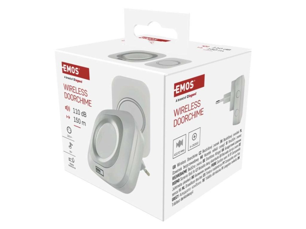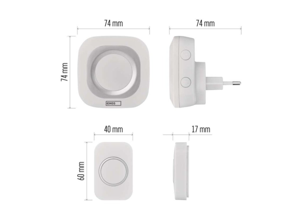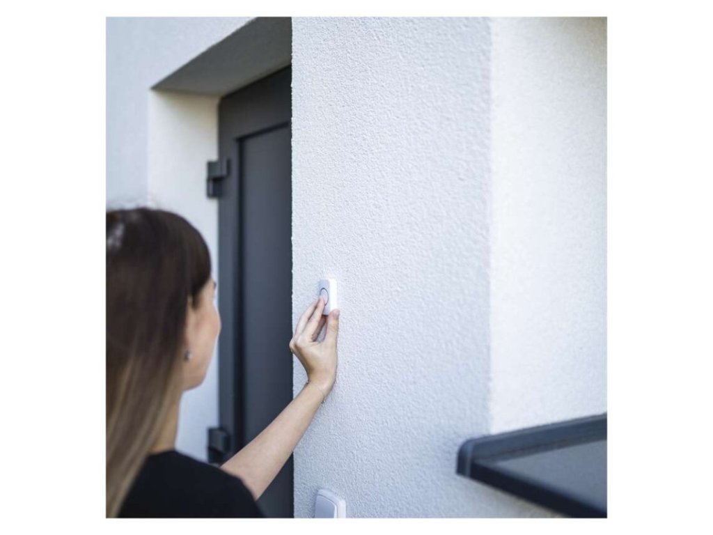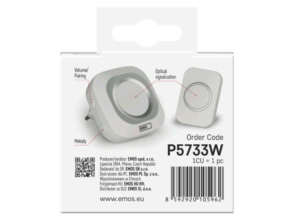 ďalšie funkcie: –|dosah tlačidla: 150 m|farba: biela|hlasová komunikácia: nie|inštalačný materiál: –|jazyky aplikácie: –|kompatibilita: –|maximálna hlasitosť zvonenia: 110 dB|možnosť pridať ďalšie tlačidlo: áno, max. 8|napájanie hlavnej jednotky: 230 V AC|napájanie tlačidla: 1× 3 V CR2032 (súčasťou balenia)|notifikácie do mobilnej aplikácie: nie|optická signalizácia na tlačidle: áno|optická signalizácia na zvončeku: áno|ovládanie hlasovými asistentmi: nie|počet melódií: 36|počet prijímačov v balení: 1 ks|počet tlačidiel v balení: 1 ks|podporované OS: –|predajný obal: 1 ks, blister|prenosová frekvencia: 433 MHz|prídavné (náhradné) tlačidlo: P5732T|protokol: –|rada: –|regulácia hlasitosti: áno, 4 úrovne|rozmer tlačidla: 17 × 40 × 60 mm|rozmer zvončeka: 74 × 74 × 74 mm|špeciálne funkcie: výrazná optická signalizácia zvonenia|spôsob párovania: automatické párovanie – self-learning|spôsob prenosu: bezdrôtový zvonček|vodeodolné tlačidlo: IP44Dodatočné parametre