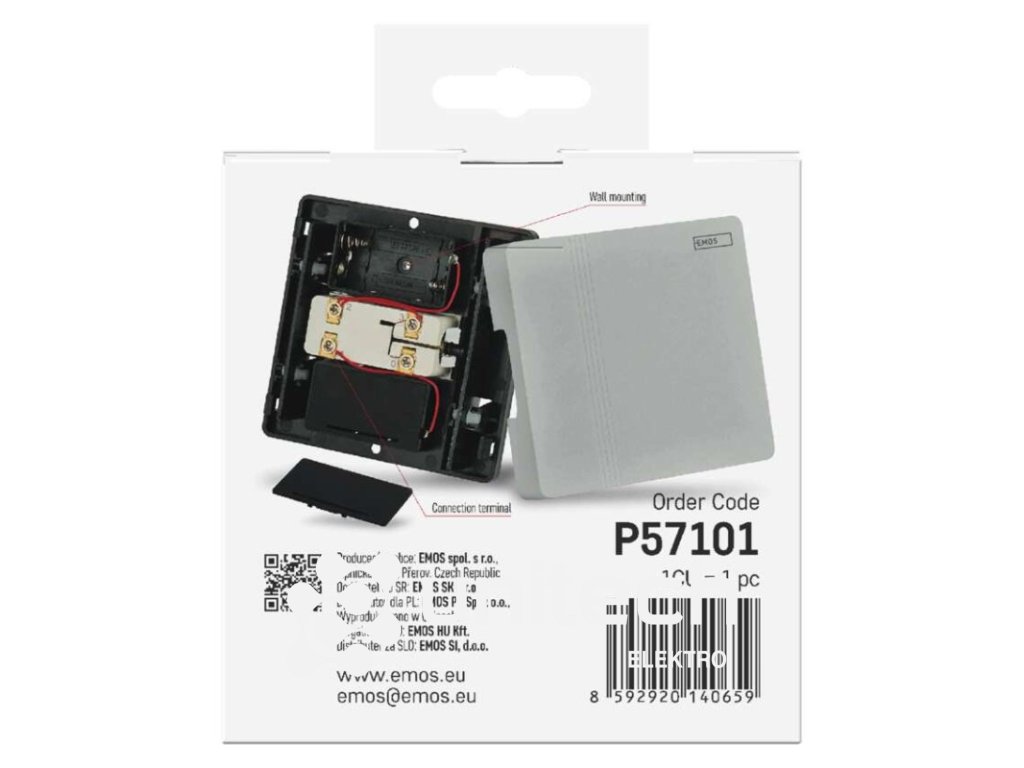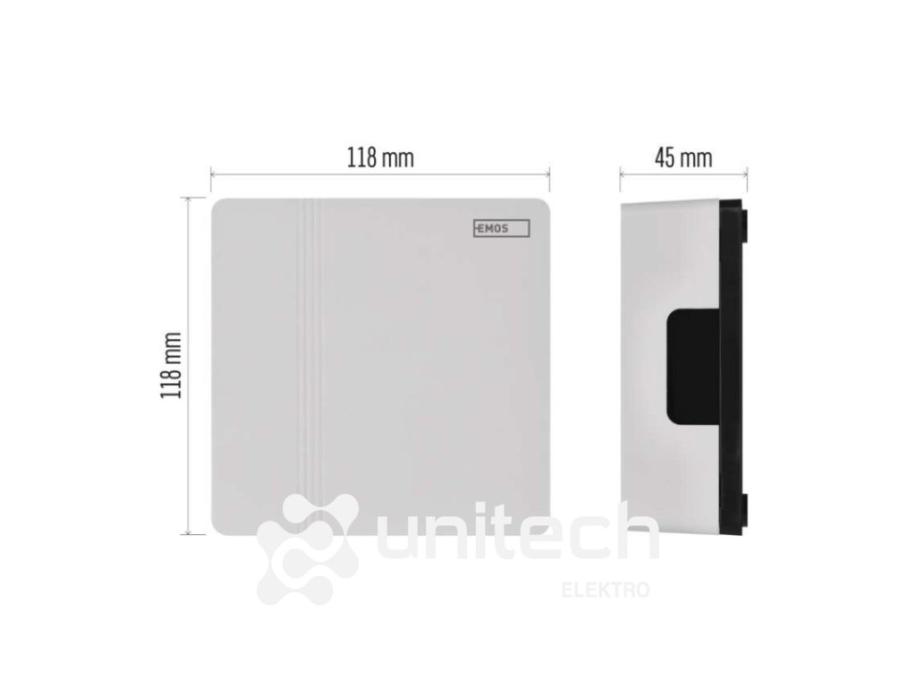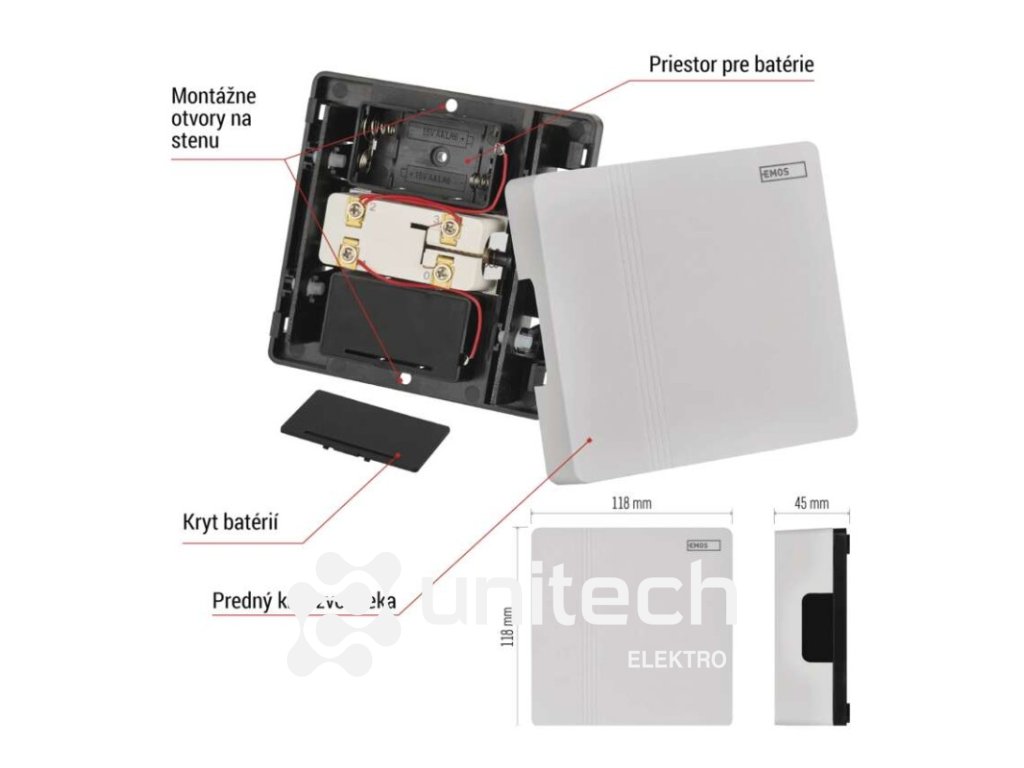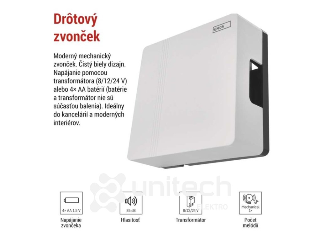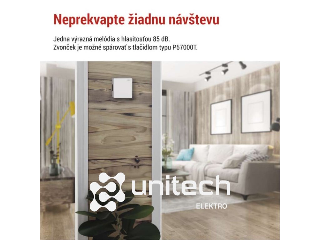 ďalšie funkcie: –|dosah tlačidla: drôtové spojenie|farba: biela|hlasová komunikácia: nie|inštalačný materiál: –|jazyky aplikácie: –|kompatibilita: –|maximálna hlasitosť zvonenia: 85 dB|možnosť pridať ďalšie tlačidlo: nie|napájanie hlavnej jednotky: 4× 1,5 V AA/ transformátor (nie sú súčasťou dodávky)|napájanie tlačidla: drôtové spojenie|notifikácie do mobilnej aplikácie: nie|optická signalizácia na tlačidle: nie|optická signalizácia na zvončeku: nie|ovládanie hlasovými asistentmi: nie|počet melódií: 1|počet prijímačov v balení: 1 ks|počet tlačidiel v balení: nie je v balení|podporované OS: –|predajný obal: 1 ks, krabička|prenosová frekvencia: drôtové spojenie|prídavné (náhradné) tlačidlo: P57000T|protokol: –|rada: –|regulácia hlasitosti: nie|rozmer tlačidla: –|rozmer zvončeka: 118 × 118 × 45 mm|špeciálne funkcie: nie|spôsob párovania: nie je|spôsob prenosu: drôtový zvonček|vodeodolné tlačidlo: –Dodatočné parametre