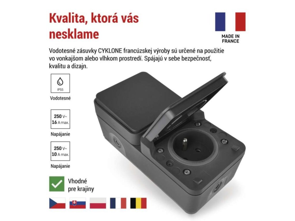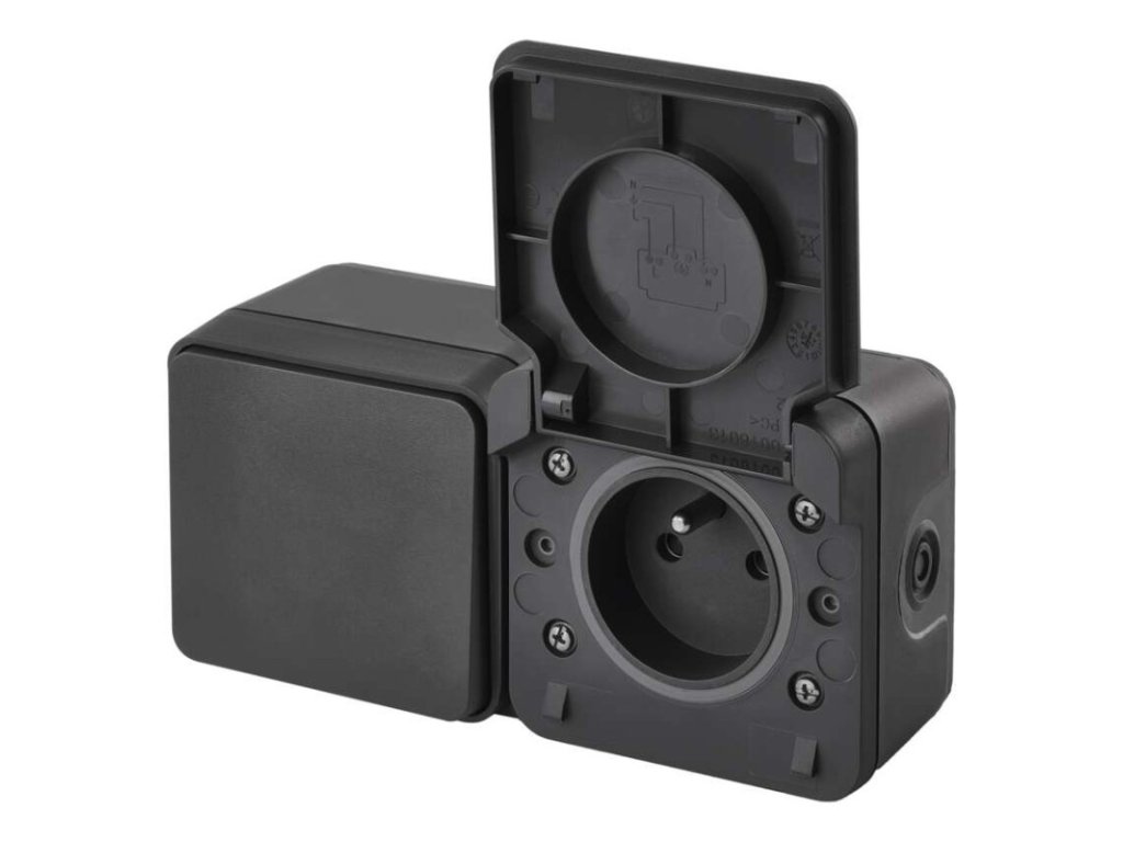 design: Cyklone|farba: sivá|krytie: IP55|napätie: zásuvka 250 V ~ / 16 A max .; prepínač 250V ~, 10AX|podsvietenie: nie|predajný obal: 1 ks|prevedenie: 2 nás. vodeodolné - 1 × zásuvka + 1 × prepínač striedavý|produkt: kombinácia prepínača striedavého č. 6 a zásuvky jednonásobnéj s ochranným kolíkom a viečkom|prúd: 16 A/10 AX|spôsob montáže: na stenu|typ pripojenia: automatická svorka|značka: DEBFLEXDodatočné parametre