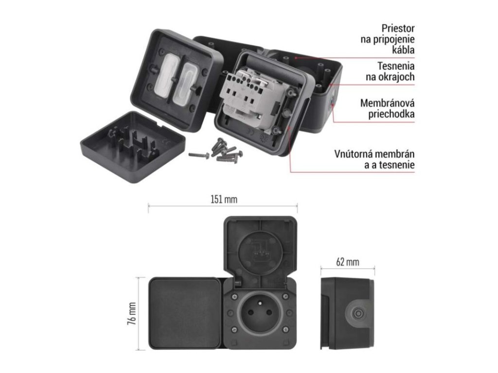 | prevedenie: | 2 nás. vodeodolné - 1 × zásuvka + 1 × prepínač striedavý |
