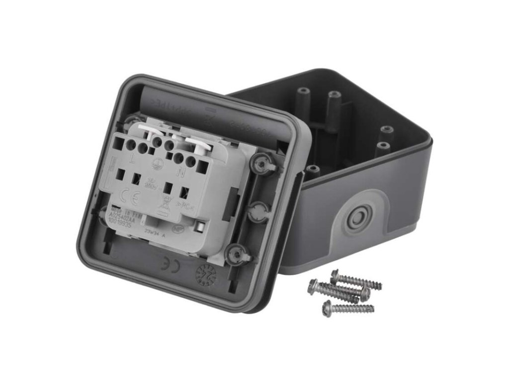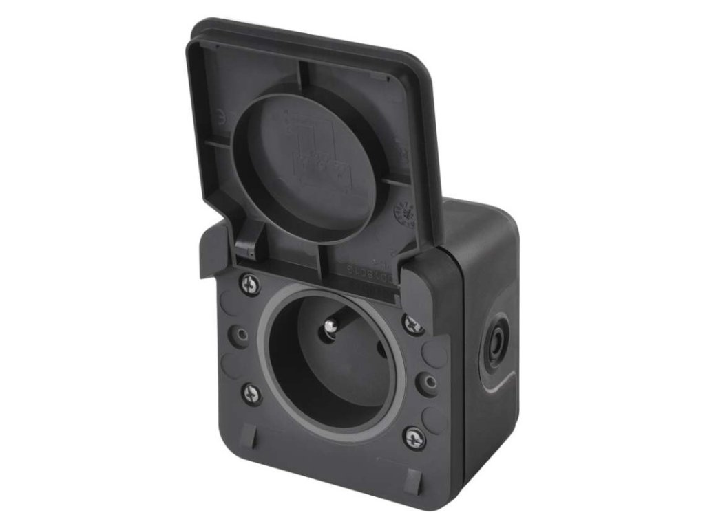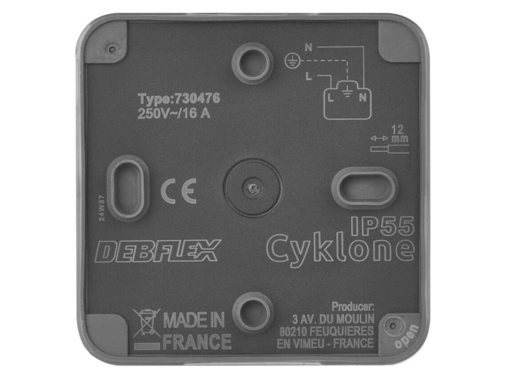 design: Cyklone|farba: sivá|krytie: IP55|napätie: 250 V~/16 A max.|podsvietenie: nie|predajný obal: 1 ks|prevedenie: 1 nás. vodeodolná|produkt: zásuvka jednonásobná s ochranným kolíkom a detskými clonky|prúd: 16 A|spôsob montáže: na stenu|typ pripojenia: automatická svorka|značka: DEBFLEXDodatočné parametre