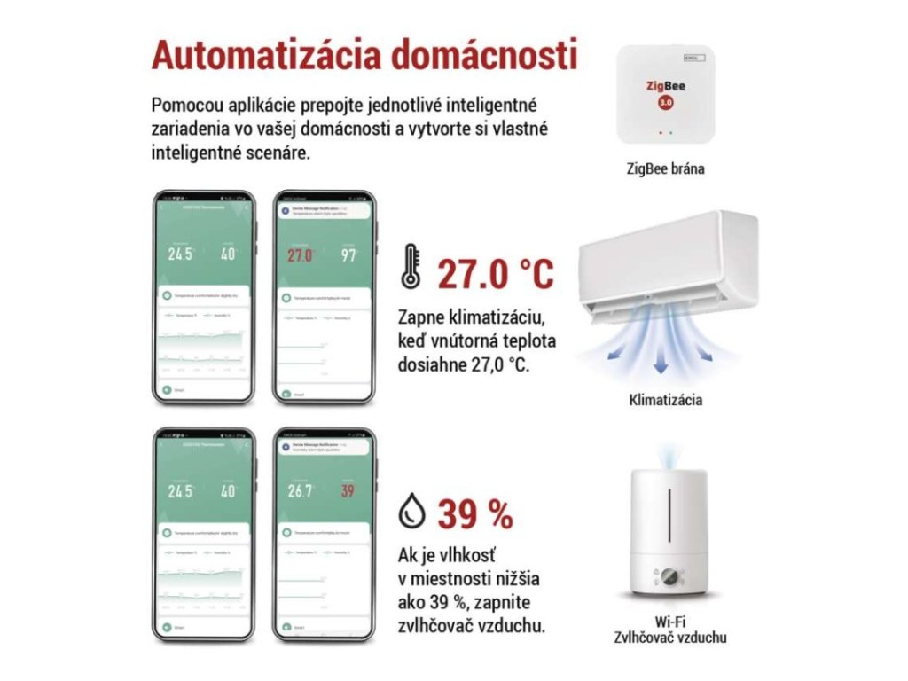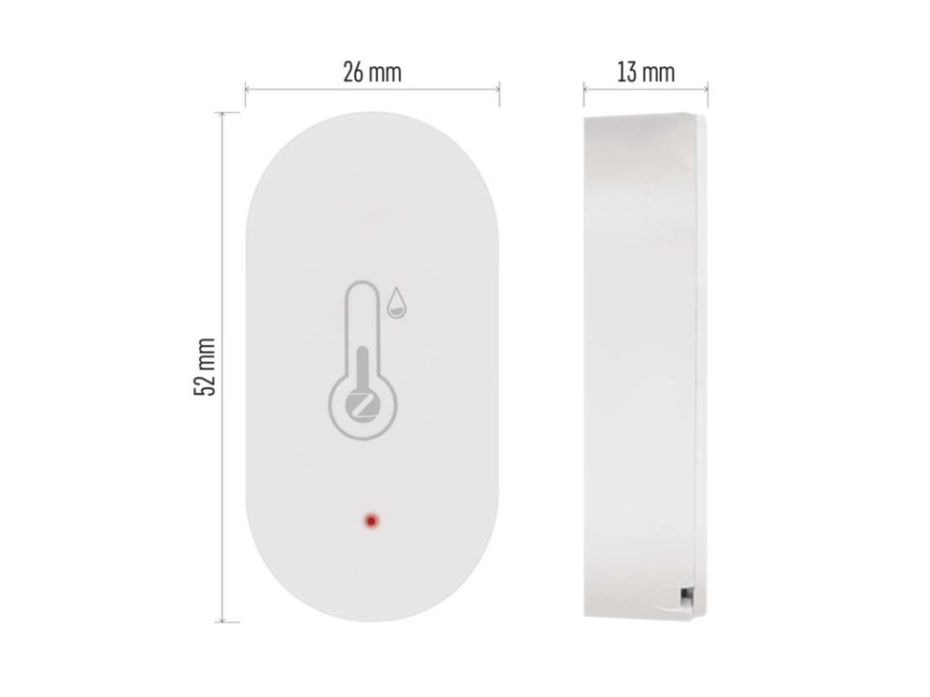12/24 formát času: nie|budík: nie|časové pásma: nie|ďalšie funkcie: –|dátum: nie|dosah vo voľnom priestore: nie|drôtová sonda k čidlu: nie|farebný displej (black mask) podsvietený: nie|funkcie stopky: nie|hlasová komunikácia: –|hodiny: nie|inštalačný materiál: –|jazyky aplikácie: EN, CZ, SK, PL, DE, HU, SI, FR, + 60 ďalších jazykov|kalendár: nie|kompatibilita: EMOS GoSmart, TUYA, LIDL, Smartlife, otvorený systém|LED podsvietenie displeja: nie|magnet na pripevnenie: nie|min. a max. teplota: nie|možné ďalšie čidlo: nie|možnosť nastavenia jednotky teploty °C/°F: áno|možnosť zavesenia na stenu: áno|napájanie čidla: nie|napájanie stanice: 1× 3 V CR2032 (súčasťou balenia)|notifikácie do mobilnej aplikácie: áno|odpočet času max. od: nie|opakované budenie: nie|ovládanie hlasovými asistentmi: ano (Amazon Alexa, Google Assistant)|pamäť poslednej hodnoty: nie|podporované OS: Android, iOS|predajný obal: 1 ks, krabička|prenosová frekvencia: nie|prevedenie teplomera: bezdrôtové – smart|protokol: Zigbee 3.0|rozmer čidla: nie|rozmer hlavnej jednotky: 26 × 13 × 52 mm|sieťový adaptér: nie|teplotná výstraha: áno|teplotný index: nie|trend teploty: nie|trend tlaku: nie|trvalé podsvietenie: nie|veľkosť displeja: nie|vnútorná teplota: -20 °C až +60 °C, rozlíšenie 0,1 °C|vnútorná vlhkosť: 0 % až 99 % RV, rozlíšenie 1 %|vonkajšia teplota: nie|vonkajšia vlhkosť: nieDodatočné parametre