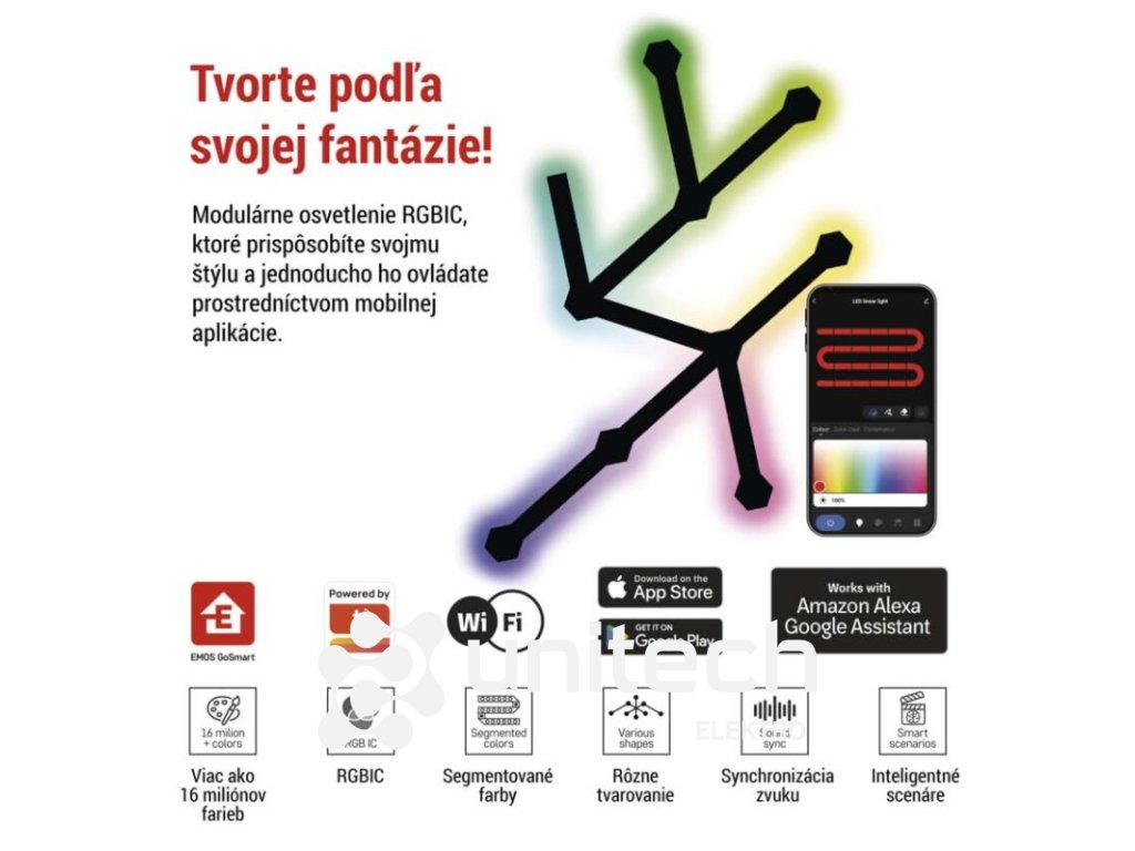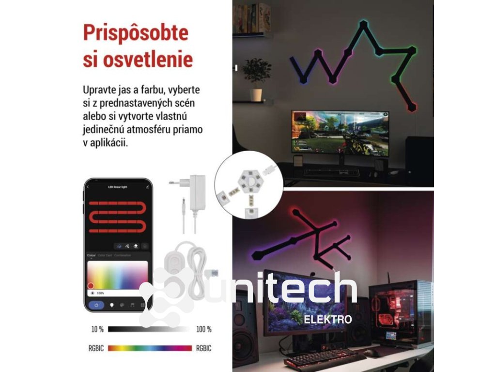 dĺžka: –|dĺžka prívodu: 1,5 m|energetická trieda dodávaného svetelného zdroja: –|farba svetla: RGBIC|farba tela: čierna|jazyky aplikácie: EN, CZ, SK, PL, DE, HU, SI, FR, + 60 ďalších jazykov|kategória: –|kompatibilita: EMOS GoSmart, Tuya, Lidl, Smartlife|krytie: IP20|materiál difúzora: plast|materiál tela: plast|maximálny počet segmentov: 18|nastavenia farieb (RGB): áno|nastavenie teploty farieb: nie|notifikácie do mobilnej aplikácie: áno|ovládanie hlasovými asistentmi: áno (Amazon, Alexa, Google Assistant)|počet segmentov: 18|počet spínacích cyklov: –|podporované OS: iOS, Android|predajný obal: 1 ks, krabička|prenosová frekvencia: 2,4 GHz (IEEE 802.11b/g/n)|príkon: 34 W|protokol: WIFI + BLE|rada: GoSmart|RGB digital: áno|šírka: –|stmievanie: áno|svetelná účinnosť: –|svetelný tok: –|svetelný zdroj je súčasťou balenia: –|technológia: LED|teplota chromatičnosti: –|tvar: –|vstupné napätie: 220–240 V~/50 Hz|výška: –|záručná doba: 2 roky|životnosť: 20 000 hodínDodatočné parametre