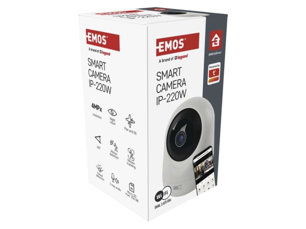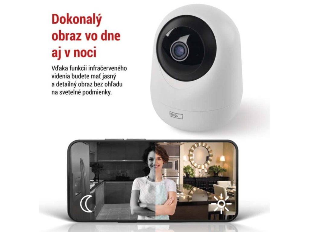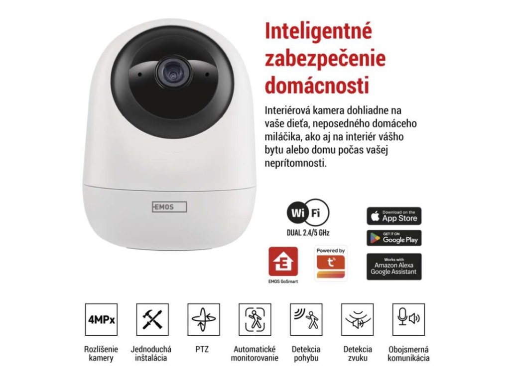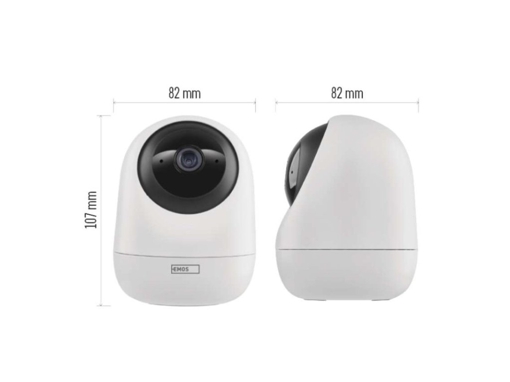 automatické ukladanie obrázkov: áno|ďalšie funkcie: –|detekcia pohybu: áno|detekcia zvuku: áno|dosah detekcie pohybu: 10 metrov|farba: biela, čierna|funkcia WebRTC: áno|hlasová komunikácia: obojsmerný|hĺbka: 82 mm|inštalačný materiál: áno|IR CUT: áno|jazyky aplikácie: EN, CZ, SK, PL, DE, HU, SI, FR, + 60 ďalších jazykov|kompatibilita: EMOS GoSmart, TUYA, LIDL, Smartlife, otvorený systém|krytie: IP20|maximálny dosvit nočného videnie: 10 metrov|montáž: na stenu + na postavenie|motorizované otáčanie: áno|napájanie kamery: DC 5 V/1 A (súčasť balenia)|nastavenie oblasti detekcie: áno|nočné videnie: áno|notifikácie do mobilnej aplikácie: áno|obsah balenia: 1× kamera, 1× napájací adaptér, 1× kábel USB, 1× držiak, 1× lepiaca páska, 1× skrutky, 1× príručka|ochrana proti odcudzeniu: blokované aplikáciou|ovládanie hlasovými asistentmi: áno (Amazon Alexa, Google Assistant)|podpora ONVIF: áno|podporované OS: Android, iOS|predajný obal: 1 ks, papierová krabička|prenosová frekvencia: 2,4 GHz/5 GHz Dual Band|prídavné svetlo LED: áno|prídavný vnútorný monitor: nie|protokol: Wi-Fi|rozlíšenie kamery: 2 560 × 1 440|rozpoznávanie ľudského tela: áno|rozpoznávanie zvierat: nie|séria: GoSmart|siréna: nie|šírka: 82 mm|sledovanie pohybu (tracking): áno|snímací prvok kamery: 1/3.0'' 4Megapixel CMOS|súkromný (privátny) režim: áno|typ držiaka: statívový závit|typ produktu: IP kamera|uhol detekcie pohybu: 100°|uhol záberu kamery: 100°|ukladanie na cloud: áno|ukladanie na kartu SD: áno|uskutočniť hovor pomocou tlačidla: nie|výdrž batérie: –|výška: 107 mm|záručná doba: 2 roky|zdroj súčasťou balenia: ánoDodatočné parametre