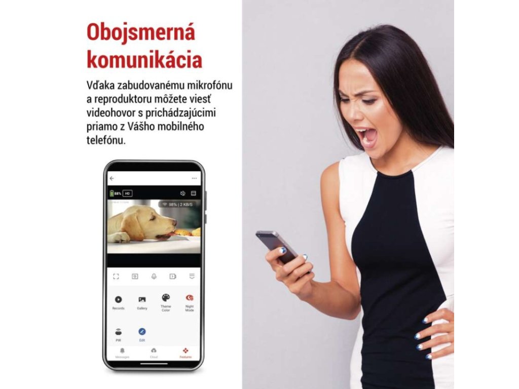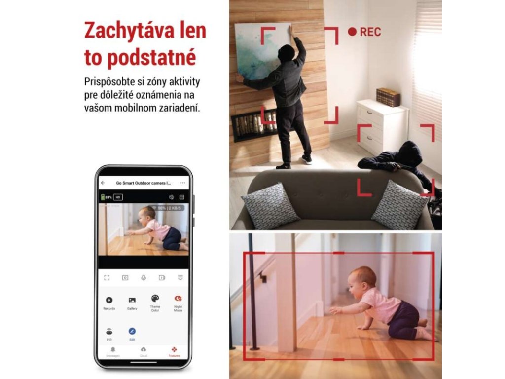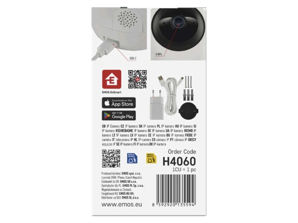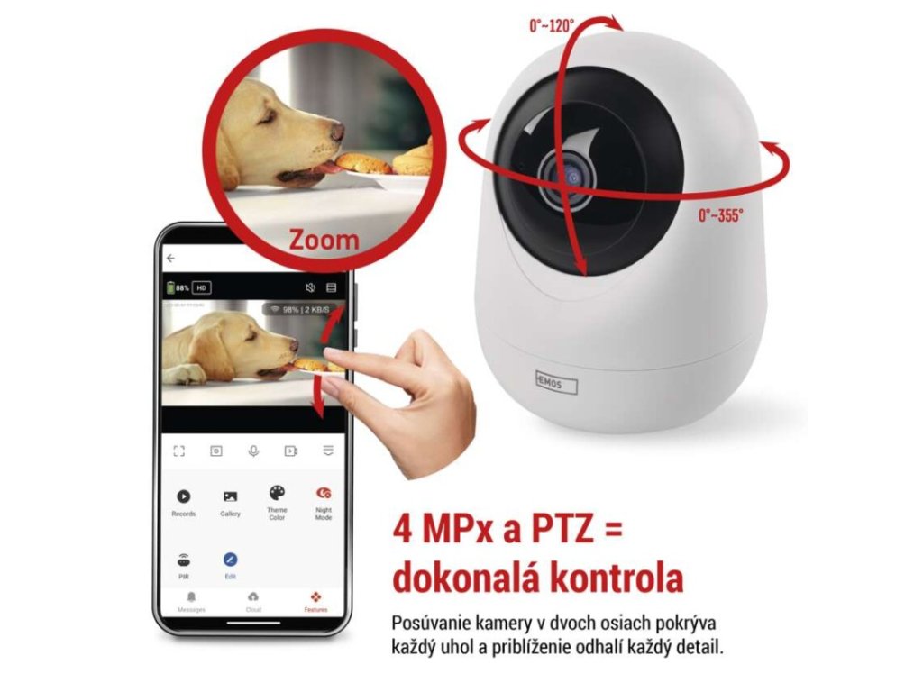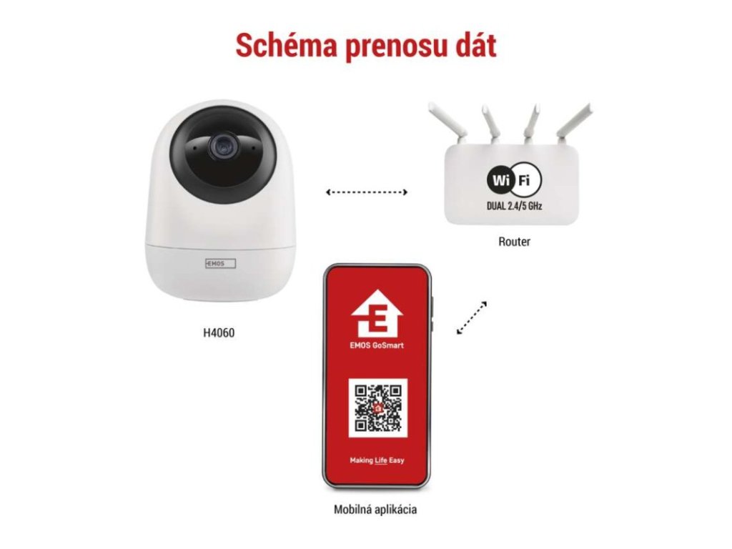automatické ukladanie obrázkov: áno|ďalšie funkcie: –|detekcia pohybu: áno|detekcia zvuku: áno|dosah detekcie pohybu: 10 metrov|farba: biela, čierna|funkcia WebRTC: áno|hlasová komunikácia: obojsmerný|hĺbka: 82 mm|inštalačný materiál: áno|IR CUT: áno|jazyky aplikácie: EN, CZ, SK, PL, DE, HU, SI, FR, + 60 ďalších jazykov|kompatibilita: EMOS GoSmart, TUYA, LIDL, Smartlife, otvorený systém|krytie: IP20|maximálny dosvit nočného videnie: 10 metrov|montáž: na stenu + na postavenie|motorizované otáčanie: áno|napájanie kamery: DC 5 V/1 A (súčasť balenia)|nastavenie oblasti detekcie: áno|nočné videnie: áno|notifikácie do mobilnej aplikácie: áno|obsah balenia: 1× kamera, 1× napájací adaptér, 1× kábel USB, 1× držiak, 1× lepiaca páska, 1× skrutky, 1× príručka|ochrana proti odcudzeniu: blokované aplikáciou|ovládanie hlasovými asistentmi: áno (Amazon Alexa, Google Assistant)|podpora ONVIF: áno|podporované OS: Android, iOS|predajný obal: 1 ks, papierová krabička|prenosová frekvencia: 2,4 GHz/5 GHz Dual Band|prídavné svetlo LED: áno|prídavný vnútorný monitor: nie|protokol: Wi-Fi|rozlíšenie kamery: 2 560 × 1 440|rozpoznávanie ľudského tela: áno|rozpoznávanie zvierat: nie|séria: GoSmart|siréna: nie|šírka: 82 mm|sledovanie pohybu (tracking): áno|snímací prvok kamery: 1/3.0'' 4Megapixel CMOS|súkromný (privátny) režim: áno|typ držiaka: statívový závit|typ produktu: IP kamera|uhol detekcie pohybu: 100°|uhol záberu kamery: 100°|ukladanie na cloud: áno|ukladanie na kartu SD: áno|uskutočniť hovor pomocou tlačidla: nie|výdrž batérie: –|výška: 107 mm|záručná doba: 2 roky|zdroj súčasťou balenia: ánoDodatočné parametre