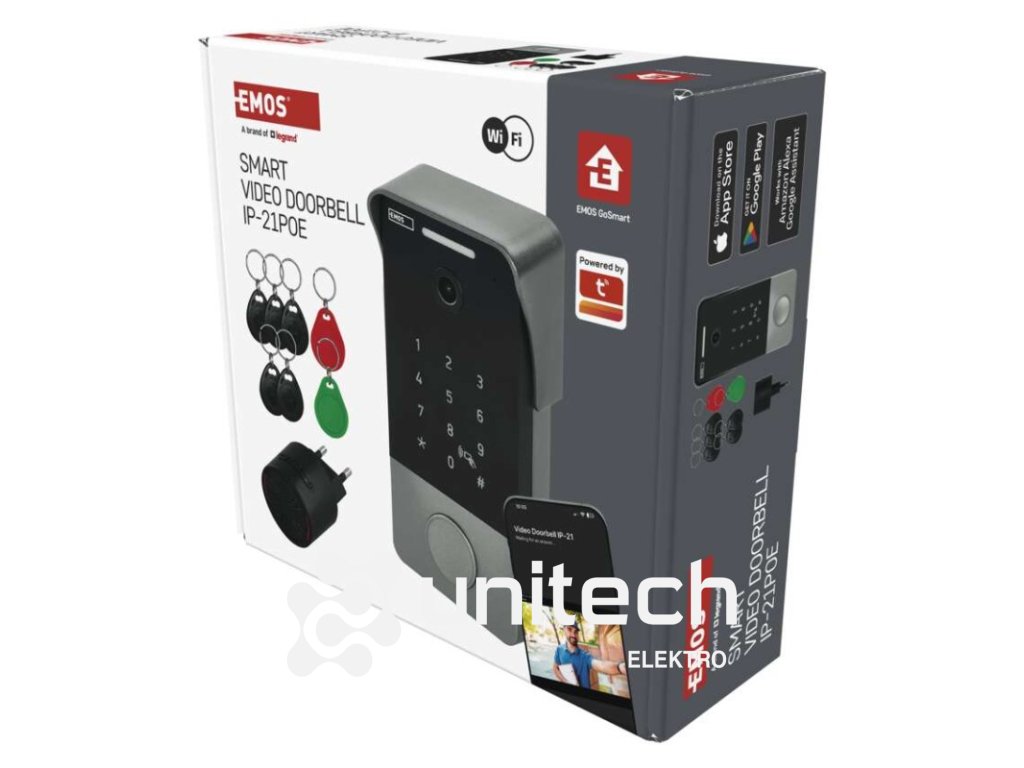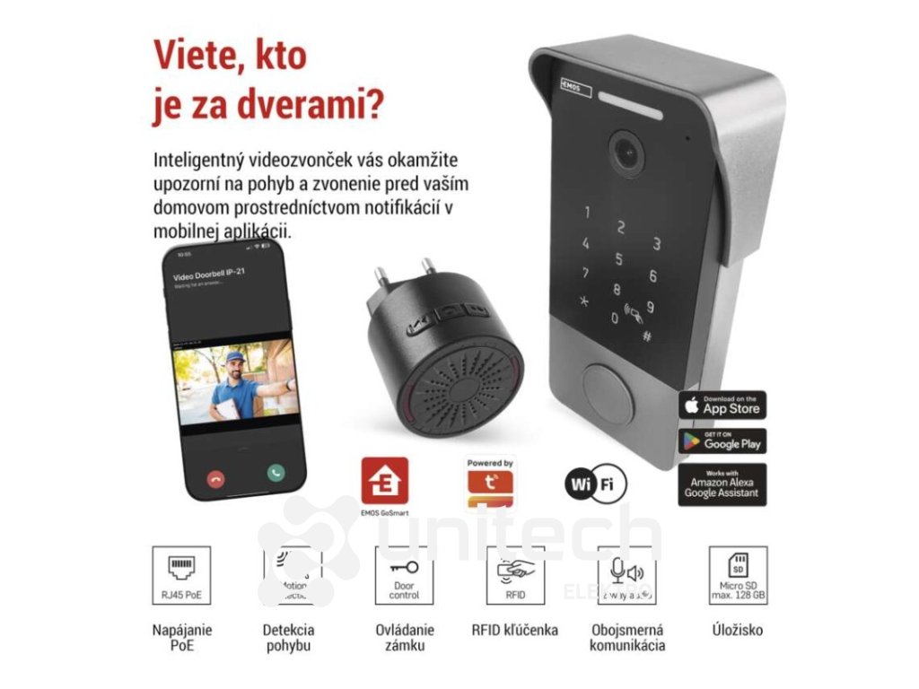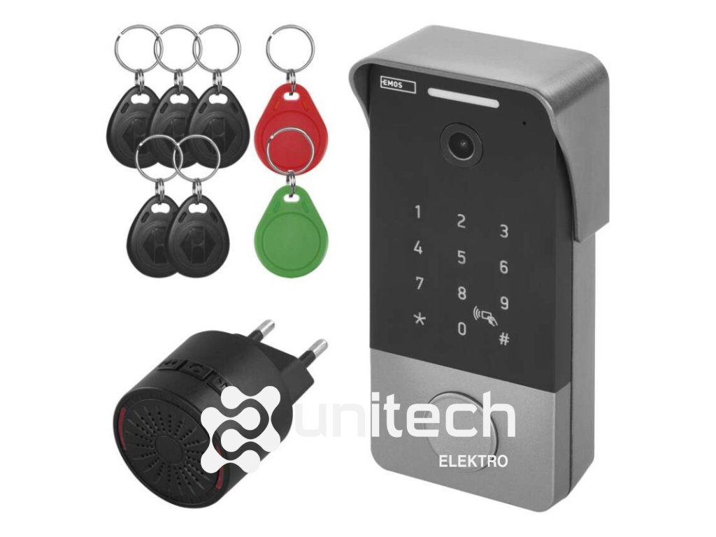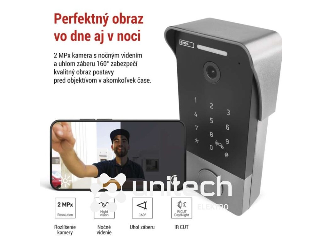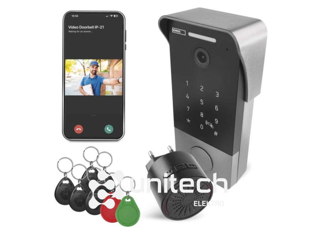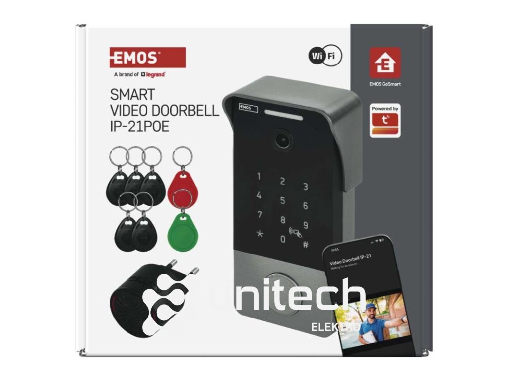 antivandal prevedenie kamerovej jednotky: áno|automatické ukladanie obrázkov: áno|ďalšie funkcie: –|detekcia pohybu: áno|dodatočný vnútorný zvonček: áno|farba: sivá|funkcia WebRTC: áno|hlasová komunikácia: obojsmerný|IR CUT: áno|jazyky aplikácie: EN, CZ, SK, PL, DE, HU, SI, FR, + 60 ďalších jazykov|kompatibilita: EMOS GoSmart, TUYA, LIDL, Smartlife, otvorený systém|krytie: IP44|maximálny dosvit nočného videnie: 10 metrov|montáž: na stenu|možnosť pripojenia ďalších kamier: nie|napájanie kamerovej jednotky: 12-48V DC / PoE|napájanie pre vnútorný zvonček: 230V AC|nočné videnie: áno|notifikácie do mobilnej aplikácie: áno|obsah balenia: 1× video zvonček, 1× vnútorný gong, 1× napájací adaptér, 1× redukcia napájania, 1× poe injektor, 1× montážna sada, 7× RFID kľúčenka|ochrana proti odcudzeniu: áno|odporúčané zapojenie: UTP / FTP kábel (RJ45)|ovládanie hlasovými asistentmi: –|ovládanie pojazdu brány: nie|ovládanie zámku: áno|počet melódií vnútorného zvona: 10|počet tlačidiel kamerovej jednotky: 1|podporované OS: Android, iOS|predajný obal: 1 ks, krabica|prenosová frekvencia: 2,4 GHz WIFI (IEEE802.11b/g/n)|protokol: Wi-Fi|regulácia hlasitosti: áno|rozlíšenie kamery: 1 920 × 1 080|rozmer kamerovej jednotky: 140 × 69 × 38 mm|siréna: nie|snímací prvok kamery: 1/2,9" CMOS GC2053|typ produktu: video zvonček|uhol záberu kamery: 160°|ukladanie na cloud: áno|ukladanie na kartu SD: áno|záručná doba: 2 roky|zdroj súčasťou balenia: ánoDodatočné parametre