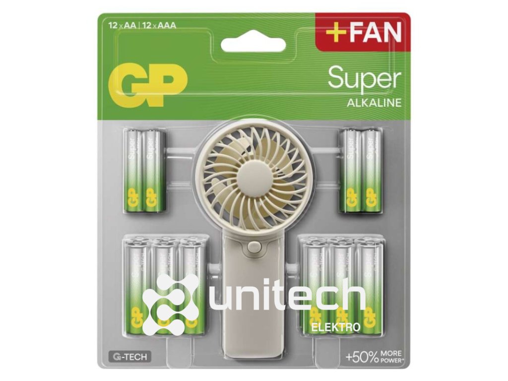 chemické zloženie: alkalické|hmotnosť: 840 g|kapacita: neuvádza sa|kategória/rada: Super Alkaline|max. skladovateľnosť: 10 rokov|možnosť nabíjania: nie|napätie: 1,5 V|počet nabíjacích cyklov: nenabíjacie|predajný obal: 12 ks AA+12 ks AAA + ventilátor, blister|prevádzková teplota: -18 °C až +50 °C|rozmer: 168 × 192 × 32 mm|typové označenie: LR6 + LR03|veľkosť batérie: AA, AAA|značka: GPDodatočné parametre