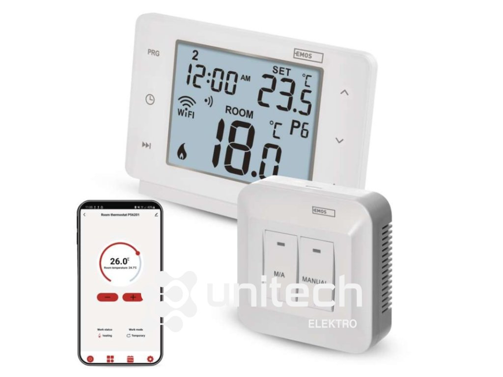 dĺžka kapilárneho čidla: neuvádza sa|dosah vo voľnom priestore: 100 m|druh regulácie: vykurovací a chladiaci systém|farba: biela|funkcia ON/OFF: áno|funkcia prázdniny: áno|funkcia Set-back: nie|jazyky aplikácie: EN, CZ, SK, PL, DE, HU, SI, FR, + 60 ďalších jazykov|kalibrácia teploty: áno|kompatibilita: EMOS GoSmart, TUYA, LIDL, Smartlife, otvorený systém|meranie teploty: 0 °C až 40 °C, rozlíšenie 0,1 °C|možnosť prepojenia s ďalšími detektormi: neuvádza sa|napájanie: neuvádza sa|napájanie brány: neuvádza sa|napájanie prijímača: 230 V AC|napájanie vysielača: 5 V USB adaptér (súčasťou balenia)|nastavenie teploty: 5 ° C až 35 ° C, po 0,5 ° C|nastaviteľný rozptyl teploty: 0,2 °C do 2 °C (rozlíšenie 0,1 °C)|notifikácie do mobilnej aplikácie: áno|ochrana proti zamrznutiu: áno|ovládanie hlasovými asistentmi: áno (Amazon Alexa, Google Assistant)|počet programov: užívateľsky nastaviteľná teplota (6× za deň)|podporované OS: Android, iOS|podsvietený displej: áno|pracovná frekvencia: 868 MHz|predajný obal: 1 ks, krabička|prenosová frekvencia: 2,4 GHz WIFI (IEEE802.11b/g/n)|protokol: Wi-Fi|rozmer: neuvádza sa|rozmer brány: neuvádza sa|rozmer prijímača: 37 × 86 × 86 mm|rozmer vysielača: 40 × 138 × 96 mm|spínaná záťaž: 16 A odporovo, 4 A induktívne|spínanie: 230 V AC alebo beznapäťové|súčasť balenia: neuvádza sa|typ nastavenia teploty: 6 teplotných zmien denne|typ ovládania: programovateľný elektronický izbový termostat, možnosť ovládania cez mobil (iOS, Android)|typ termostatu: bezdrôtovýDodatočné parametre