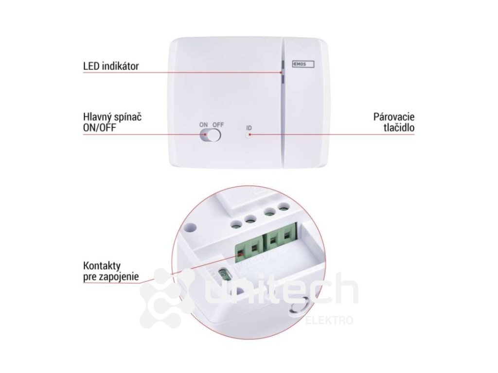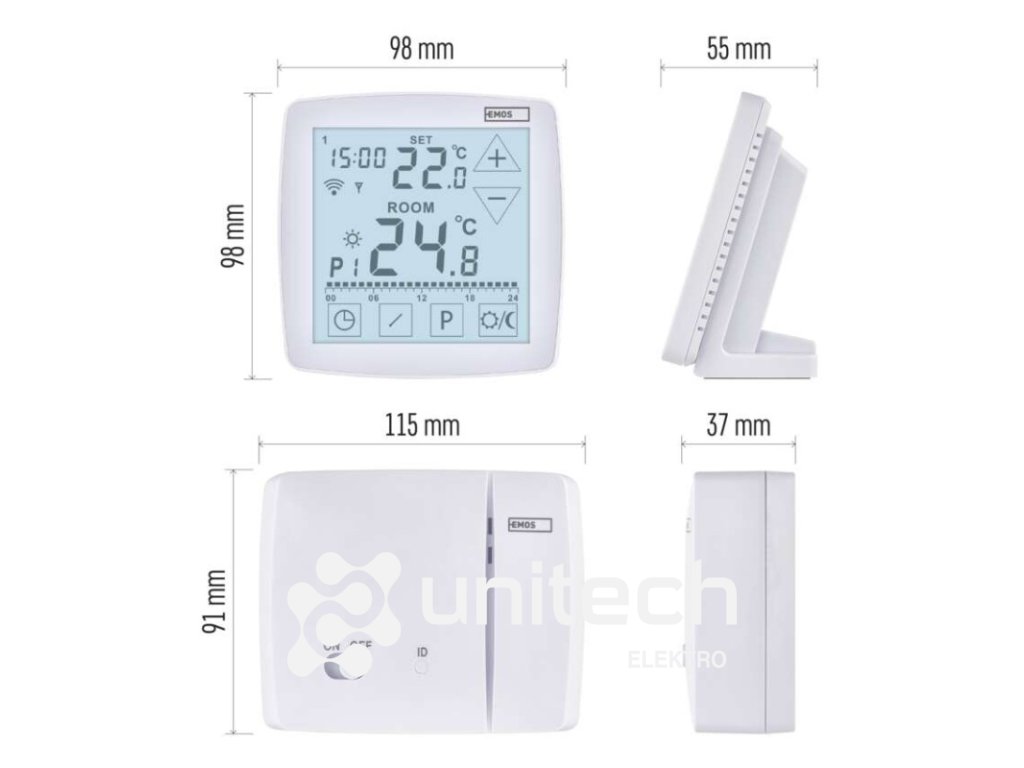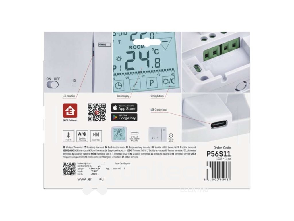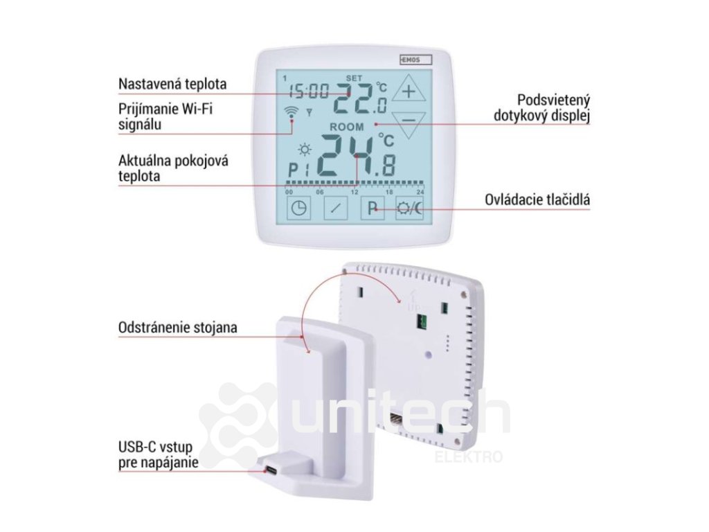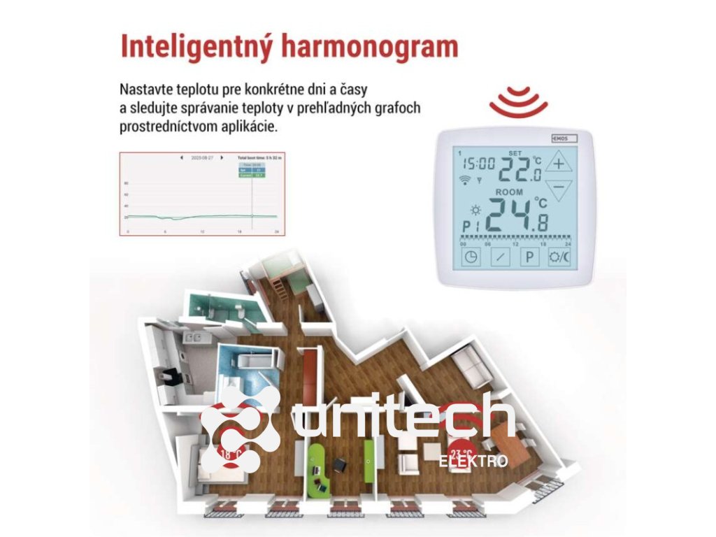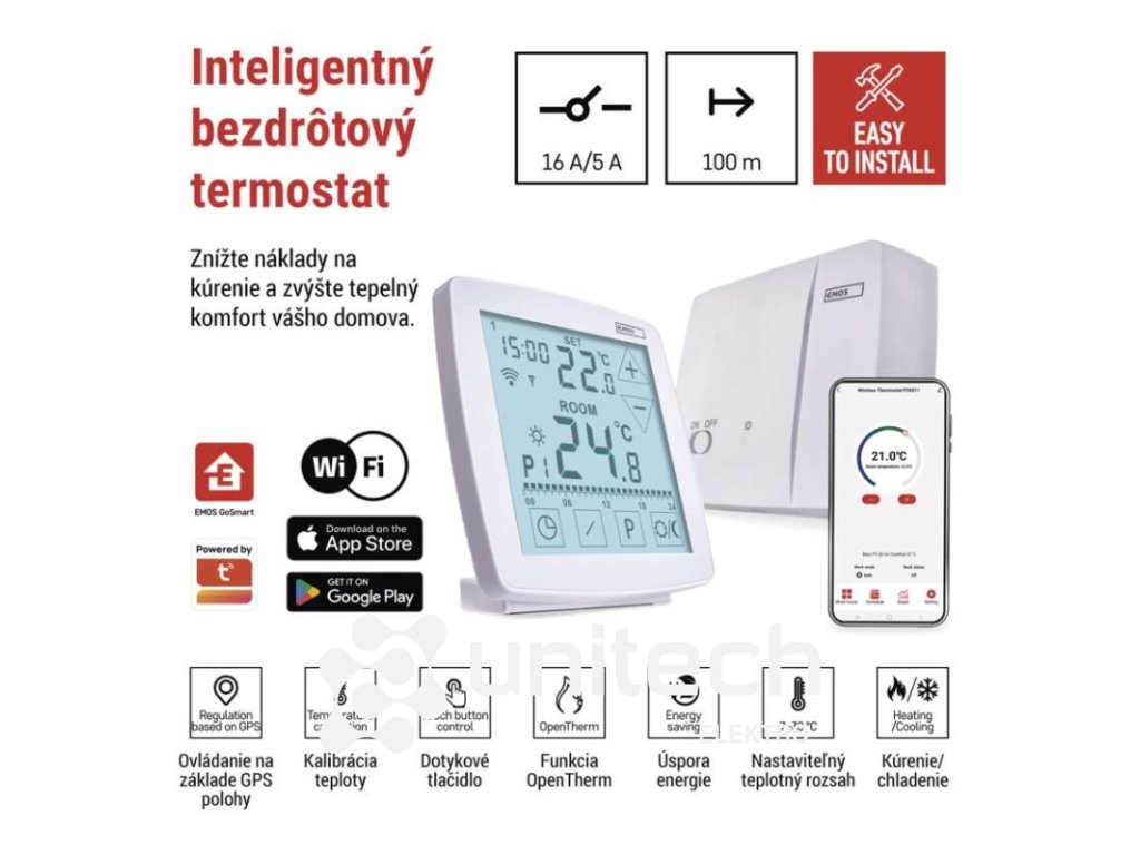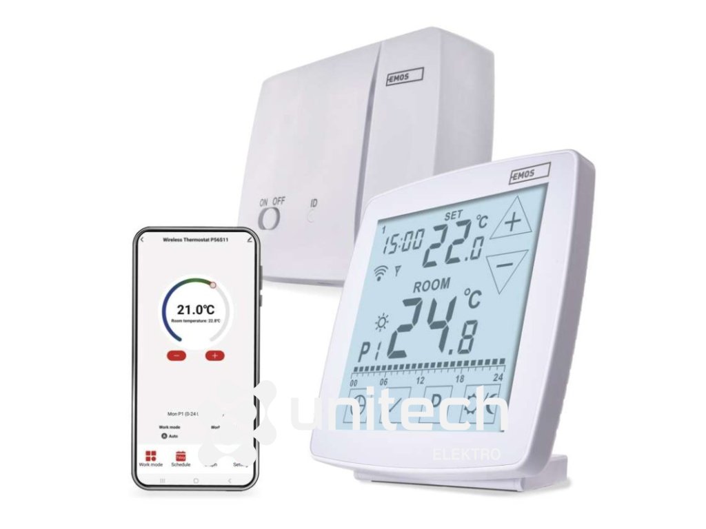 dĺžka kapilárneho čidla: –|dosah vo voľnom priestore: 100 m|druh regulácie: vykurovací a chladiaci systém|farba: biela|funkcia ON/OFF: áno|funkcia prázdniny: áno|funkcia Set-back: nie|jazyky aplikácie: EN, CZ, SK, PL, DE, HU, SI, FR, + 60 ďalších jazykov|kalibrácia teploty: áno|kompatibilita: EMOS GoSmart, TUYA, LIDL, Smartlife, otvorený systém|meranie teploty: 0 °C až 40 °C, rozlíšenie 0,1 °C|možnosť prepojenia s ďalšími detektormi: nie|napájanie: –|napájanie brány: –|napájanie prijímača: 230 V AC|napájanie vysielača: 5 V USB adaptér (súčasťou balenia)|nastavenie teploty: 7 ° C až 30 ° C, po 0,2 ° C|nastaviteľný rozptyl teploty: #|notifikácie do mobilnej aplikácie: áno|ochrana proti zamrznutiu: áno|ovládanie hlasovými asistentmi: áno (Amazon Alexa, Google Assistant)|počet programov: 6 + 3 užívateľsky nastaviteľné|podlahový senzor: –|podporované OS: Android, iOS|podsvietený displej: áno|pracovná frekvencia: 868 MHz|predajný obal: 1 ks, krabička|prenosová frekvencia: 2,4 GHz WIFI (IEEE802.11b/g/n)|protokol: Wi-Fi|rozmer: –|rozmer brány: –|rozmer prijímača: 115 × 37 × 91 mm|rozmer vysielača: 98 × 55 × 98 mm|spínaná záťaž: 16 A odporovo, 5 A induktívne|spínanie: 230 V AC alebo beznapäťové|súčasť balenia: –|typ nastavenia teploty: komfortná a úsporná teplota|typ ovládania: programovateľný elektronický izbový termostat, možnosť ovládania cez mobil (iOS, Android)|typ termostatu: bezdrôtový s OpenTherm komunikáciouDodatočné parametre
