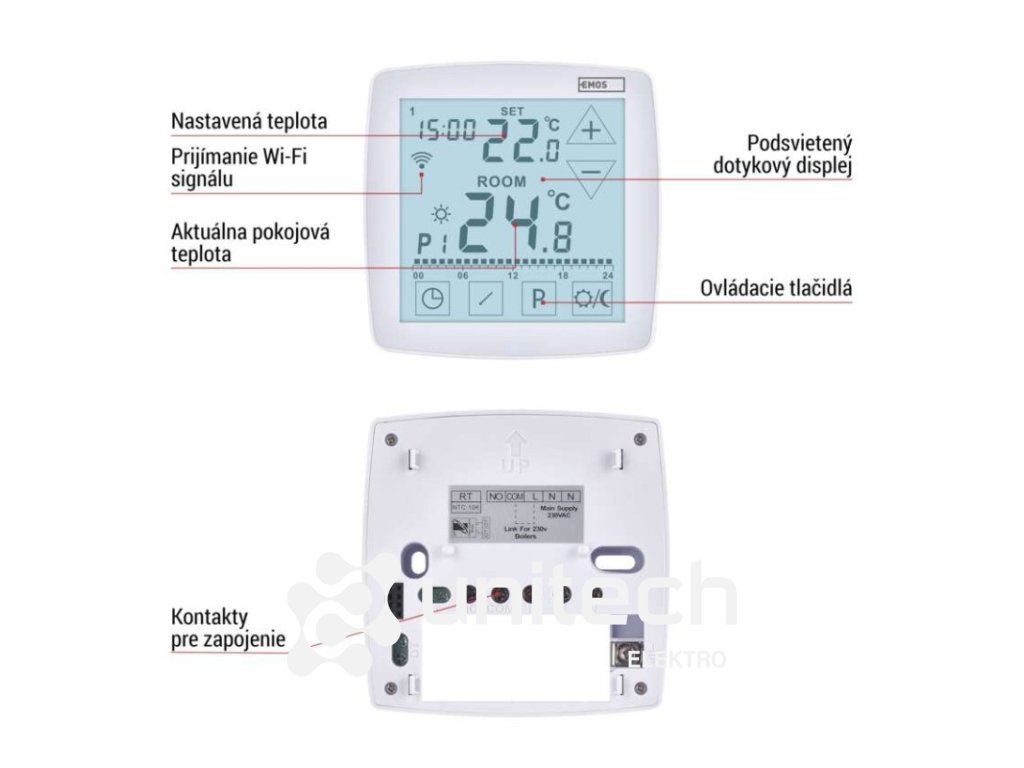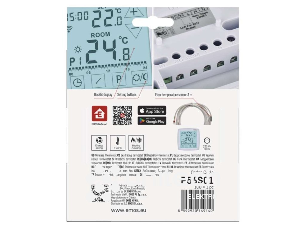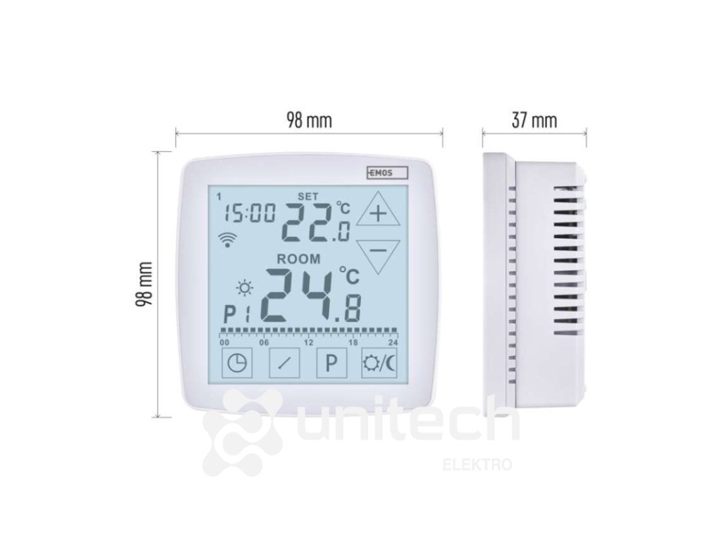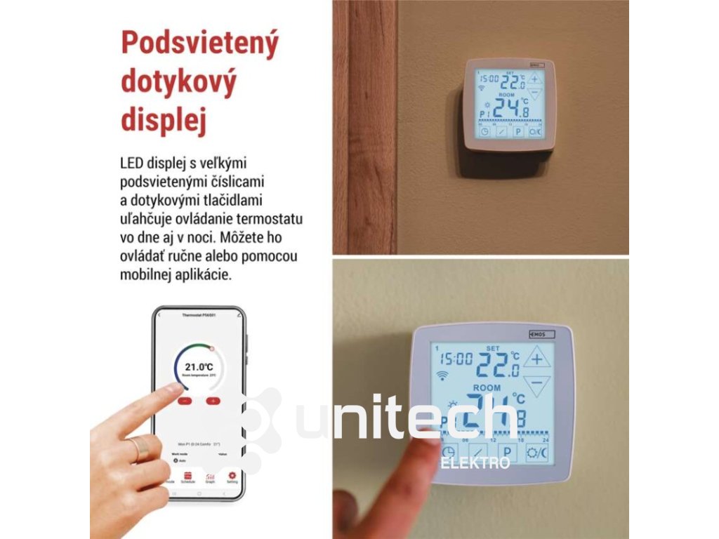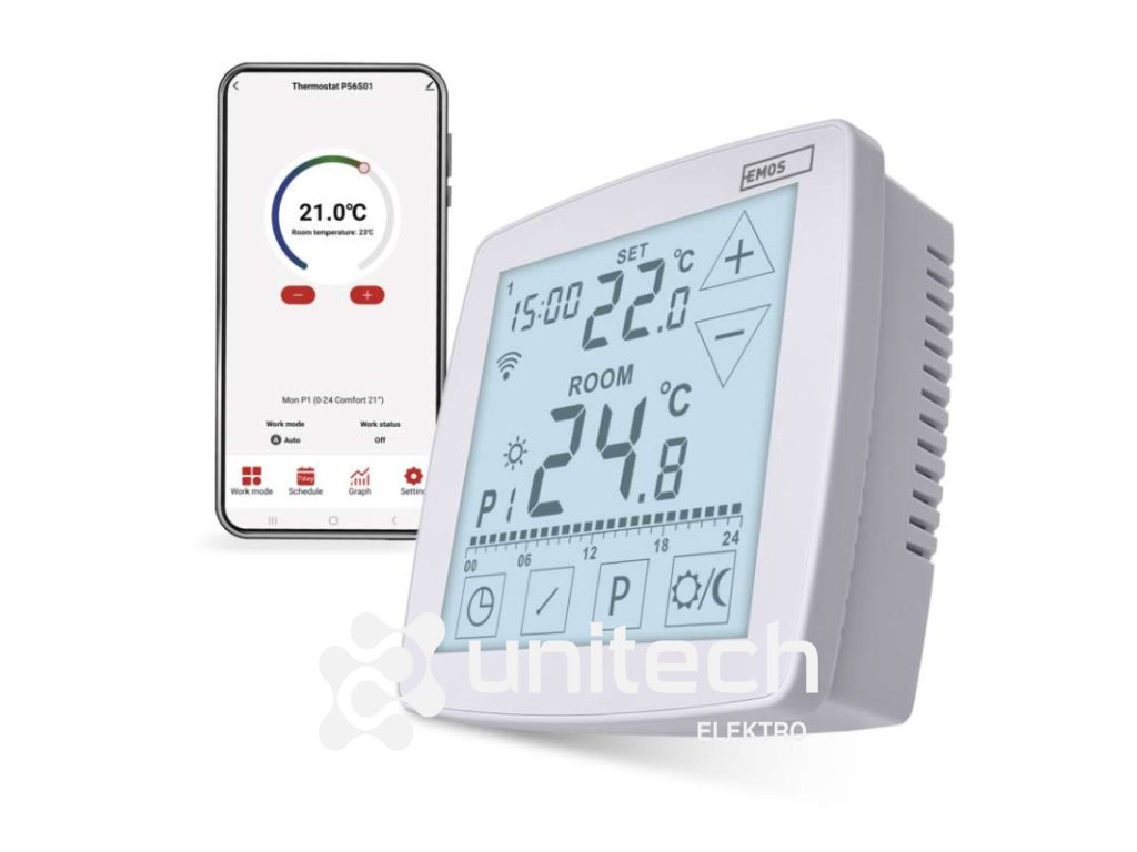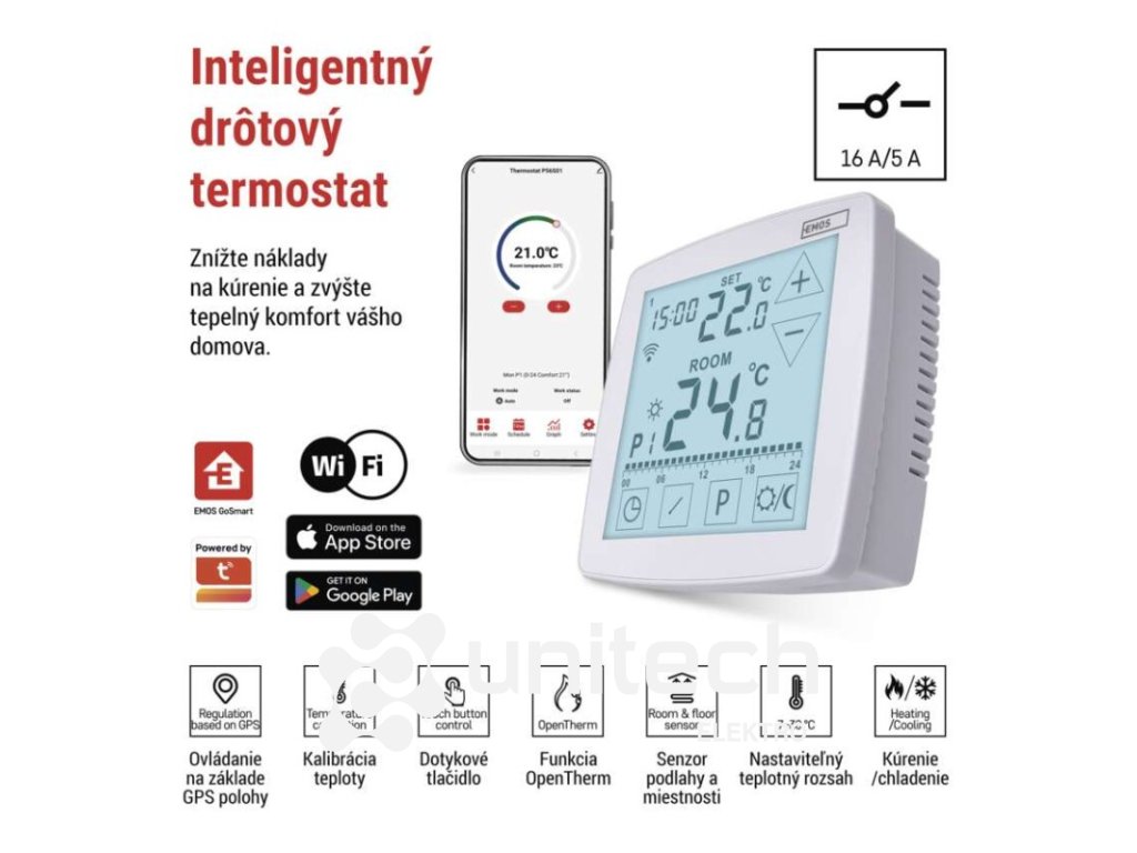 dĺžka kapilárneho čidla: –|dosah vo voľnom priestore: –|druh regulácie: vykurovací a chladiaci systém|farba: biela|funkcia ON/OFF: áno|funkcia prázdniny: áno|funkcia Set-back: nie|jazyky aplikácie: EN, CZ, SK, PL, DE, HU, SI, FR, + 60 ďalších jazykov|kalibrácia teploty: áno|kompatibilita: EMOS GoSmart, TUYA, LIDL, Smartlife, otvorený systém|meranie teploty: 0 °C až 40 °C, rozlíšenie 0,1 °C|možnosť prepojenia s ďalšími detektormi: nie|napájanie: 230 V AC|napájanie brány: –|napájanie prijímača: –|napájanie vysielača: –|nastavenie teploty: 7 ° C až 30 ° C, po 0,2 ° C|nastaviteľný rozptyl teploty: #|notifikácie do mobilnej aplikácie: áno|ochrana proti zamrznutiu: áno|ovládanie hlasovými asistentmi: áno (Amazon Alexa, Google Assistant)|počet programov: 6 + 3 užívateľsky nastaviteľné|podlahový senzor: NTC 10 kΩ, 3 m|podporované OS: Android, iOS|podsvietený displej: áno|pracovná frekvencia: –|predajný obal: 1 ks, krabička|prenosová frekvencia: 2,4 GHz WIFI (IEEE802.11b/g/n)|protokol: Wi-Fi|rozmer: 98 × 37 × 98 mm|rozmer brány: –|rozmer prijímača: –|rozmer vysielača: –|spínaná záťaž: 16 A odporovo, 5 A induktívne|spínanie: 230 V AC alebo beznapäťové|súčasť balenia: termostat, podlahové čidlo 3 m, Ø 8 mm|typ nastavenia teploty: komfortná a úsporná teplota|typ ovládania: programovateľný elektronický izbový termostat, možnosť ovládania cez mobil (iOS, Android)|typ termostatu: drôtový s OpenTherm komunikáciou + podlahové kúrenieDodatočné parametre