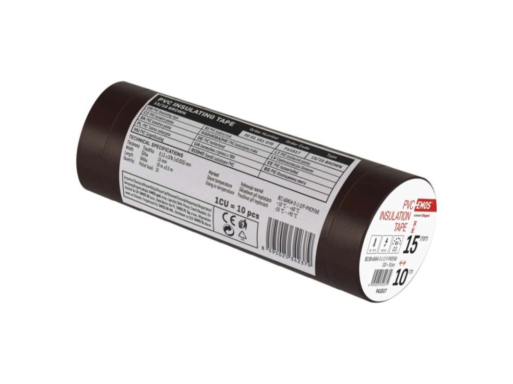 dĺžka návinu: 10 m|elektrická pevnosť minimálne: 40 kV/mm|elektrická pevnosť po vlhku minimálne: 35 kV/mm|farba: hnedá|hrúbka pásky: 0,13 mm|integrovaná textilná sieťka: nie|materiál lepidla: kaučuk|odolné UV: áno|odporúčaná skladovacia teplota: 10–45 °C|pevnosť v ťahu: 150 N/10 mm|potlač: bez potlače|predajný obal: 10 ks, fólia|predĺženie minimálne: 125 %|predpokladané použitie: izolácia káblov|priľnavosť k oceli minimálne: 1,8 N/10 mm|priľnavosť k podkladu: 1,5 N/10 mm|rozmer: 60 × 15 mm|rozsah inštalačných teplôt: -25–90 °C|samozhášavé: nie|šírka pásky: 15 mm|skúška plameňom: <1 sec|spĺňa smernicu REACH: áno|spĺňa smernicu ROHS: áno|typ pásky: PVC|vodotesný spoj: áno|vyhovuje norme: ČSN EN 60454-3-1-2/F-PVC/60|vytvára tlakotesný spoj: nieDodatočné parametre