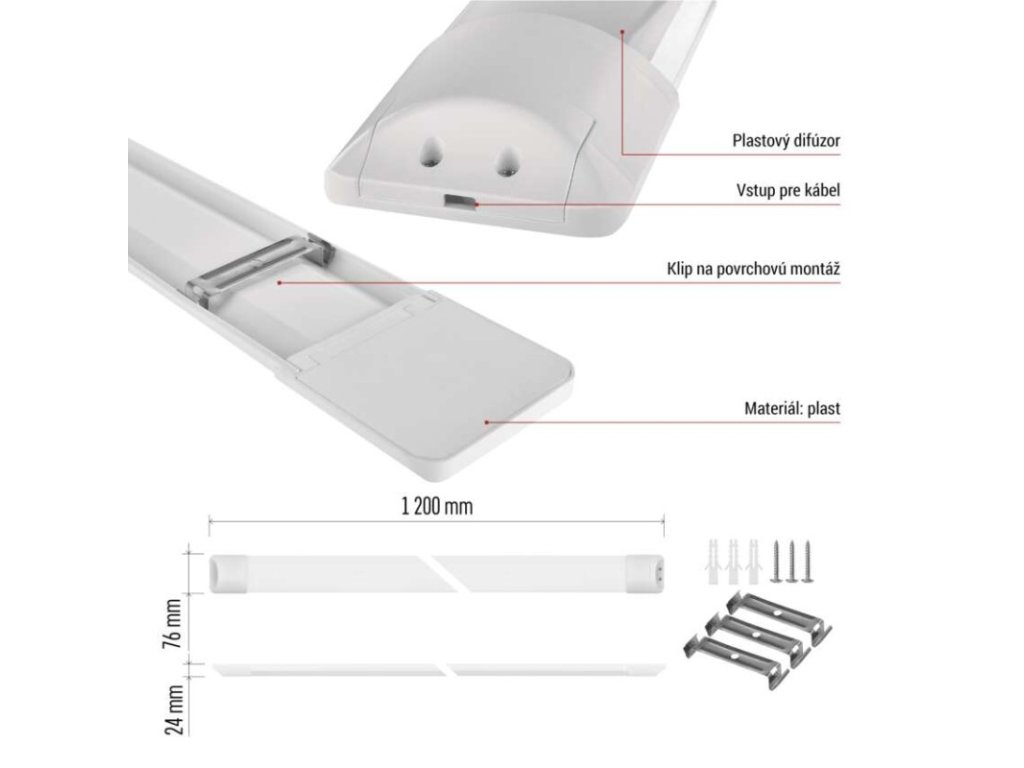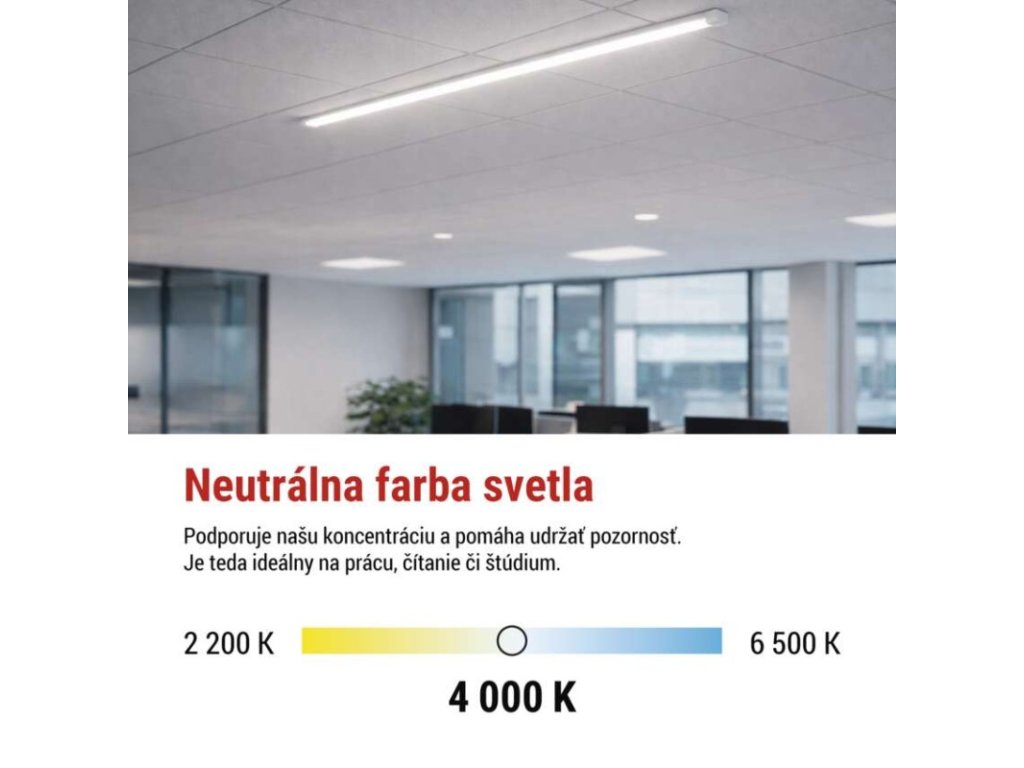 farba svetla: neutrálna biela|farba tela: biela|frekvencia: 50/60 Hz|index podania farieb (CRI): Ra >80|krytie: IP20|materiál: plast (PC)|materiál difúzora: plast (PC)|materiál spon: nemá spony|materiál tela: plast (PC)|možnosť stmievania: nie|náhrada za žiarovku: neuvádza sa|napätie: 220–240 V~|predajný obal: 1 ks, krabica|priebežná monáž: neuvádza sa|príkon: 40 W|prúd: 180 mA|rozmer: 1 200 × 75,5 × 24,5 mm|rozsah pracovnej teploty: -20 °C až +40 °C|stupeň ochrany proti mechanickým nárazom: IK06|svetelný tok: 4 400 lm|svetelný tok v núdzovom režime: neuvádza sa|teplota chromatičnosti: 4 000 K|trieda ochrany: II|typ difúzora: mliečny|typ montáže: prisadená|typ riadenia: neuvádza sa|uhol vyžarovania: 120°|výdrž batérie: neuvádza sa|záručná doba: 2 roky|záruka na batériu: neuvádza sa|zdroj svetla: LED|životnosť: 25 000 hodínDodatočné parametre