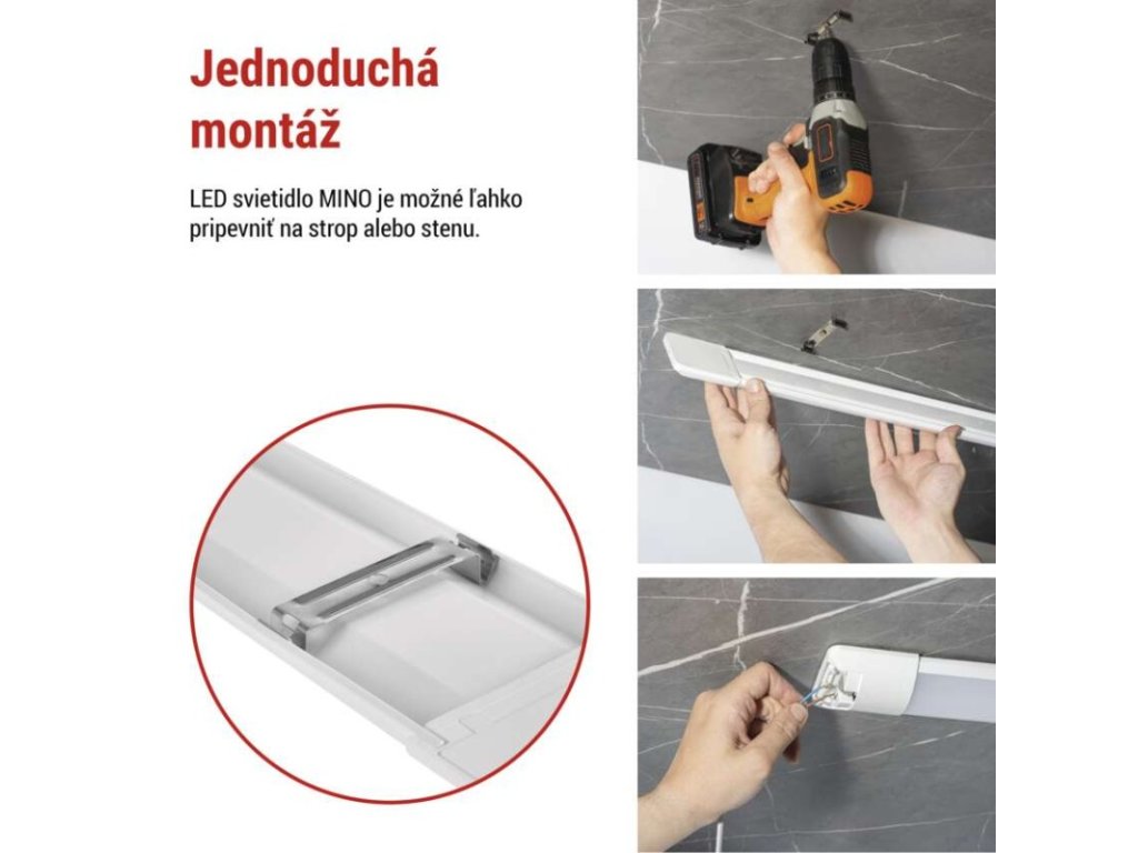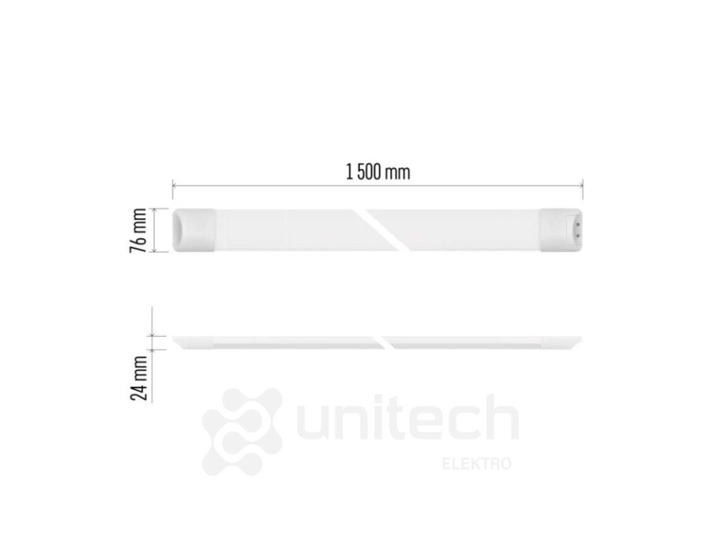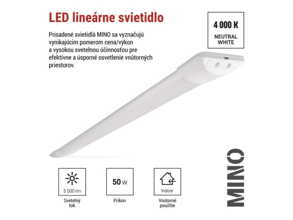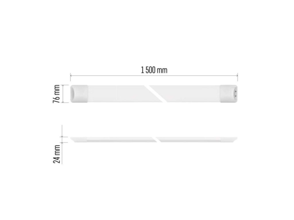 farba svetla: neutrálna biela|farba tela: biela|frekvencia: 50/60 Hz|index podania farieb (CRI): Ra >80|krytie: IP20|materiál: plast (PC)|materiál difúzora: plast (PC)|materiál spon: nemá spony|materiál tela: plast (PC)|možnosť stmievania: nie|náhrada za žiarovku: neuvádza sa|napätie: 220–240 V~|predajný obal: 1 ks, krabica|priebežná monáž: neuvádza sa|príkon: 50 W|prúd: 225 mA|rozmer: 1 500 × 75,5 × 24,5 mm|rozsah pracovnej teploty: -20 °C až +40 °C|stupeň ochrany proti mechanickým nárazom: IK06|svetelný tok: 5 500 lm|svetelný tok v núdzovom režime: neuvádza sa|teplota chromatičnosti: 4 000 K|trieda ochrany: II|typ difúzora: mliečny|typ montáže: prisadená|typ riadenia: neuvádza sa|uhol vyžarovania: 120°|výdrž batérie: neuvádza sa|záručná doba: 2 roky|záruka na batériu: neuvádza sa|zdroj svetla: LED|životnosť: 25 000 hodínDodatočné parametre