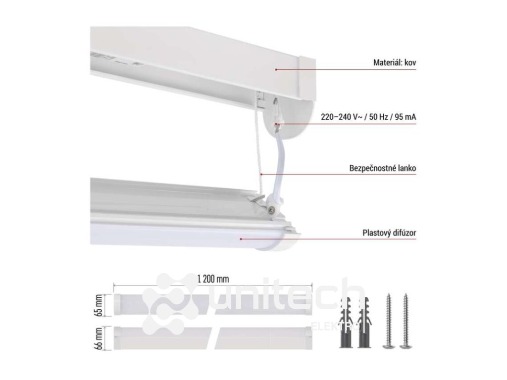 farba svetla: neutrálna biela|farba tela: biela|frekvencia: 50/60 Hz|index podania farieb (CRI): Ra >80|krytie: IP20|materiál: plast/kov|materiál difúzora: plast (PC)|materiál spon: nemá spony|materiál tela: oceľový plech|možnosť stmievania: nie|náhrada za žiarovku: neuvádza sa|napätie: 220–240 V|predajný obal: 1 ks, krabica|priebežná monáž: áno|príkon: 20–25–35–40 W|prúd: 180 mA|rozmer: 1 200 × 65 × 66 mm|rozsah pracovnej teploty: -20 °C až +40 °C|stupeň ochrany proti mechanickým nárazom: IK06|svetelný tok: 5 600 lm|svetelný tok v núdzovom režime: neuvádza sa|teplota chromatičnosti: 4 000 K|trieda ochrany: I|typ difúzora: mliečny|typ montáže: prisadená, závesná, na stenu|typ riadenia: neuvádza sa|uhol vyžarovania: 120°|výdrž batérie: neuvádza sa|záručná doba: 5 rokov|záruka na batériu: neuvádza sa|zdroj svetla: LED|životnosť: 50 000 hodínDodatočné parametre