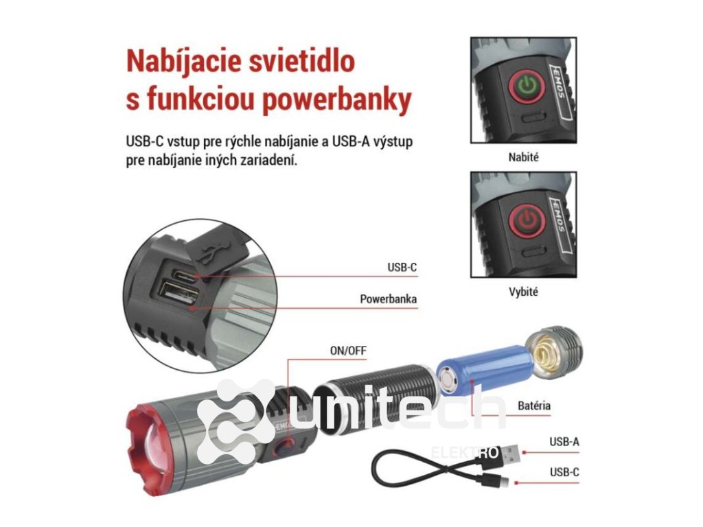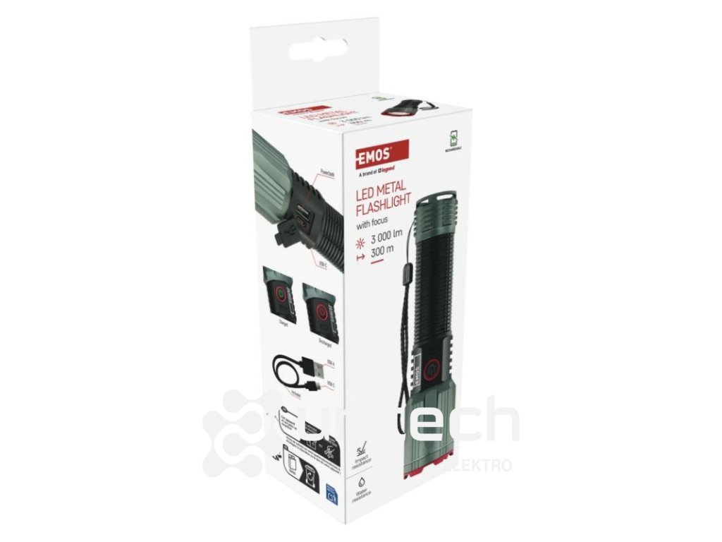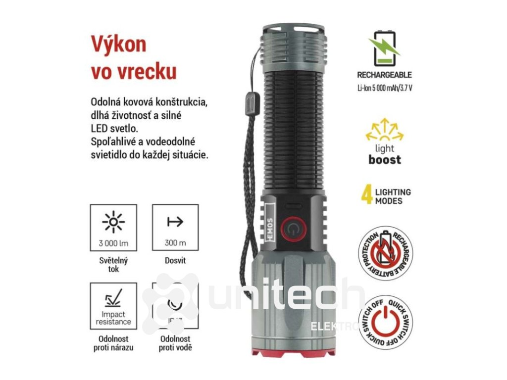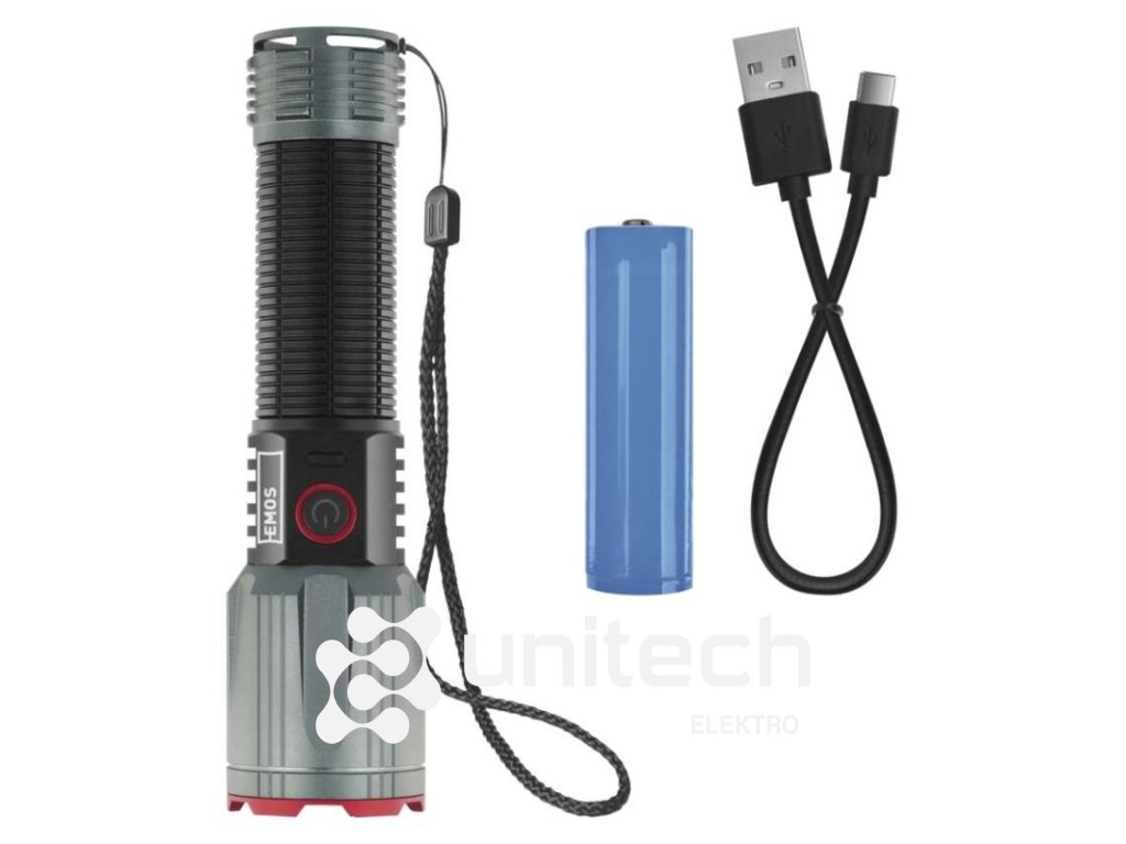 batérie súčasťou balenia: áno|doba nabíjania: 6 h|doba svietenia: 3,5–15 h|doba svietenia detail: LED BOOST – 1 min, LED 100 % – 3,5 h, LED 50 % – 7 h, LED 20 % – 15 h|dosvit: LED BOOST – 300 m, LED 100 % – 230 m, LED 50 % – 170 m, LED 20 % – 120 m|farba: čierna, metalická sivá|fokus: áno|hmotnosť: 360 g|LED indikácia nabíjania: áno|LED indikácia stavu akumulátora: áno|materiál: hliník|maximálny dosvit: 300 m|maximálny svetelný tok: 3 000 lm|nabíjací: áno|napájanie: Li-Ion 26650|nárazuvzdornosť: áno|počet režimov svietenia: 4|predajný obal: 1 ks, krabica|príslušenstvo: neuvádza sa|režimy: LED BOOST, LED 100 %, LED 50 %, LED 20 %|rozmer: 175 × 45 × 45 mm|špeciálna funkcia: funkcia rýchleho vypnutia, funkcia ochrany batérie, funkcia powerbanky|svetelný tok: LED BOOST – 3 000 lm, LED 100 % – 2 000 lm, LED 50 % – 1 000 lm, LED 20 % – 500 lm|typ batérie: 5 000 mAh/3,7 V|typ napájacieho konektoru: USB-C|vodeodolná: áno (IP43)|vybavenie: pútko|záručná doba: 2 roky|zdroj svetla: LED|značka: EMOSDodatočné parametre