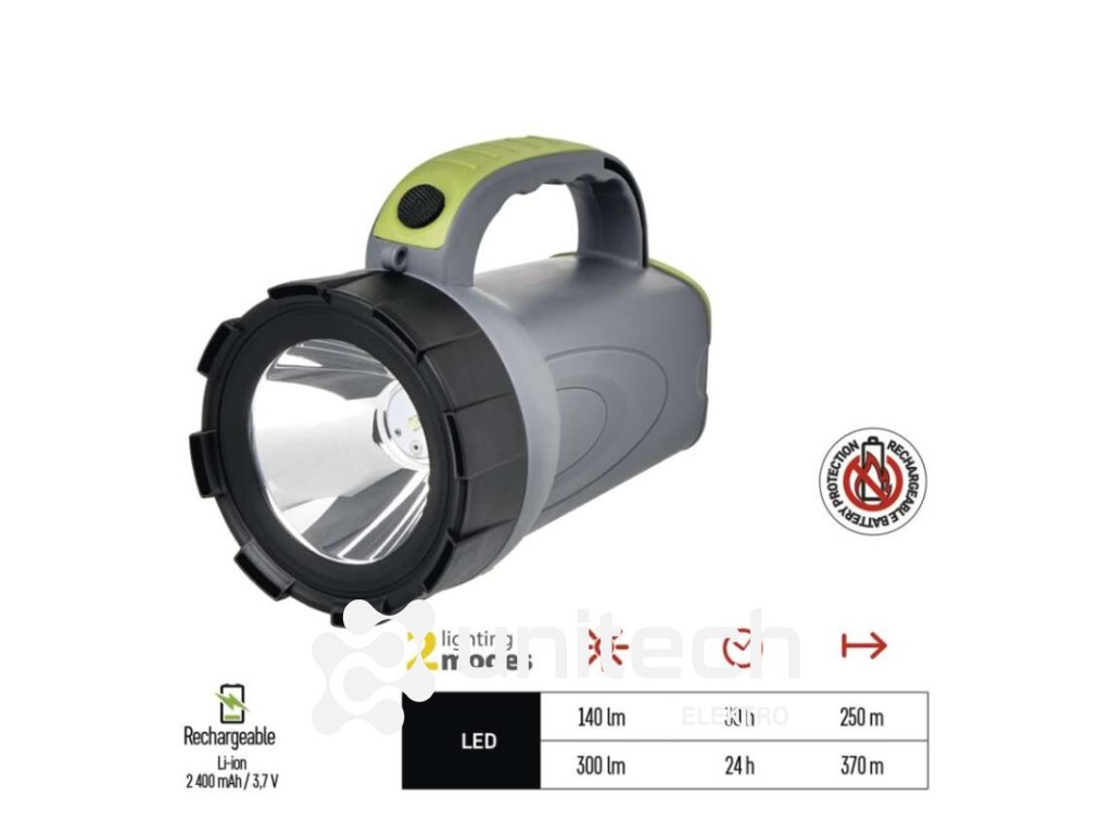 batérie súčasťou balenia: áno|doba nabíjania: 4,5 h|doba svietenia: 24–30 h|doba svietenia detail: LED 50 % – 30 h, LED 100 % – 24 h|dosvit: LED 50 % – 250 m, LED 100 % – 370 m|farba: sivo-čierno-zelená|fokus: nie|hmotnosť: 275 g|LED indikácia nabíjania: áno|LED indikácia stavu akumulátora: nie|materiál: ABS plast|maximálny dosvit: 370 m|maximálny svetelný tok: 300 lm|nabíjací: áno|napájanie: Li-Ion akupack|nárazuvzdornosť: nie|počet režimov svietenia: 2|predajný obal: 1 ks, krabica|príslušenstvo: napájací adaptér, adaptér do automobilu, popruh na rameno|režimy: LED 50 %, LED 100 %|rozmer: 162 × 100 × 140 mm|špeciálna funkcia: funkcia ochrany batérie|svetelný tok: LED 50 % – 140 lm, LED 100 % – 300 lm|typ batérie: 2 400 mAh/3,7 V|typ napájacieho konektoru: neuvádza sa|vodeodolná: nie|vybavenie: neuvádza sa|záručná doba: 2 roky|zdroj svetla: OSRAM LED|značka: EMOSDodatočné parametre