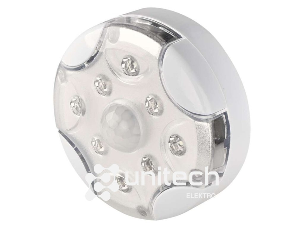 automatické zapnutie/vypnutie: áno|časové oneskorenie: 25 sekúnd +/- 5 sekúnd|farba svetla: studená biela|fotosenzor: áno|maximálny dosvit: 15 m|maximálny svetelný tok: 60 lm|max. výstup 1× USB: neuvádza sa|max. výstup celkom: neuvádza sa|napájanie: 3× 1,5 V AA|natáčanie: nie|ochrana proti preťaženiu, prepätiu a skratu: neuvádza sa|počet USB výstupov: neuvádza sa|pohybové čidlo: áno|predajný obal: 1 ks, blister|režimy: on/off/auto|rozmer: 90 × 37 mm|vypínač: áno|zdroj svetla: 8× LED priemer 5 mmDodatočné parametre