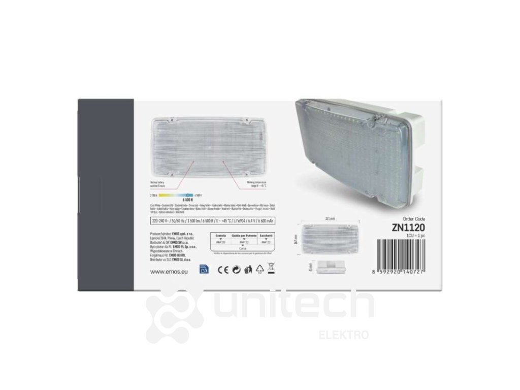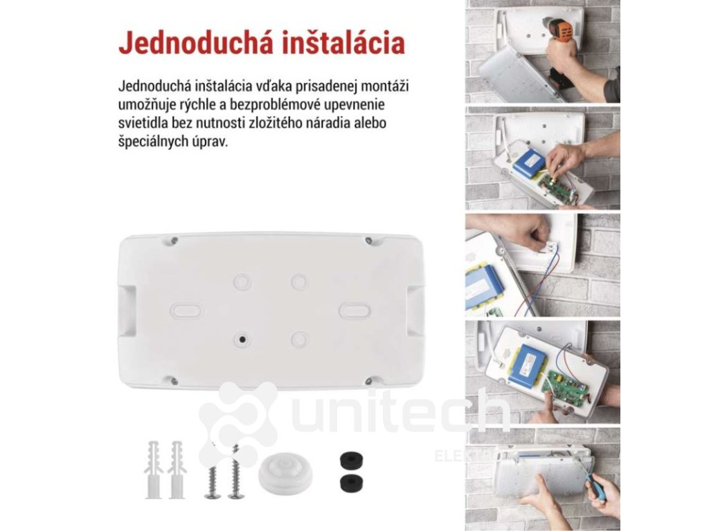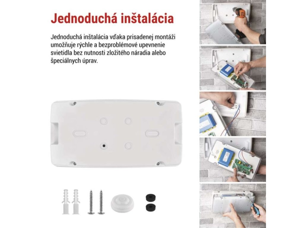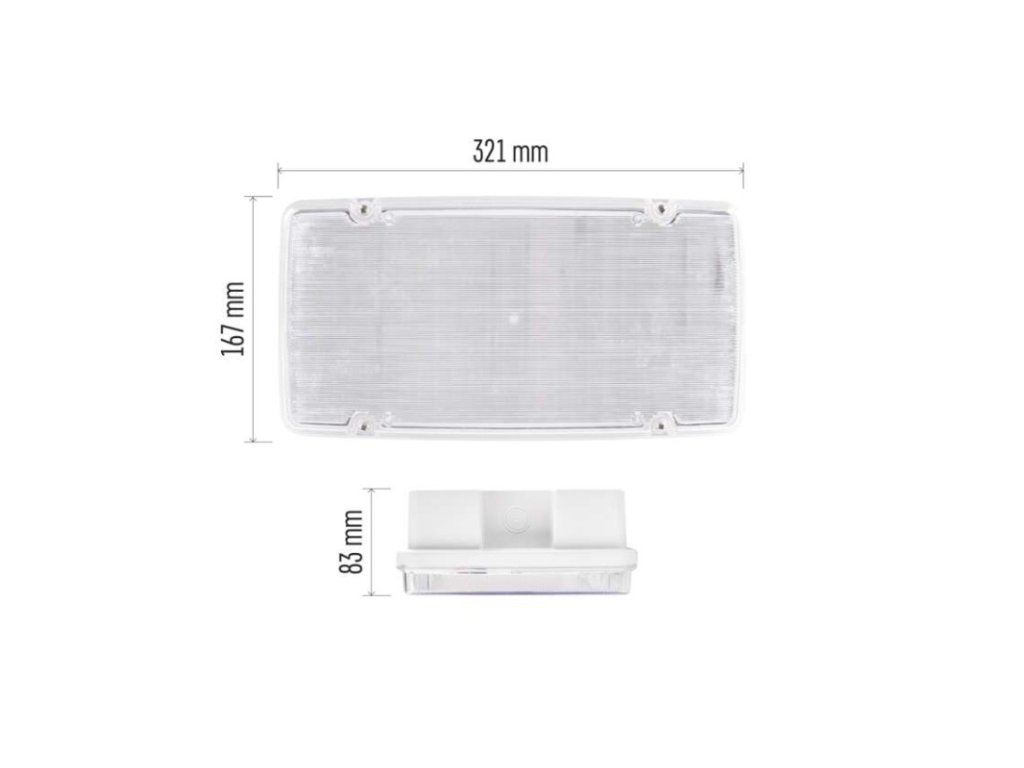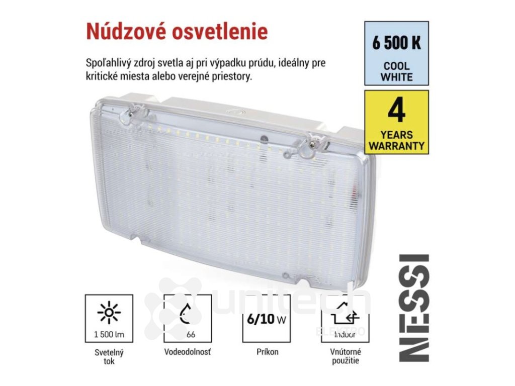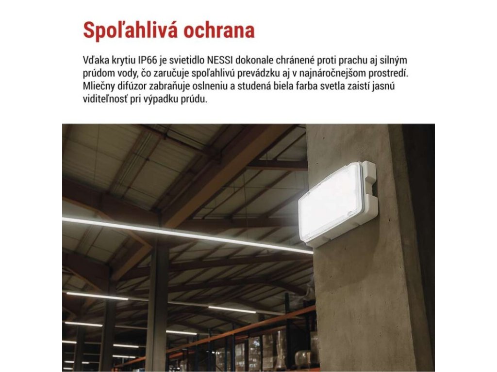 dĺžka zálohy: 3 h|doba nabíjania batérie: ≥ 24 hodín|farba svetla: studená biela|farba tela: biela|frekvencia napájacieho napätia: 50/60 Hz|kapacita batérie: 6 600 mAh|kontrolné vybavenie: autotest|krytie: IP66|materiál difúzora: plast (PC)|materiál tela: plast (ABS)|napájacie napätie: 220–240 V AC|predajný obal: 1 ks, krabica|prevádzkový režim: pohotovostný|príkon na vstupe: 6/10 W max.|rozmer: 321 × 167 × 83 mm|rozsah pracovných teplôt: 0 °C až +45 °C|stupeň ochrany proti mechanickým nárazom: IK08|svetelný tok: 1 500 lm|teplota chromatičnosti: 6 500 K|trieda ochrany: II|typ batérie: LiFePo4|typ montáže: prisadená|účinník: >0,5|vstupný prúd: 75 mA|výstupné napätie: neuvádza sa|výstupné napätie v núdzovom režime: neuvádza sa|výstupný výkon v núdzovom stave: 6/10 W|záručná doba: 4 roky|záruka na batériu: 2 roky|zdroj svetla: LEDDodatočné parametre