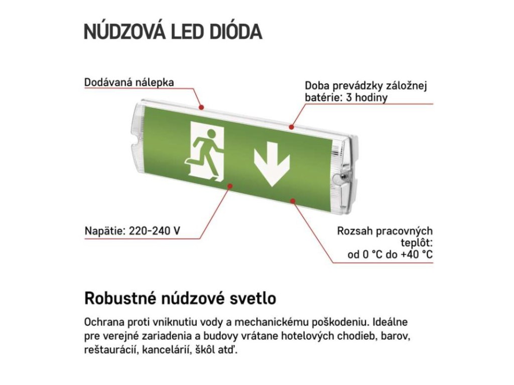 dĺžka zálohy: 3 h|doba nabíjania batérie: ≥ 24 hodín|farba svetla: studená biela|farba tela: biela|frekvencia napájacieho napätia: 50/60 Hz|kapacita batérie: 1 500 mAh|kontrolné vybavenie: manuálne tlačidlo|krytie: IP65|materiál difúzora: plast (PC)|materiál tela: plast (ABS)|napájacie napätie: 220–240 V AC|predajný obal: 1 ks, krabica|prevádzkový režim: trvalý/pohotovostny|príkon na vstupe: 3 W|rozmer: 351 × 111 × 63 mm|rozsah pracovných teplôt: 0 °C až +40 °C|stupeň ochrany proti mechanickým nárazom: IK08|svetelný tok: 150 lm|teplota chromatičnosti: 6 500 K|trieda ochrany: II|typ batérie: LiFePo4|typ montáže: prisadená|účinník: >0,5|vstupný prúd: 18 mA|výstupné napätie: 10–72 V DC|výstupné napätie v núdzovom režime: 10–50 V DC, konštantný prúd|výstupný výkon v núdzovom stave: 3 W|záručná doba: 4 roky|záruka na batériu: 2 roky|zdroj svetla: LEDDodatočné parametre