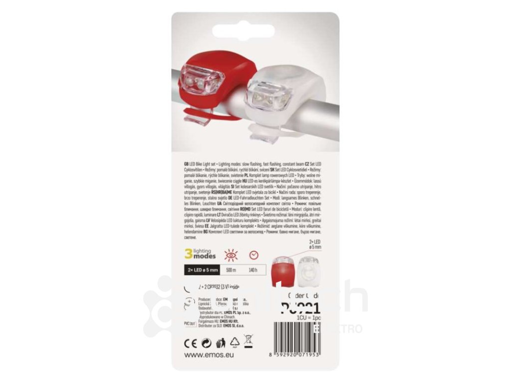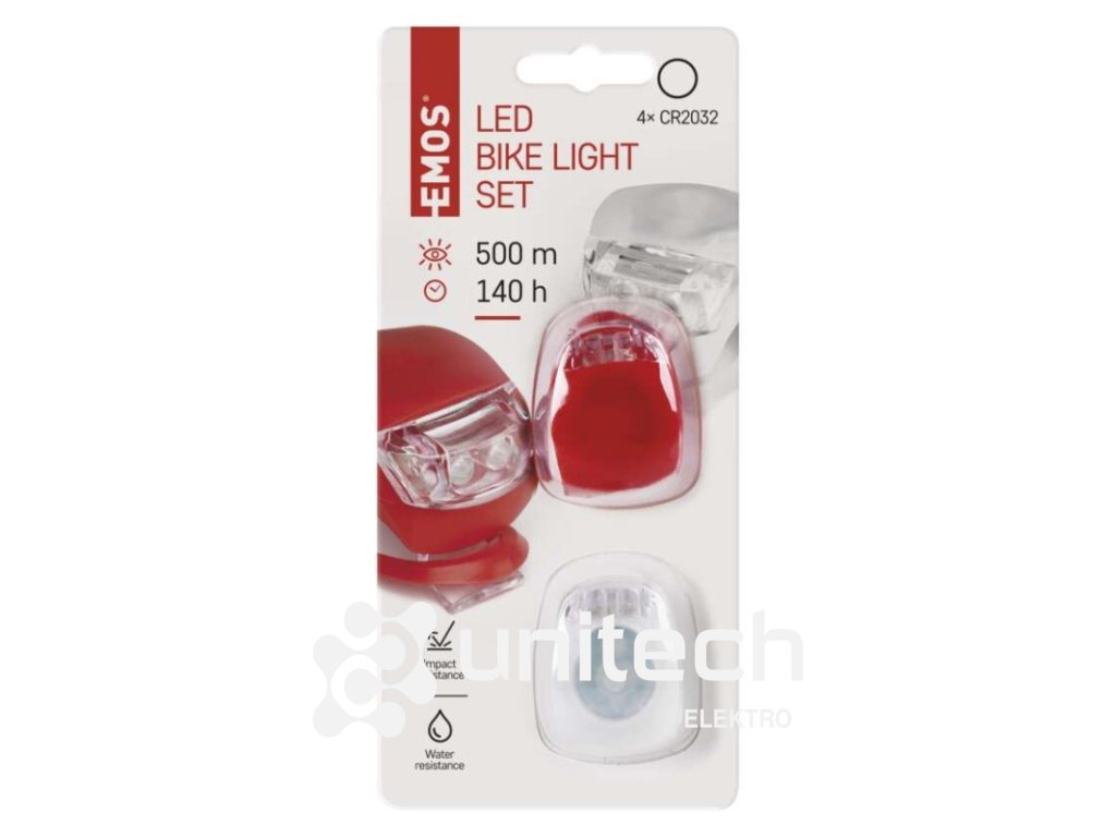 batérie súčasťou balenia: áno|doba nabíjania: neuvádza sa|doba svietenia: 140 h|doba svietenia detail: 140 h (blikanie)|dosvit: LED 100 % – 13 m|farba: červená, biela|fokus: nie|hmotnosť: neuvádza sa|LED indikácia nabíjania: neuvádza sa|LED indikácia stavu akumulátora: neuvádza sa|materiál: silikón/plast|maximálny dosvit: 13 m|maximálny svetelný tok: 10 lm|nabíjací: nie|napájanie: 2× 2 CR2032|nárazuvzdornosť: áno|počet režimov svietenia: 3|predajný obal: 1 ks, blister|príslušenstvo: držiak na bicykel|režimy: bliká pomaly, bliká rýchlo, svieti|rozmer: 90 × 29 × 25 mm|špeciálna funkcia: neuvádza sa|svetelný tok: LED 100 % – 10 lm|typ batérie: CR2032 (3 V)|typ napájacieho konektoru: neuvádza sa|vodeodolná: áno (IP43)|vybavenie: neuvádza sa|záručná doba: 2 roky|zdroj svetla: 2× LED biela, 2× LED červená|značka: EMOSDodatočné parametre
